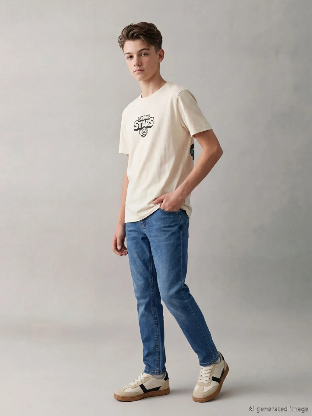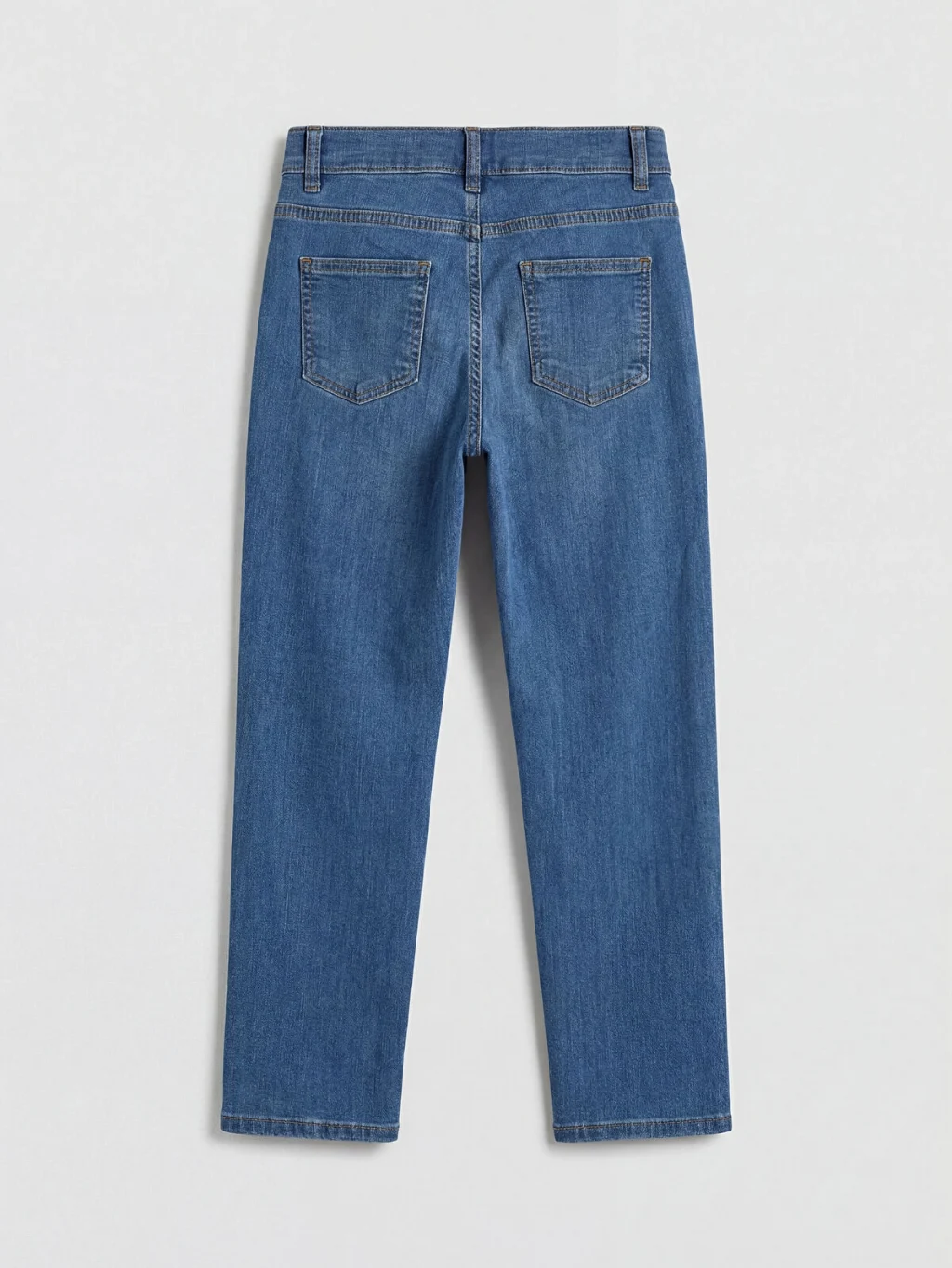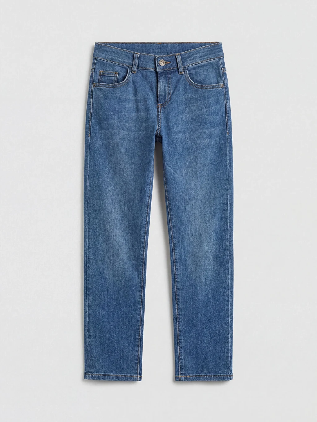 Erkek çocuk jean pantolon, pamuklu denim kumaştan üretilmiştir. Beş cepli tasarıma sahiptir ve fermuar ile düğme kapamalıdır.