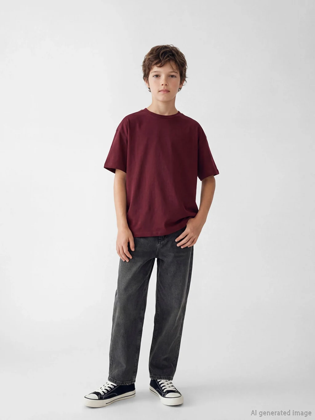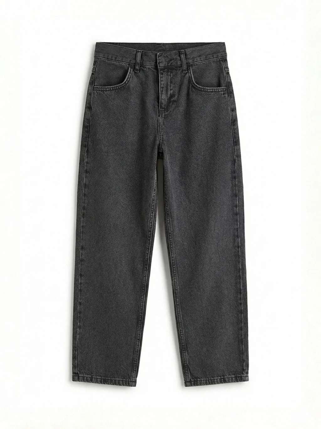 Bol kalıplı erkek çocuk jean pantolon, pamuklu denim kumaştan üretilmiştir. Fermuar ve düğme kapamalıdır.