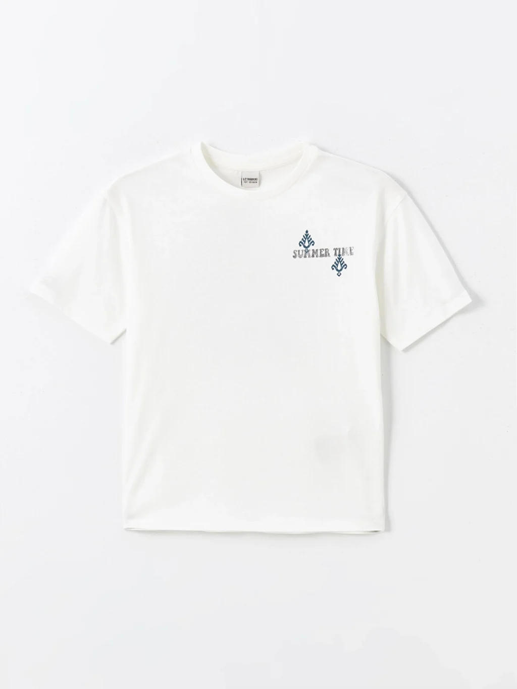 %100 pamuklu penye kumaştan üretilen bisiklet yaka ve kısa kollu kız çocuk tişört, önü baskılı bir tasarıma sahiptir.