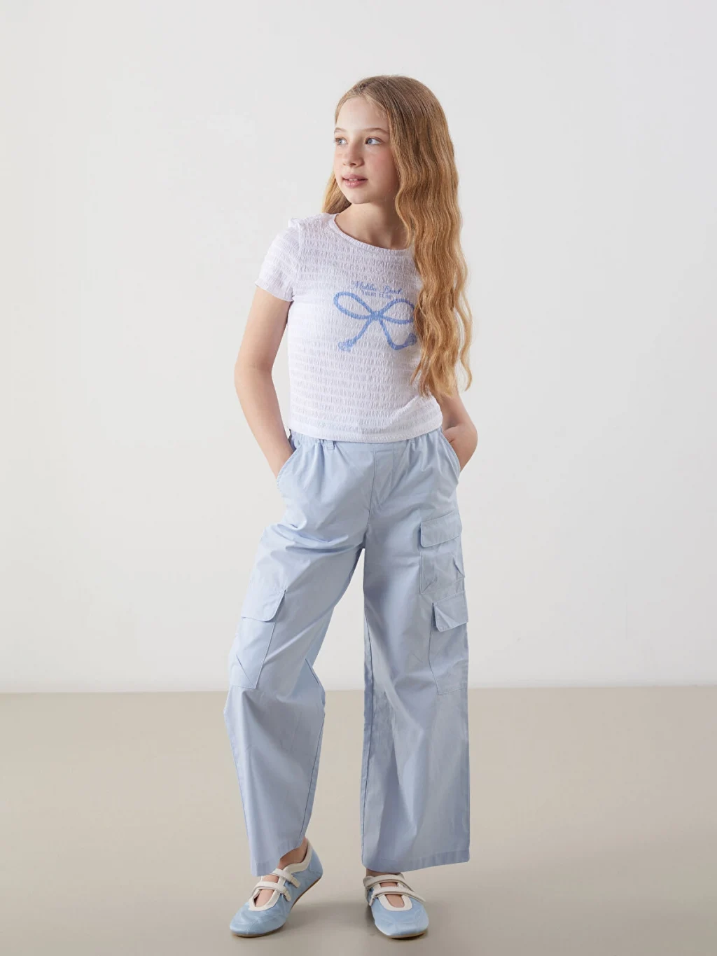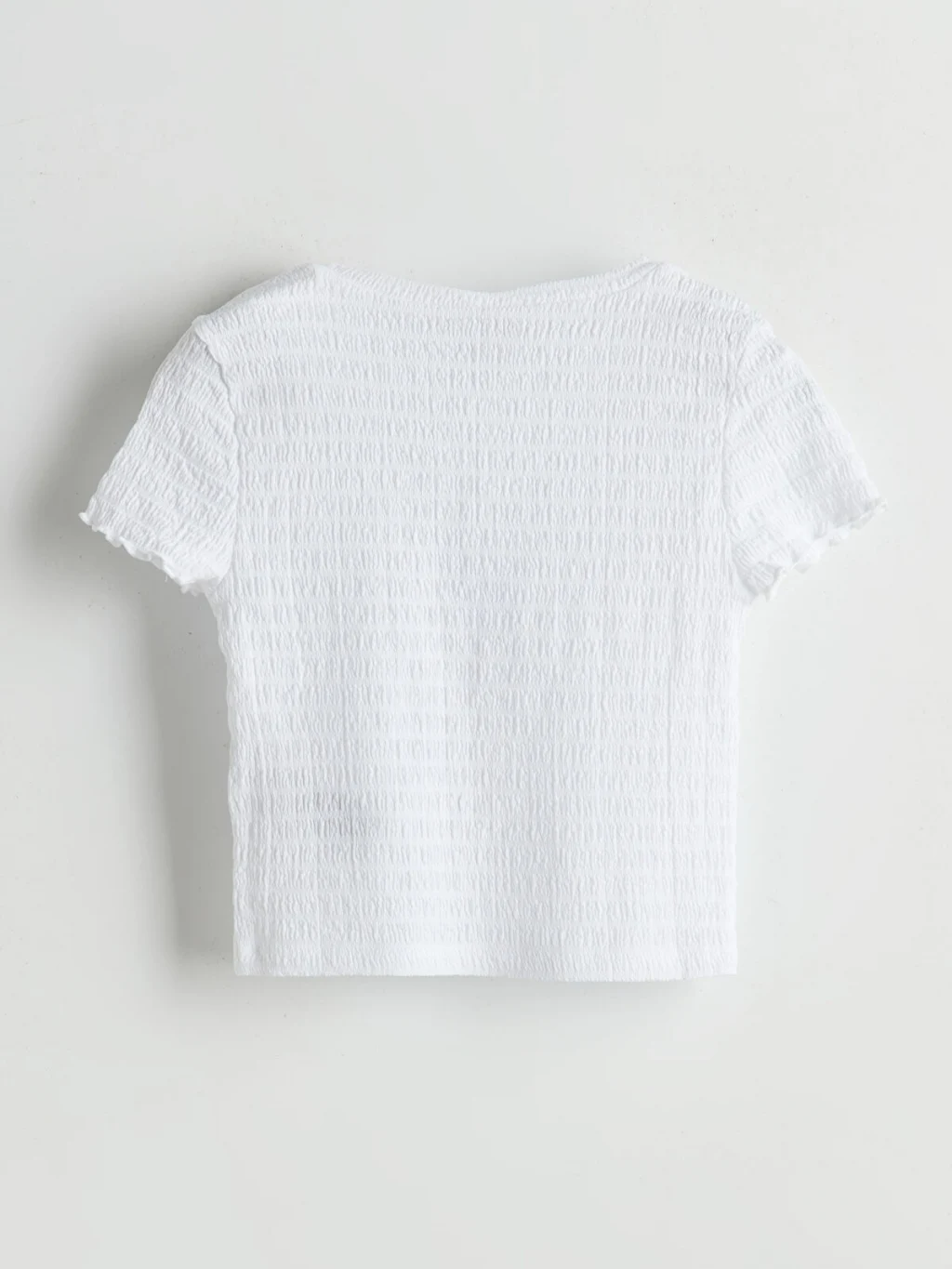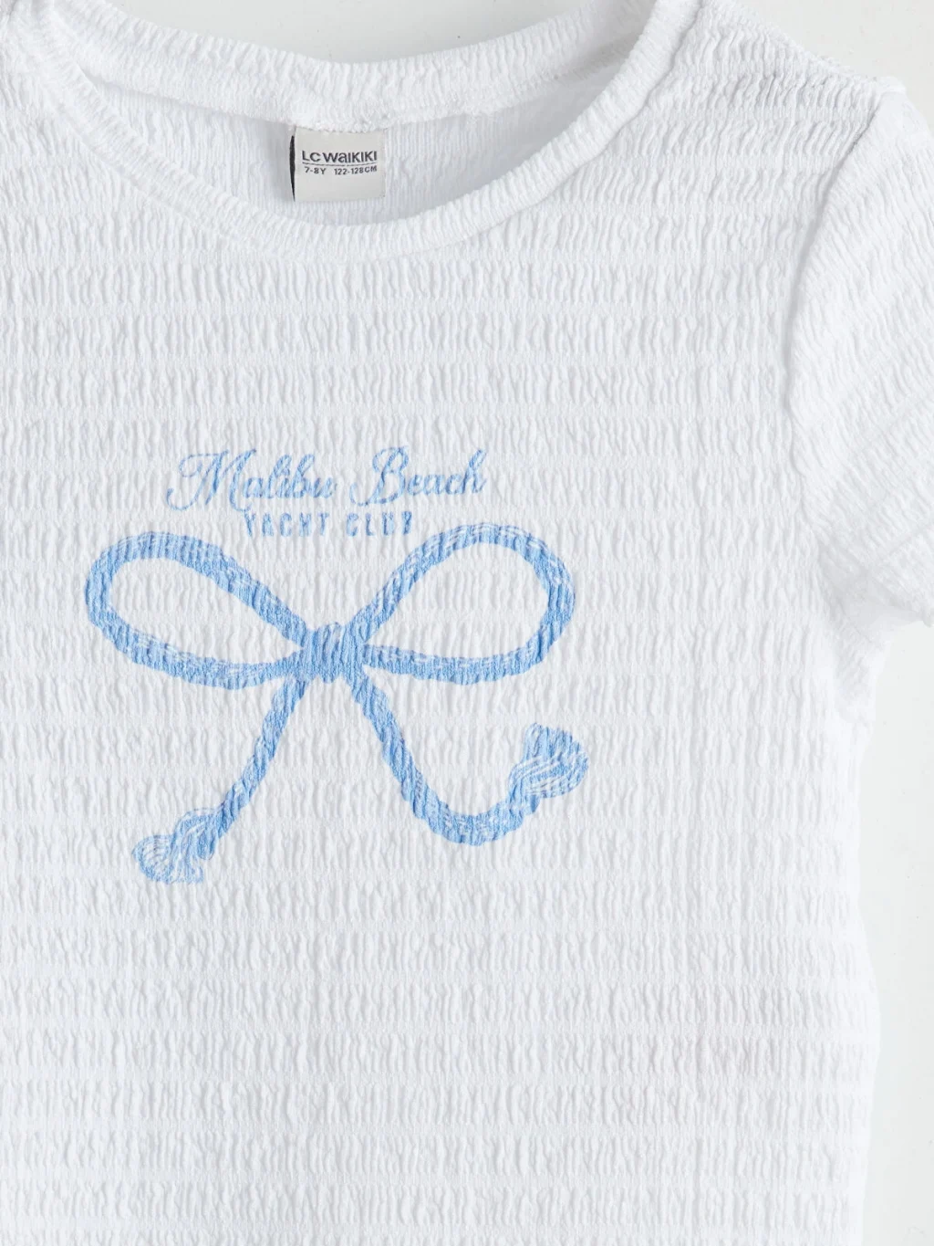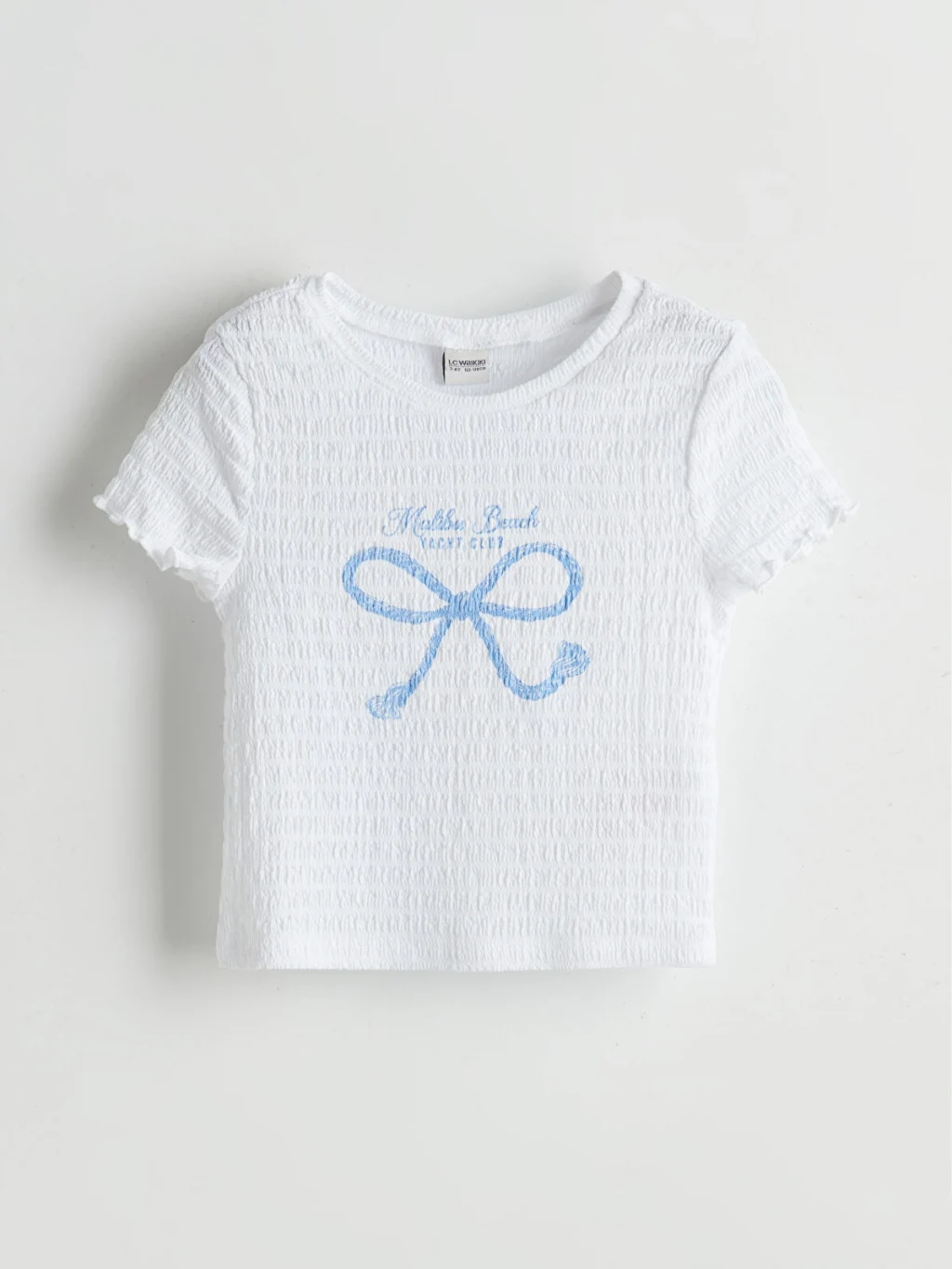Dar kalıplı kız çocuk tişört, gofre kumaştan üretilmiştir. Bisiklet yaka, önü baskılı ve kol ucu fırfırlı kısa kollu tasarıma sahiptir.