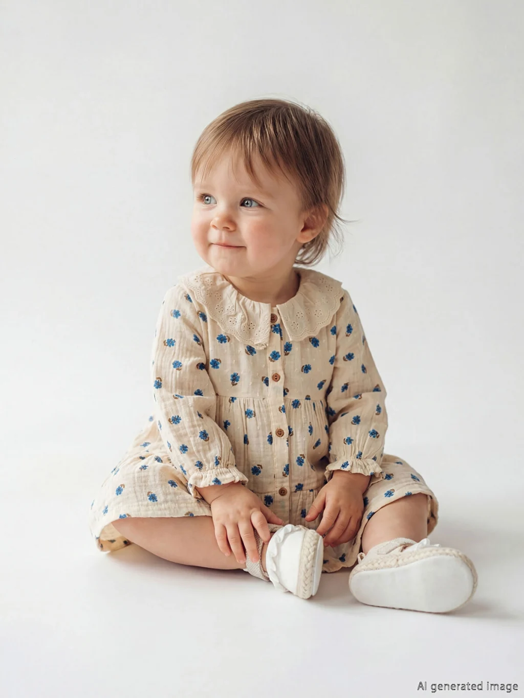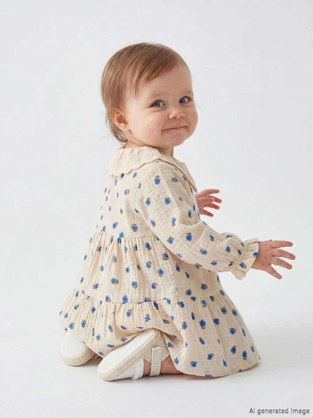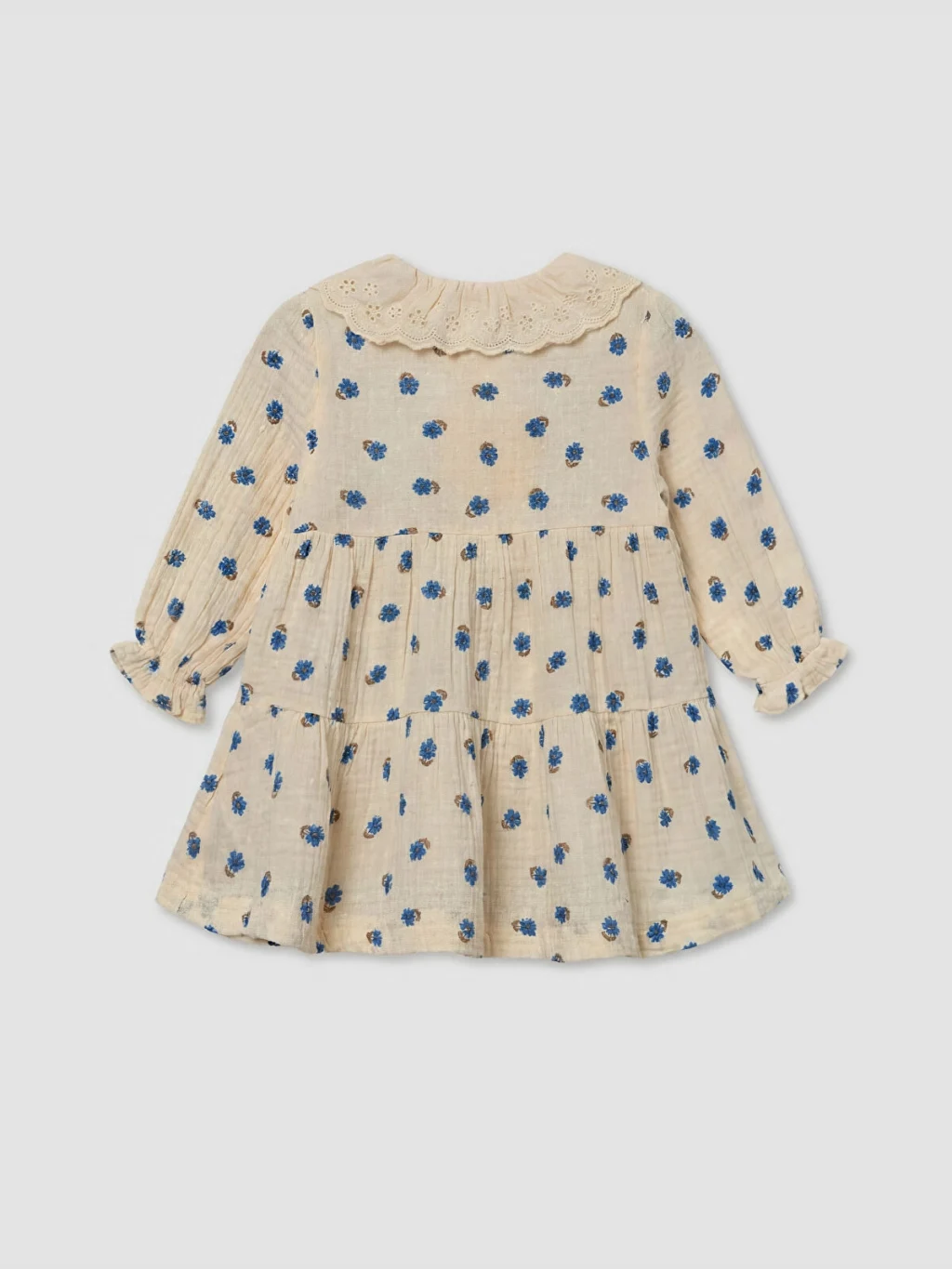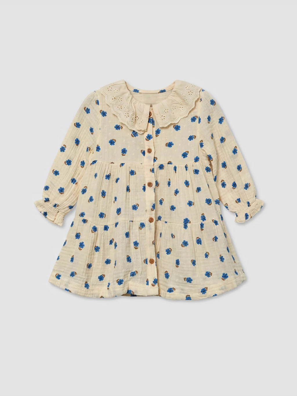 Desenli, bebe yakalı ve uzun kollu kız bebek elbise, %100 pamuk müslin kumaştan üretilmiştir. Önden düğme kapamalıdır.