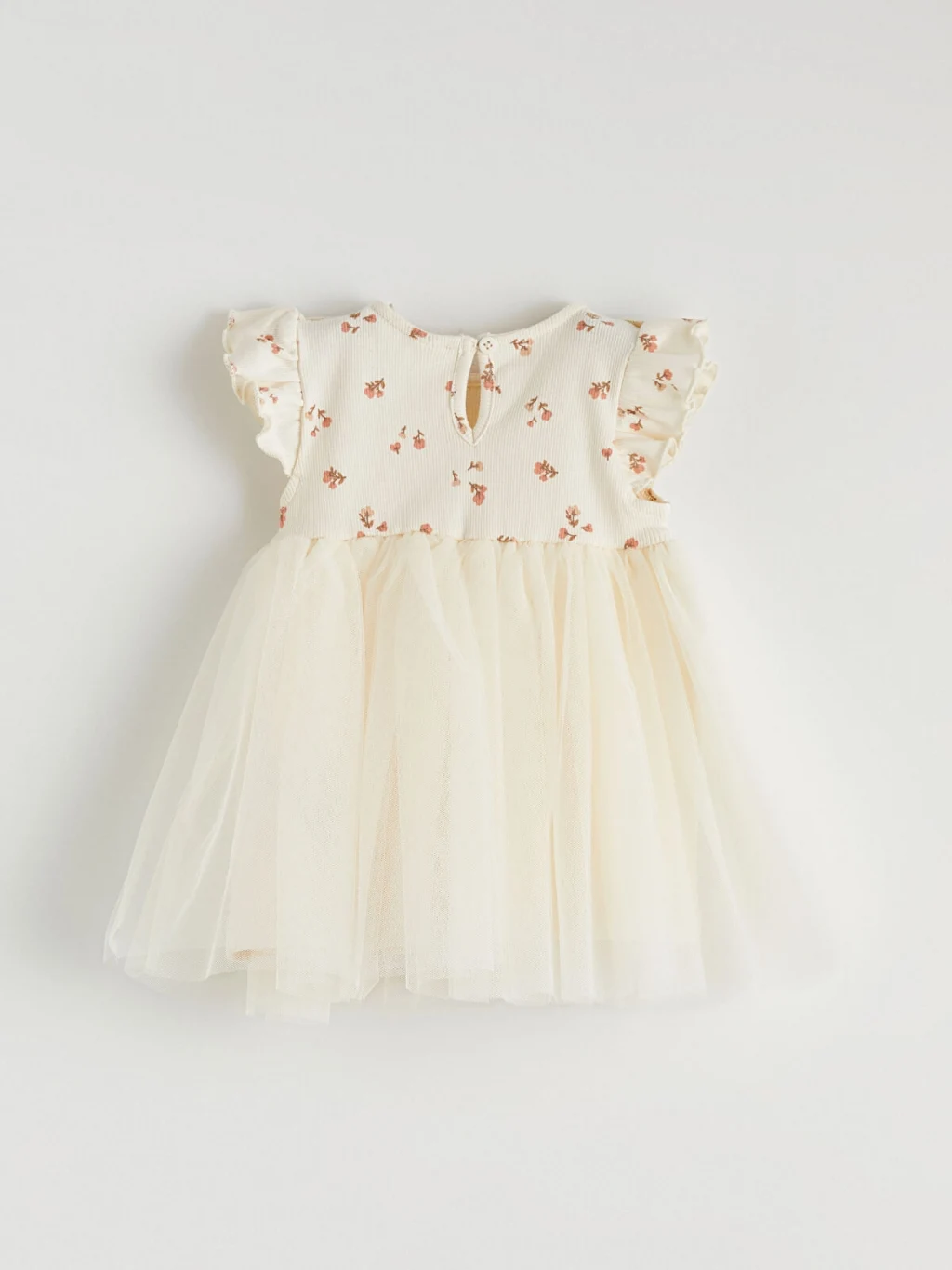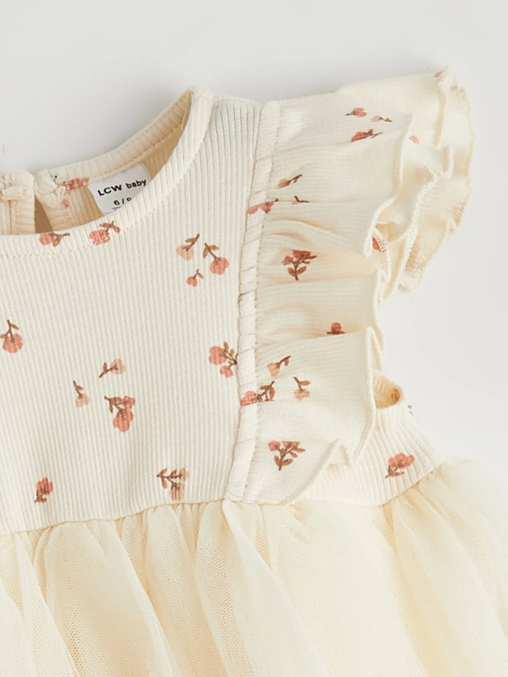 Bisiklet yaka, kısa kollu ve fırfır detaylı kız bebek elbise, desenli üst parçaya ve tül eteğe sahiptir. Enseden düğme kapamalıdır. %100 Pamuk.