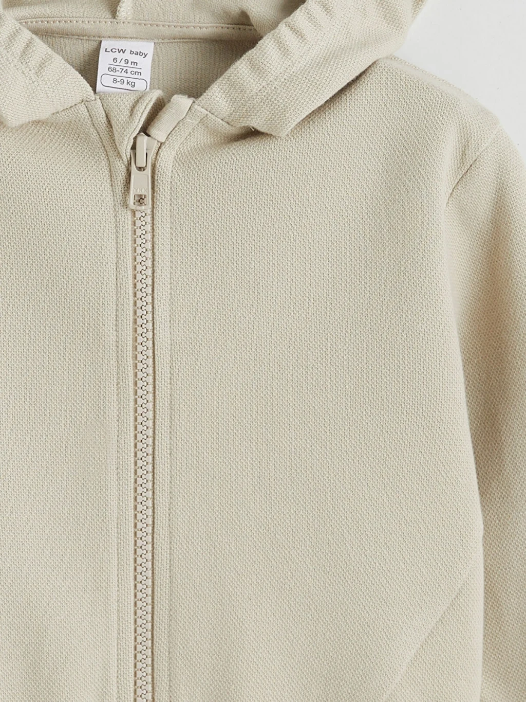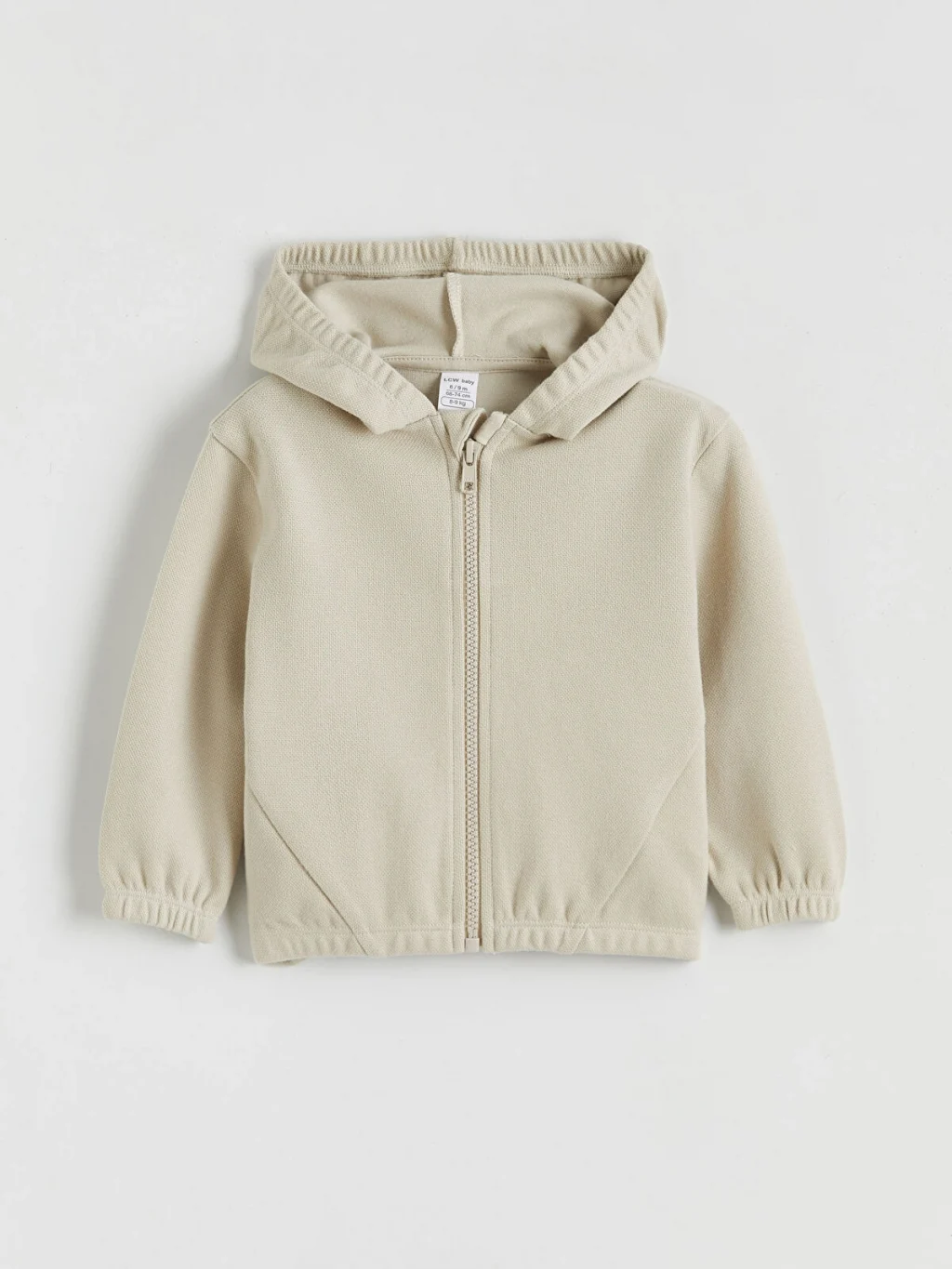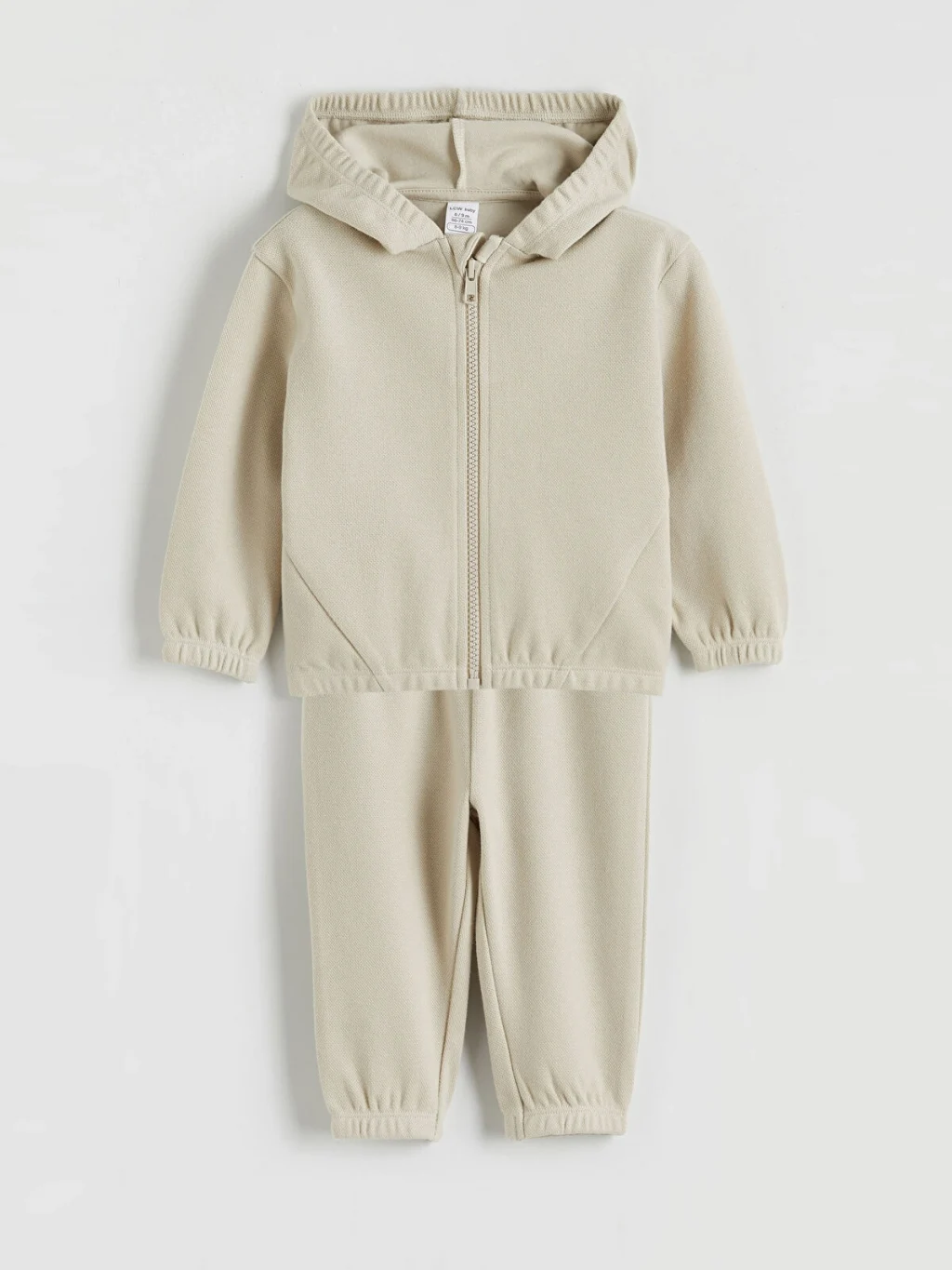 Erkek bebek eşofman takımı; kapüşonlu, fermuarlı, kol ve paça uçları lastikli sweatshirt ve eşofman altından oluşur.