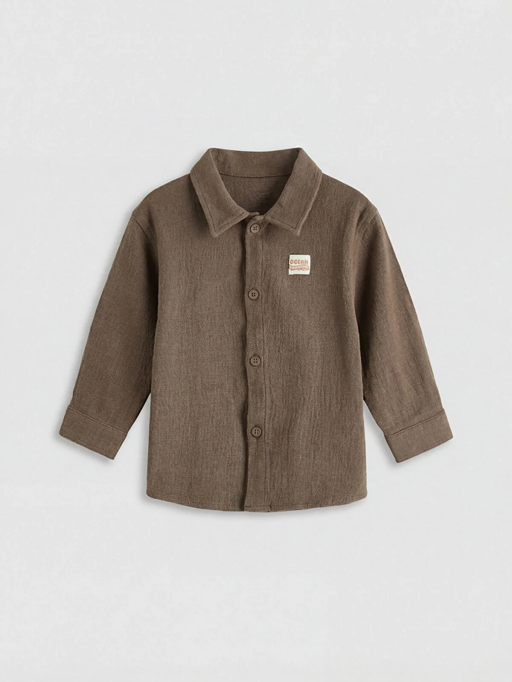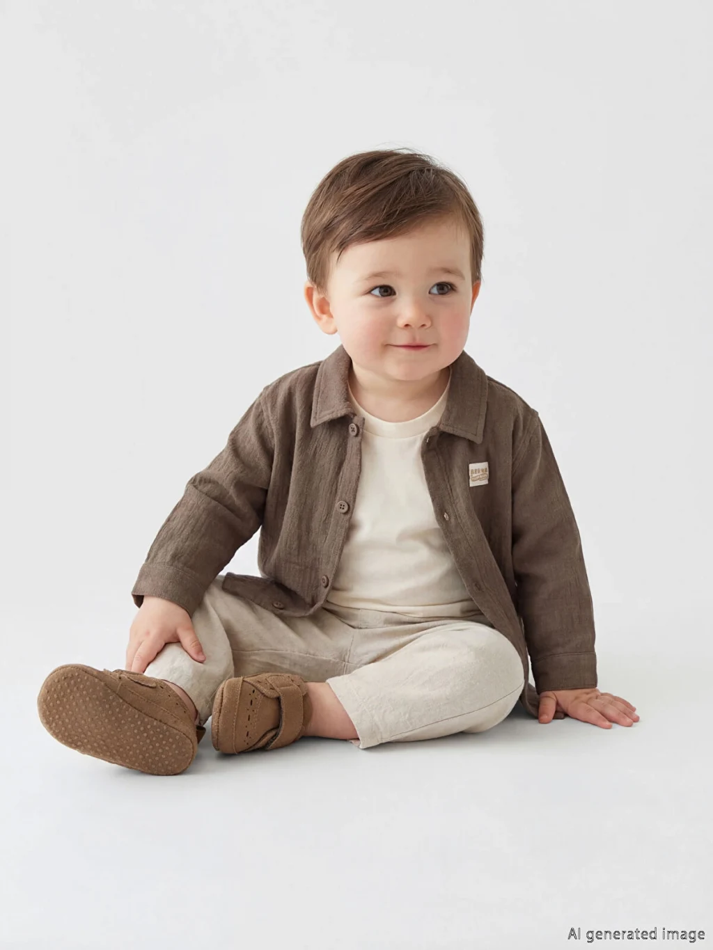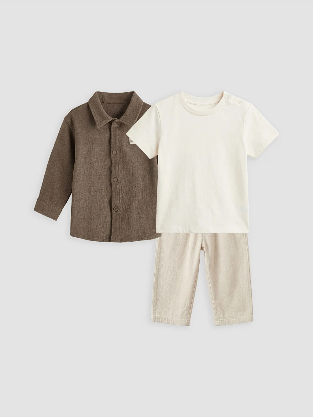 Erkek bebek takım, uzun kollu ve düğme kapamalı gömlek, bisiklet yaka, omuzdan çıtçıt kapamalı kısa kollu tişört ve pantolondan oluşur.