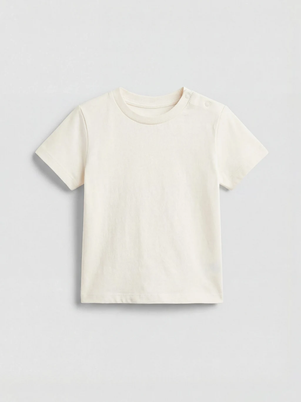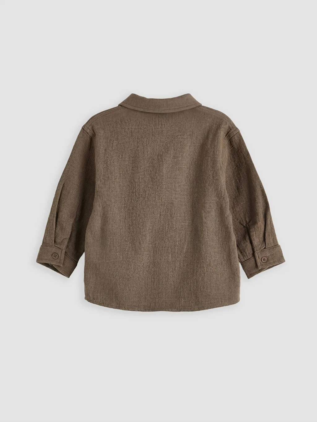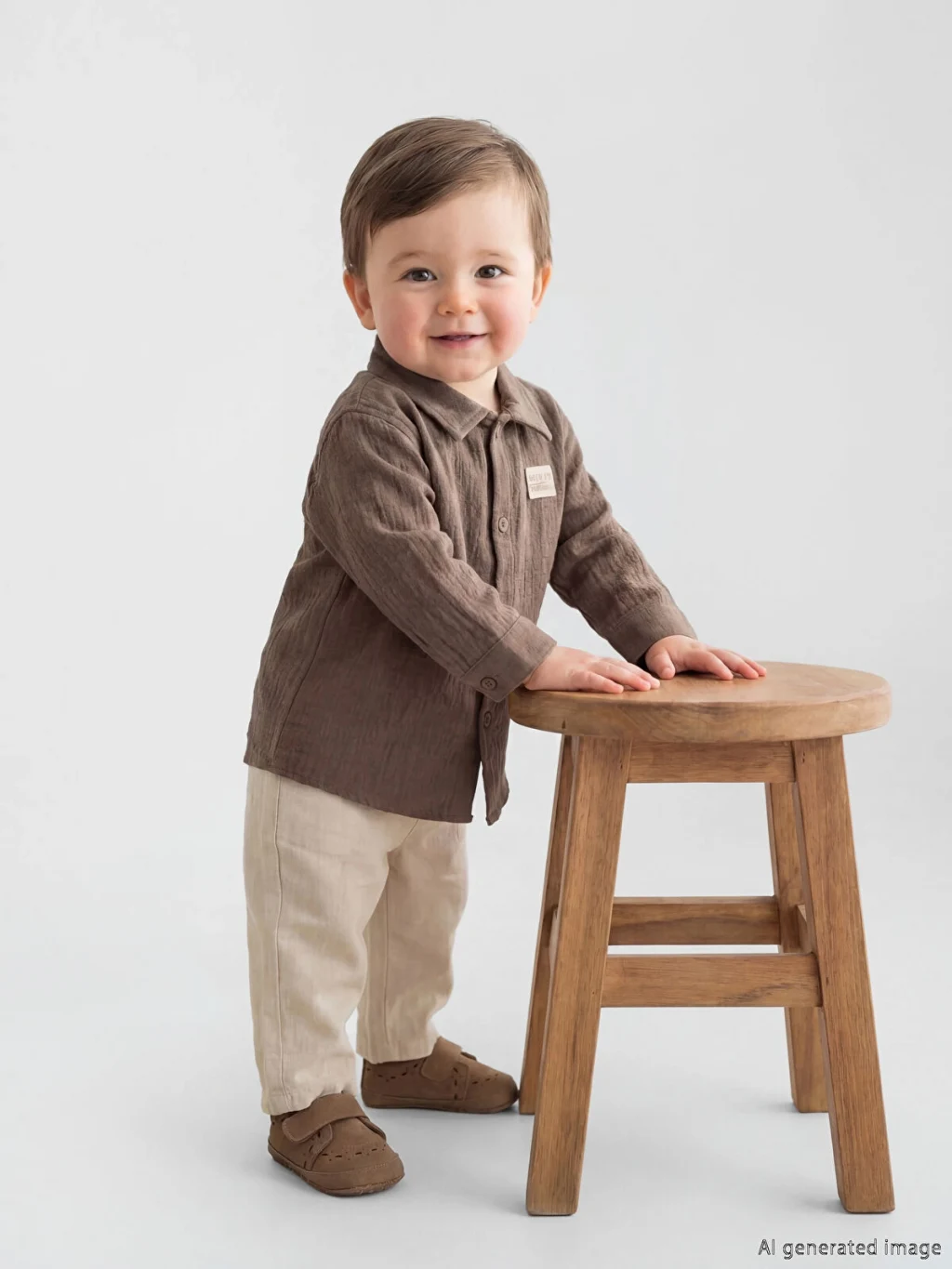 Erkek bebek takım, uzun kollu ve düğme kapamalı gömlek, bisiklet yaka, omuzdan çıtçıt kapamalı kısa kollu tişört ve pantolondan oluşur.