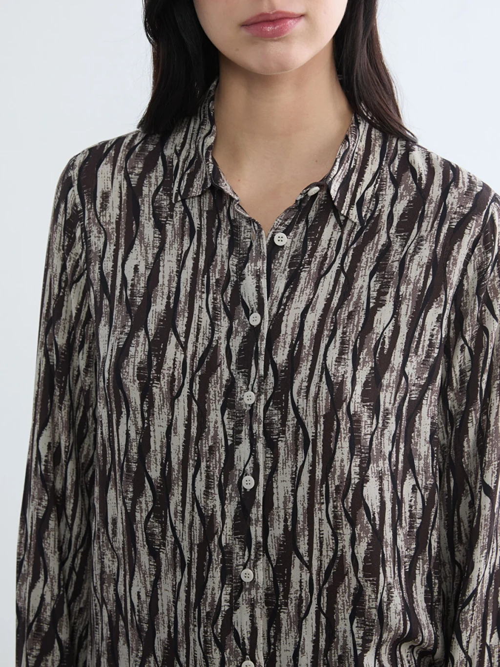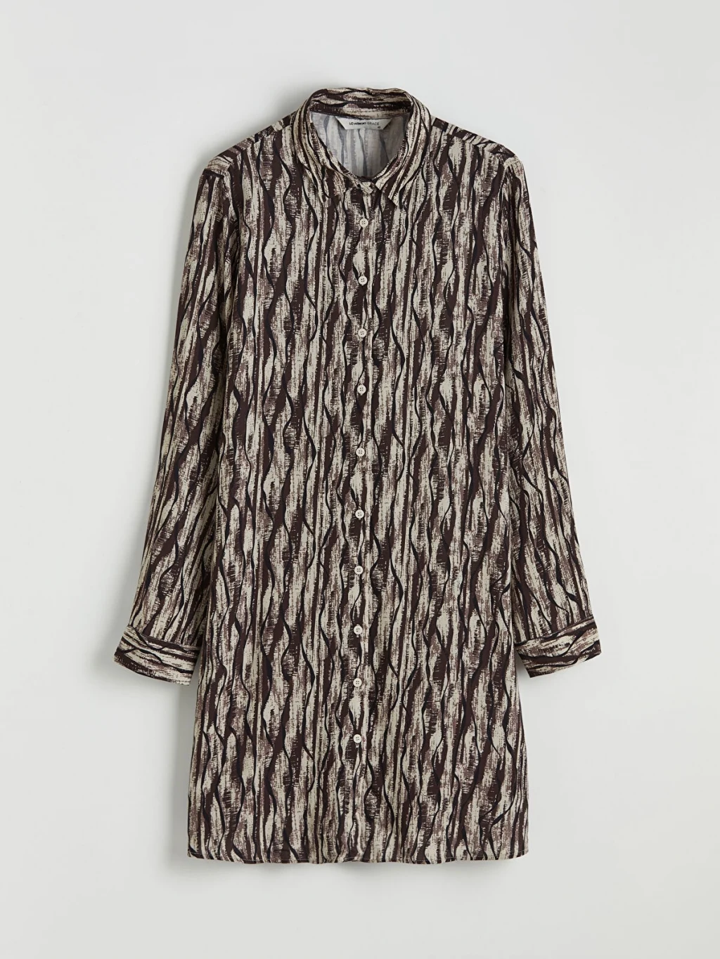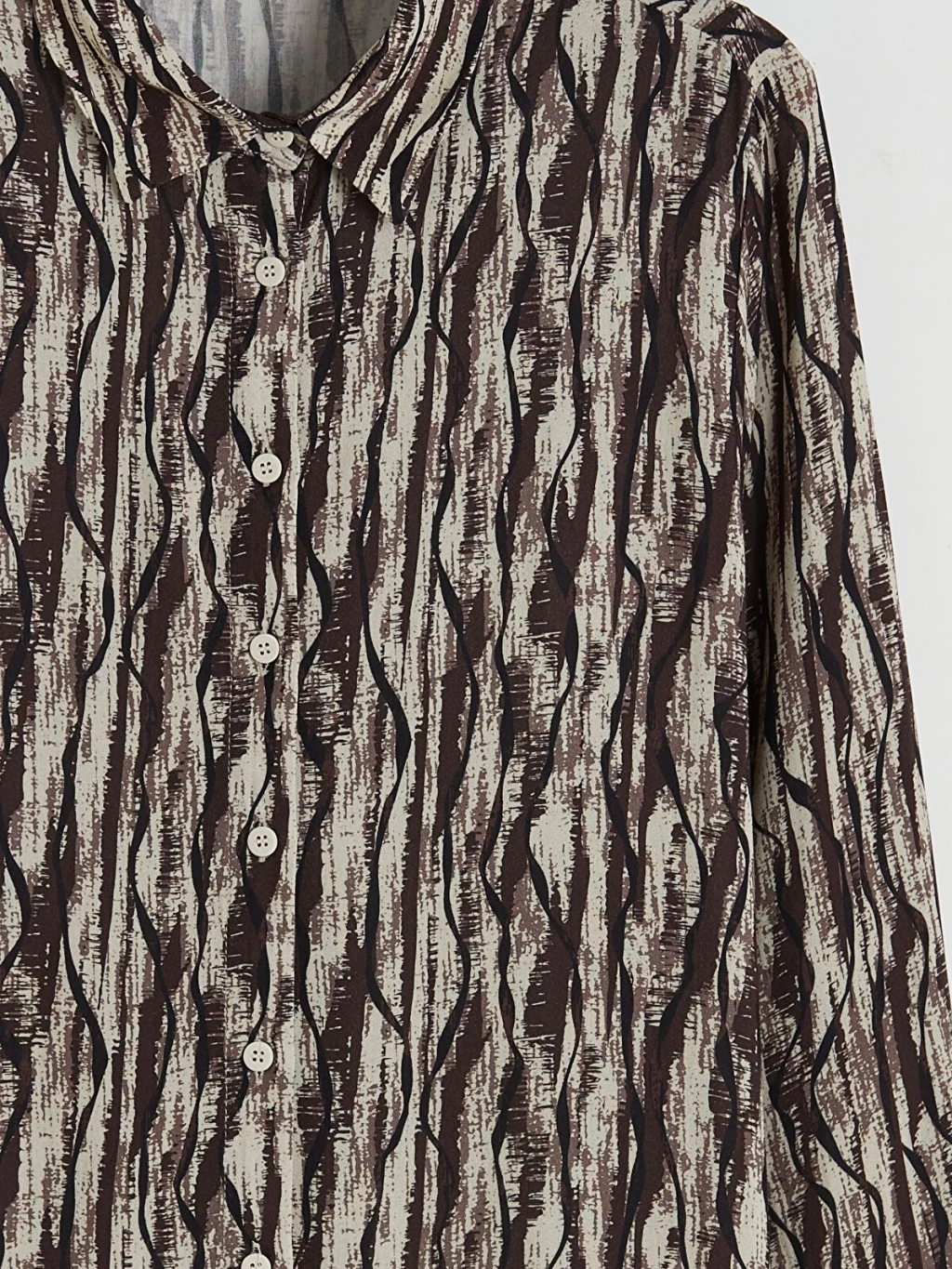 Kadın tunik, uzun kollu ve desenli bir tasarıma sahiptir. Klasik yaka kesimli olup önü boyunca düğme ile kapanmaktadır.