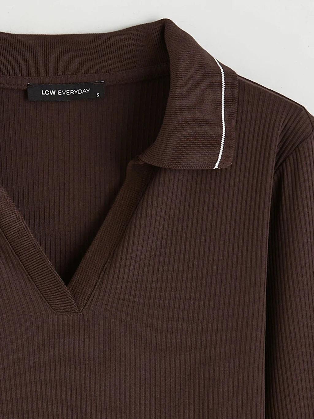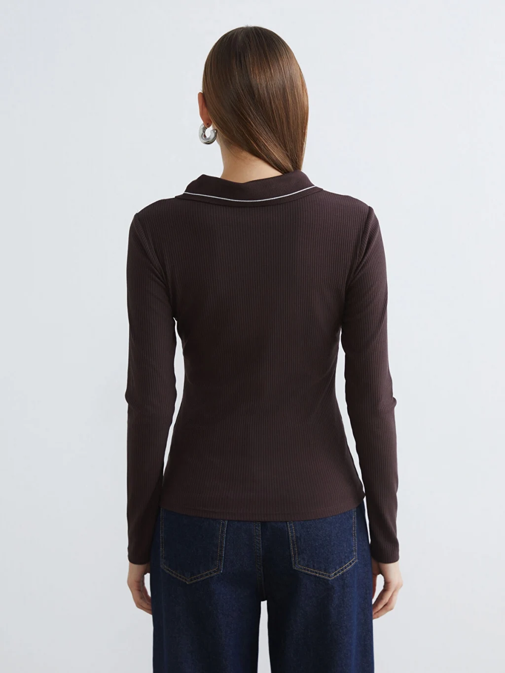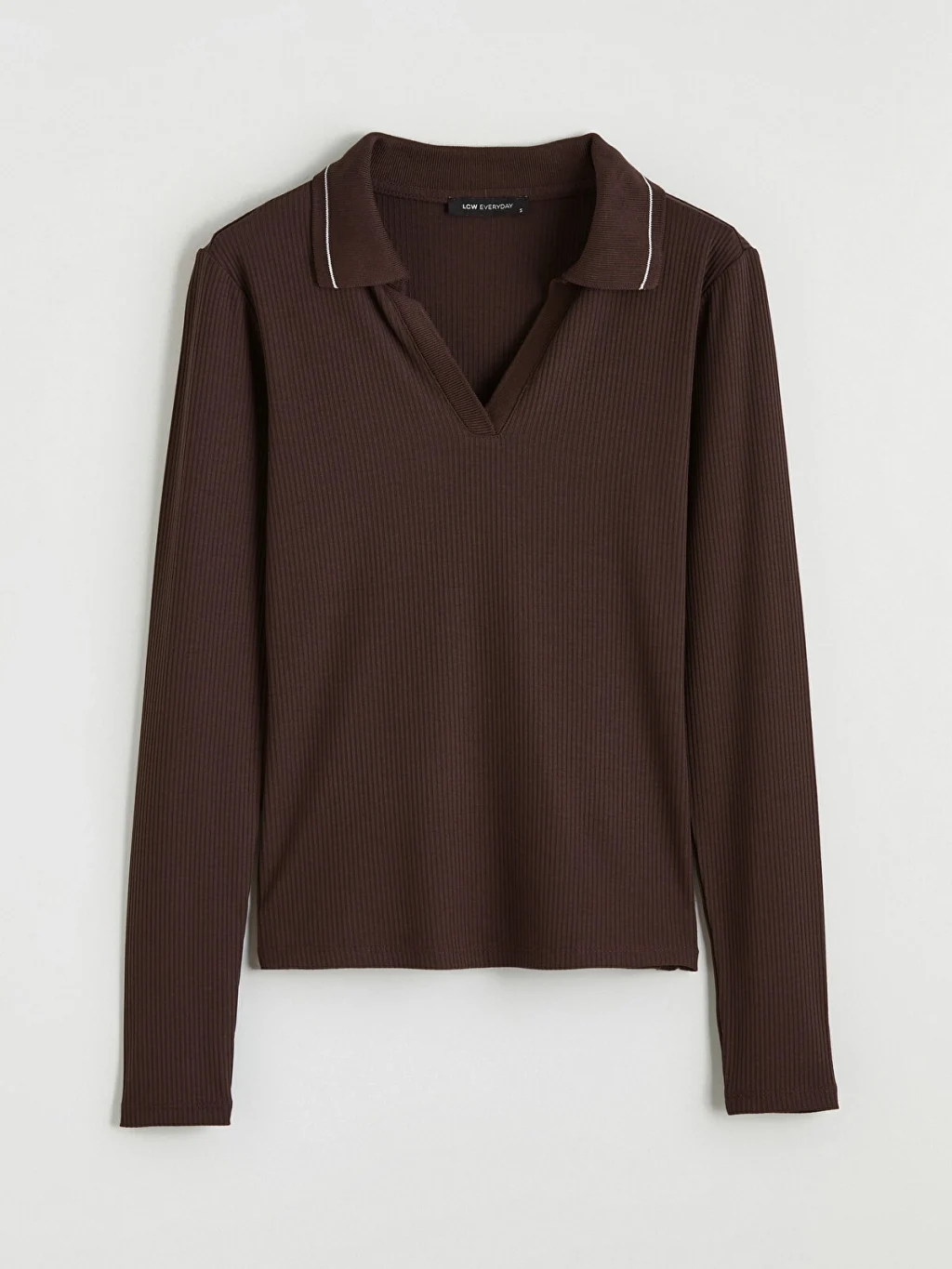 Polo yakalı ve uzun kollu kadın tişört, dar kalıplıdır. Fitilli kumaştan üretilmiştir ve yaka kenarı biye detaylıdır.