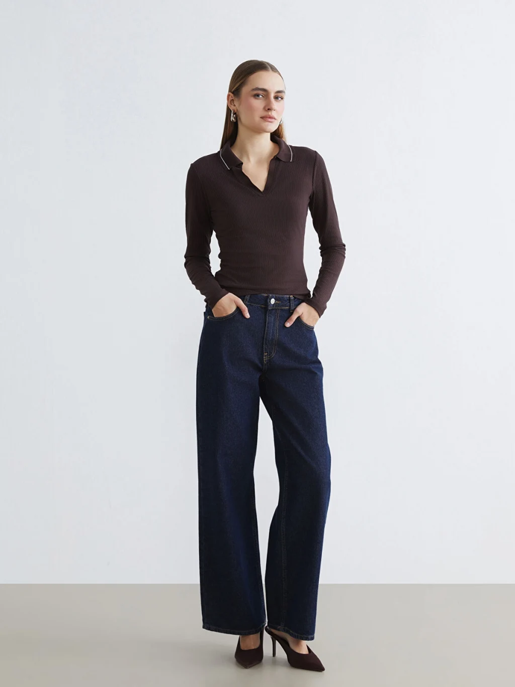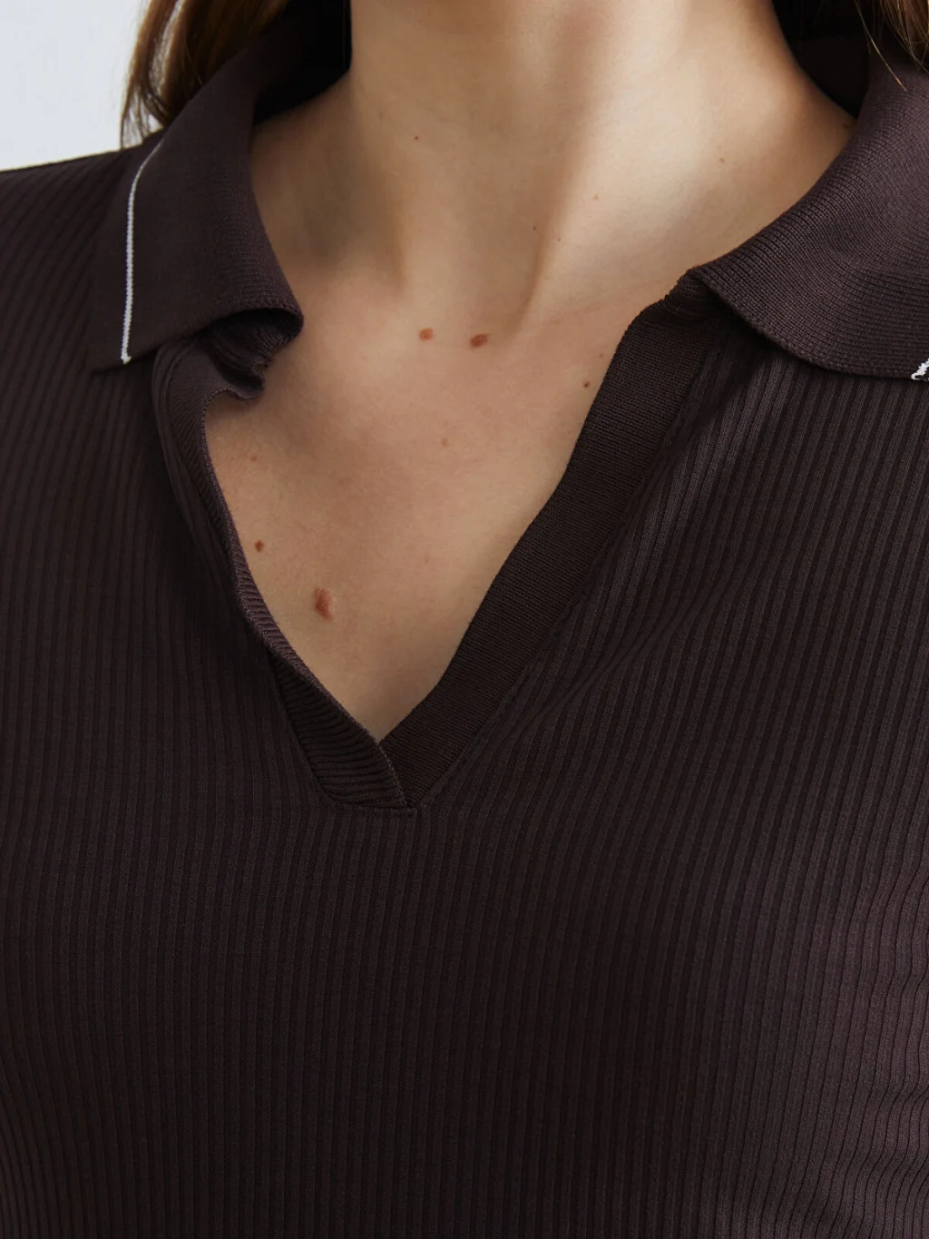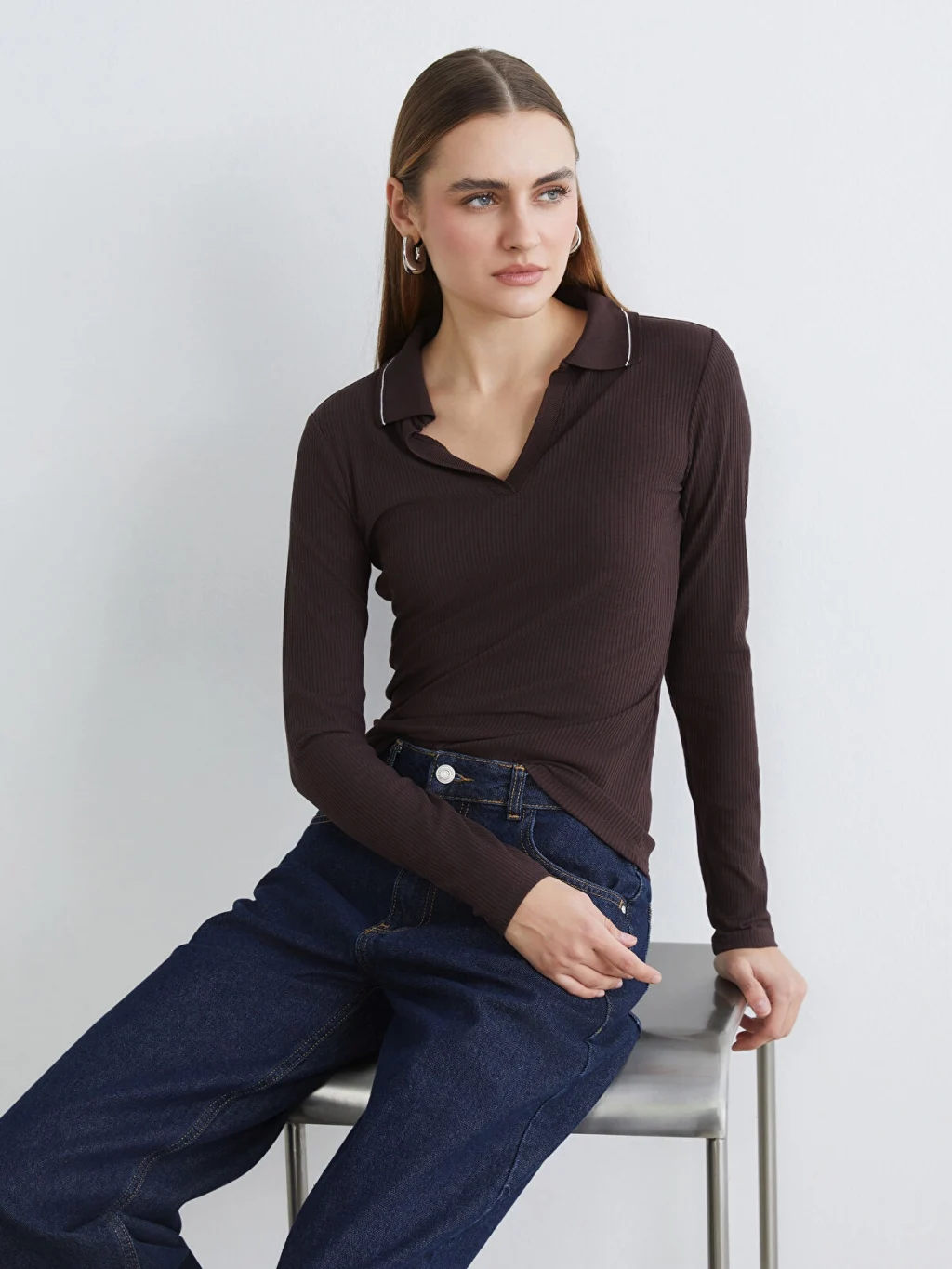 Polo yakalı ve uzun kollu kadın tişört, dar kalıplıdır. Fitilli kumaştan üretilmiştir ve yaka kenarı biye detaylıdır.