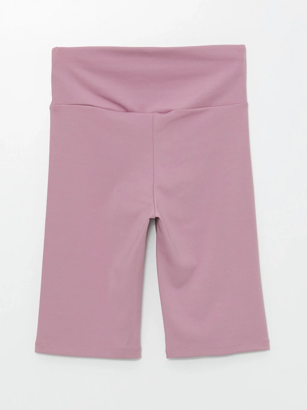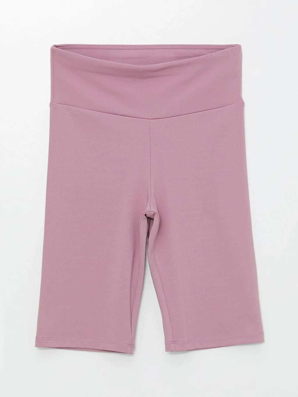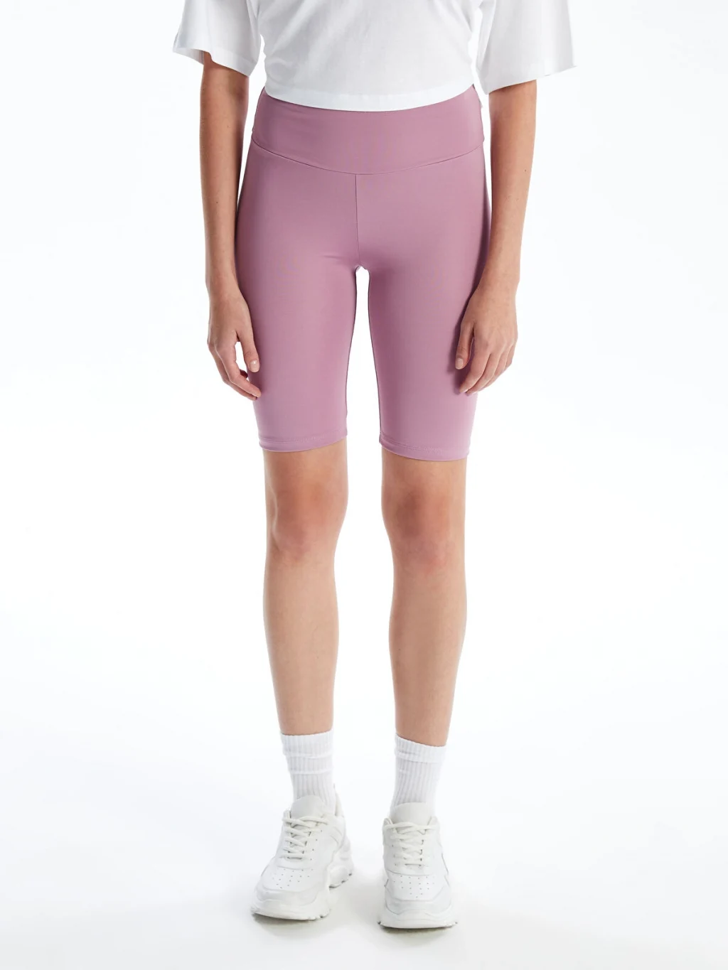 Geniş elastik bel bandına sahip, yüksek belli kadın şort tayt, düz kumaştan üretilmiştir ve diz üstü boydadır.