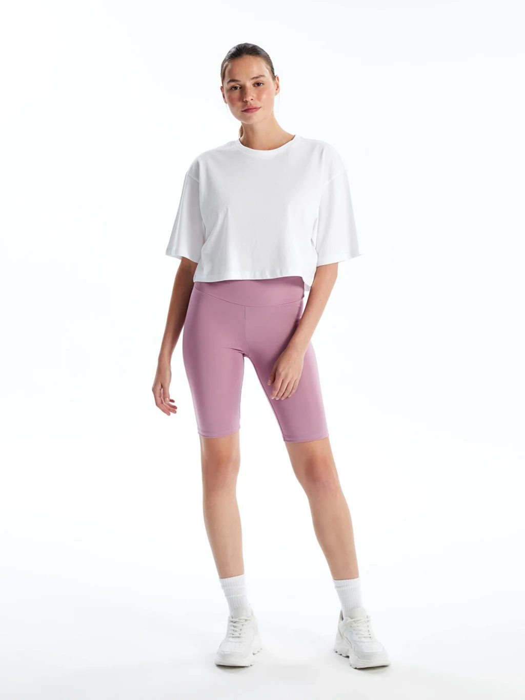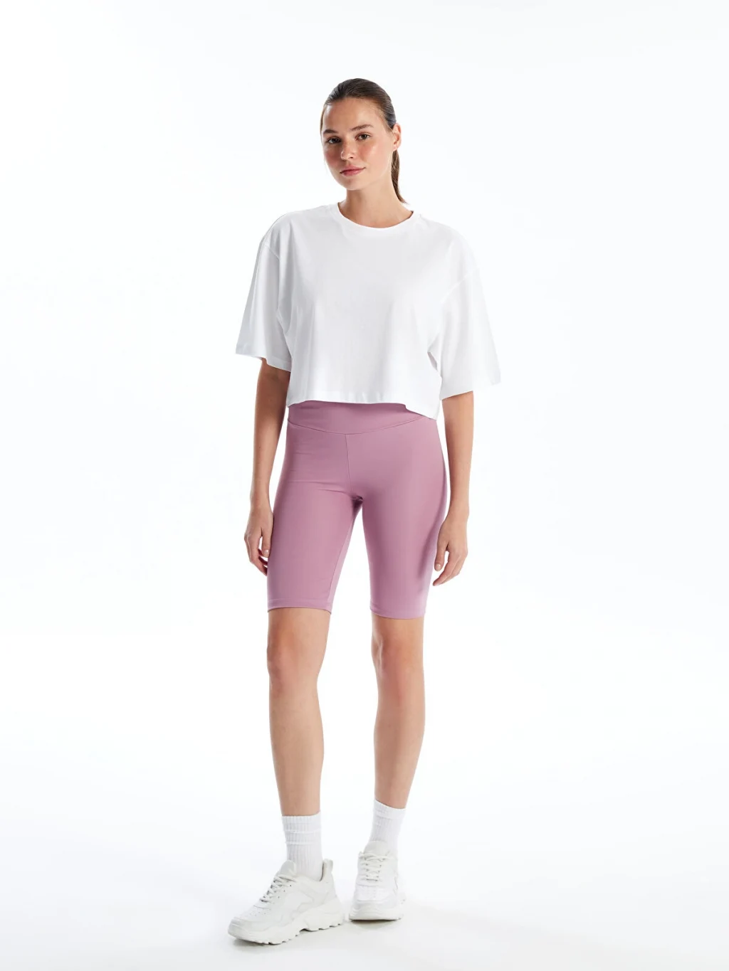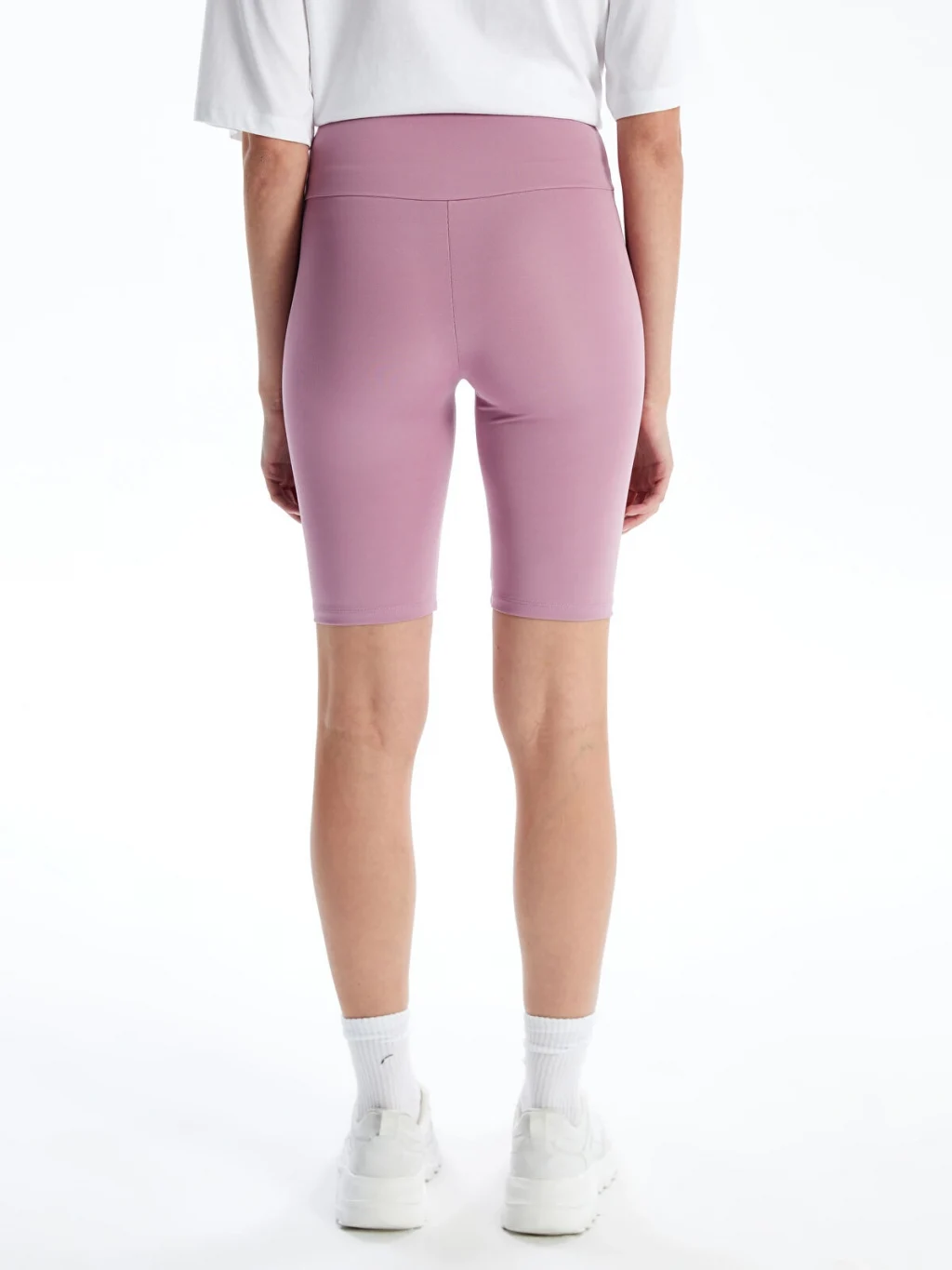 Geniş elastik bel bandına sahip, yüksek belli kadın şort tayt, düz kumaştan üretilmiştir ve diz üstü boydadır.