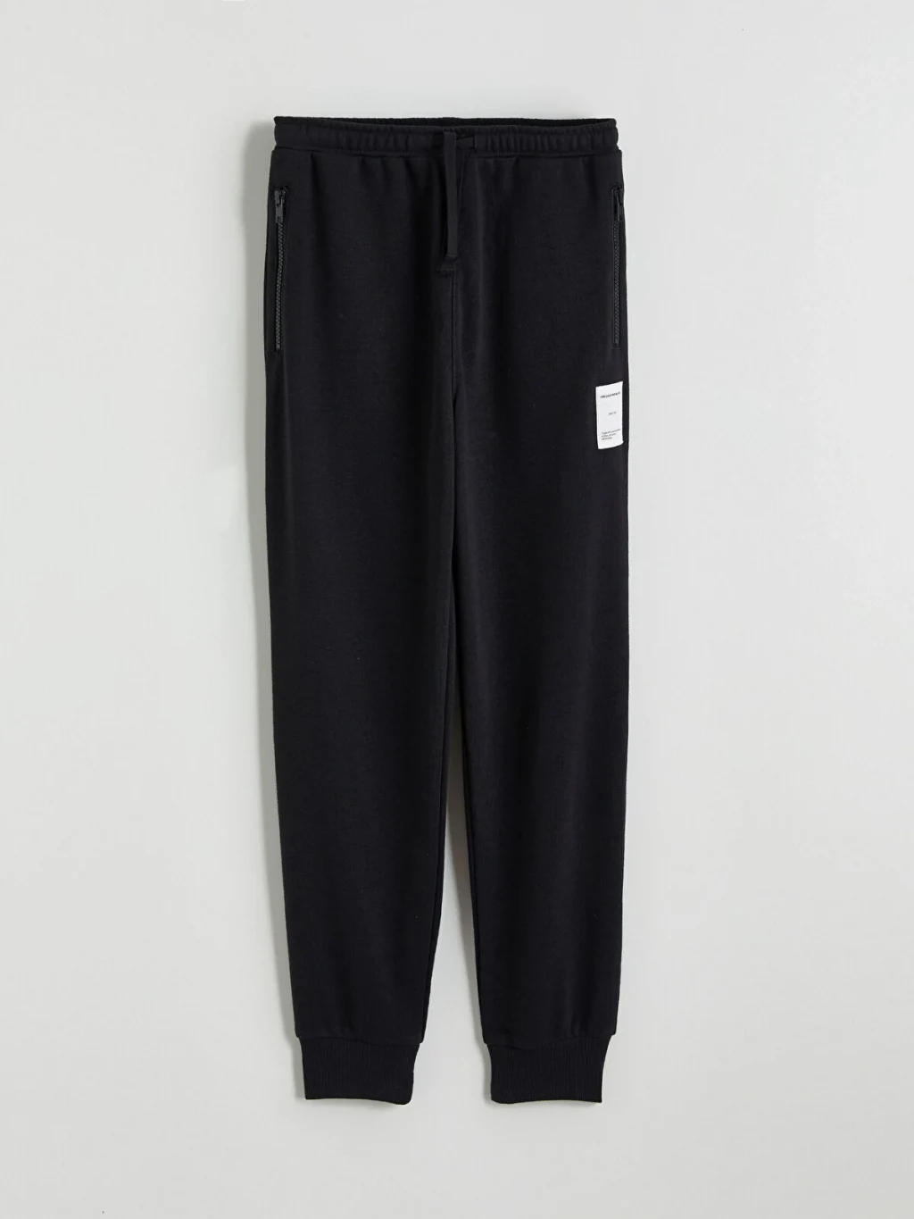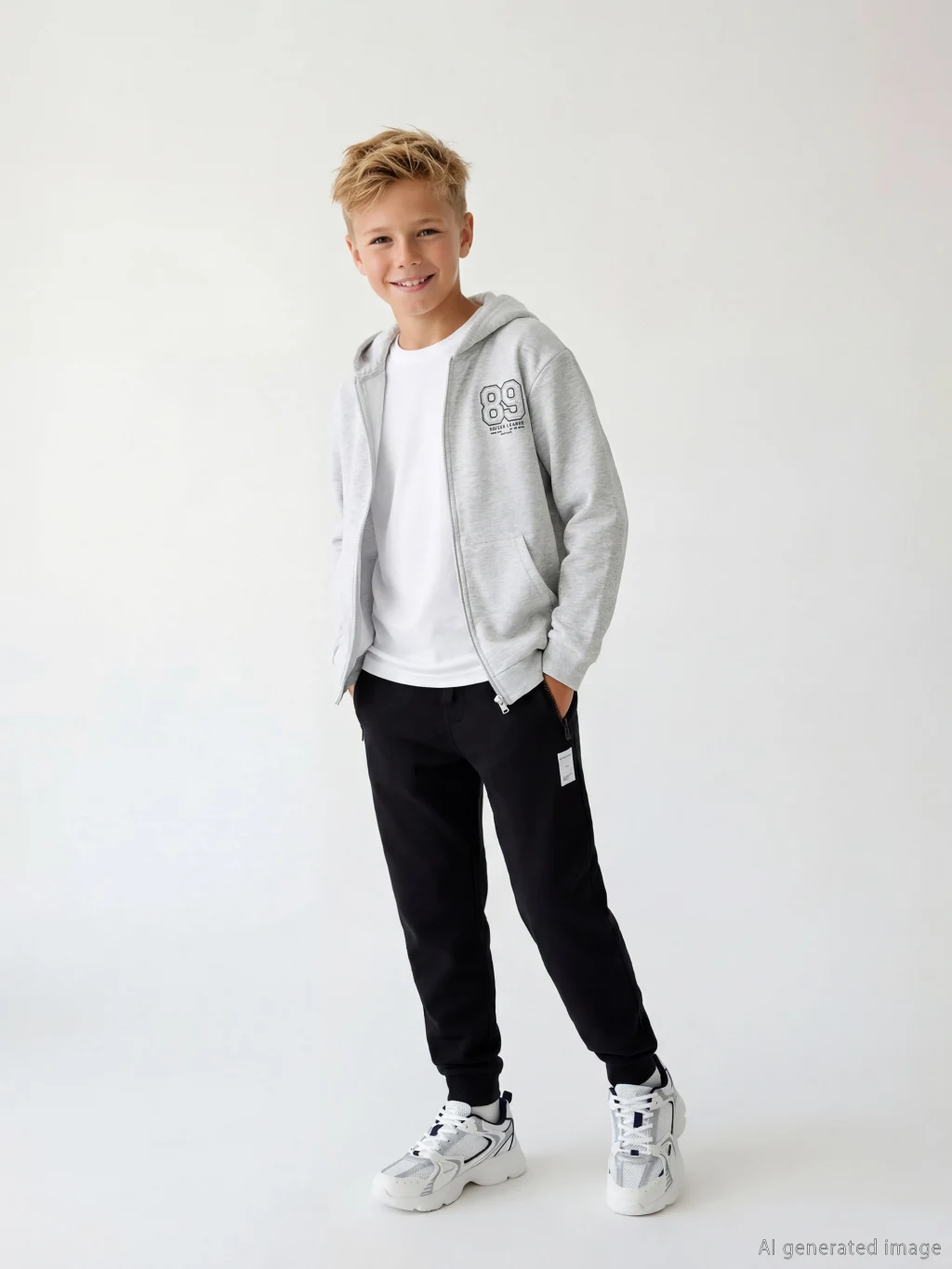 Beli lastikli ve bağcıklı erkek çocuk eşofman altı, orta kalınlıkta 2 iplik kumaştan üretilmiştir. Paçaları ribanalıdır ve fermuarlı cepleri bulunur.