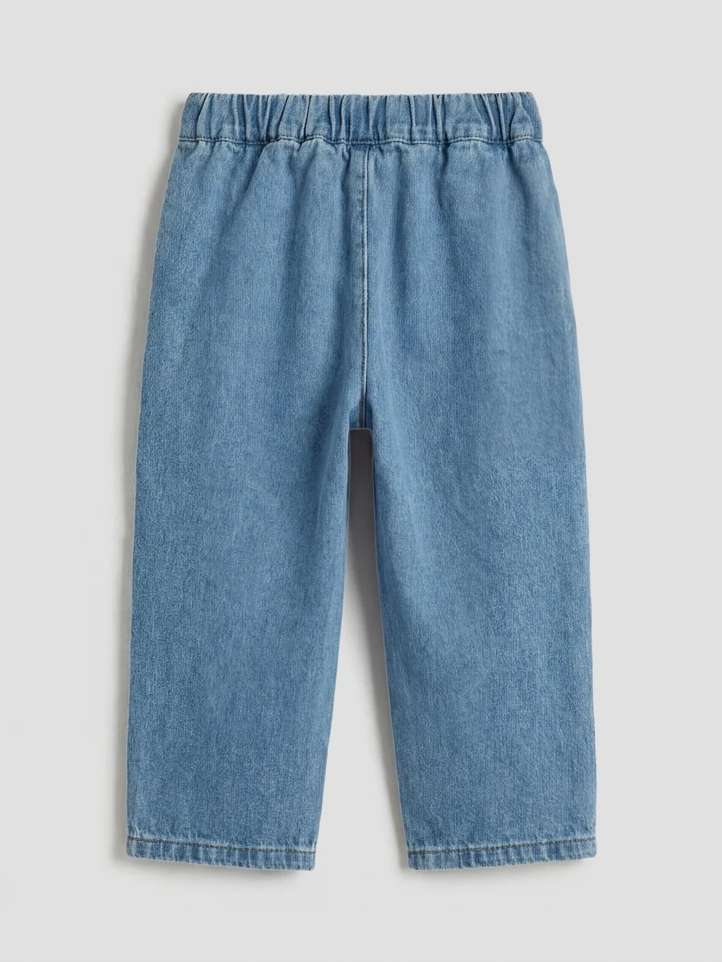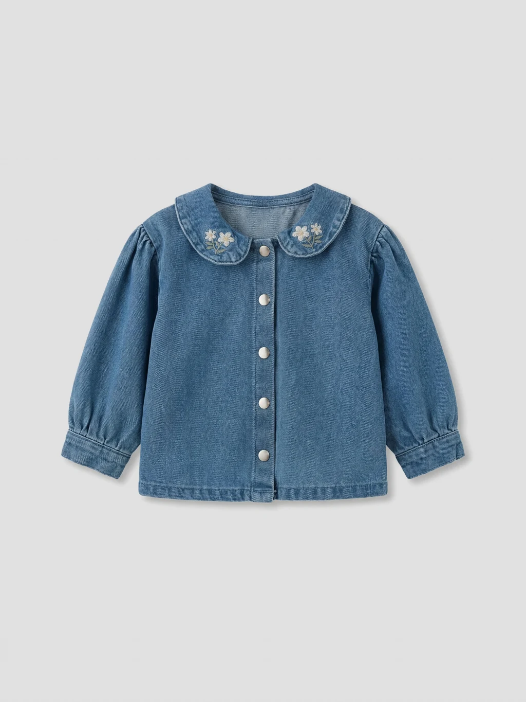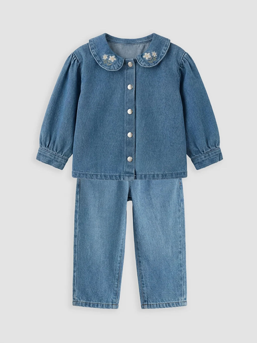 Kız bebek takım, %100 pamuk denim kumaştan üretilmiştir. Yakası nakışlı, uzun kollu, önden düğme kapamalı gömlek ve pantolondan oluşur.