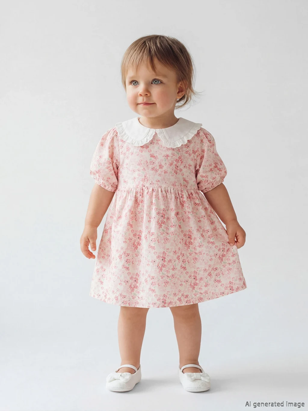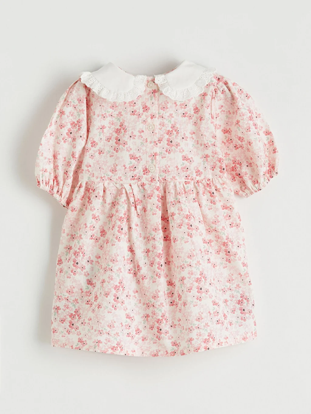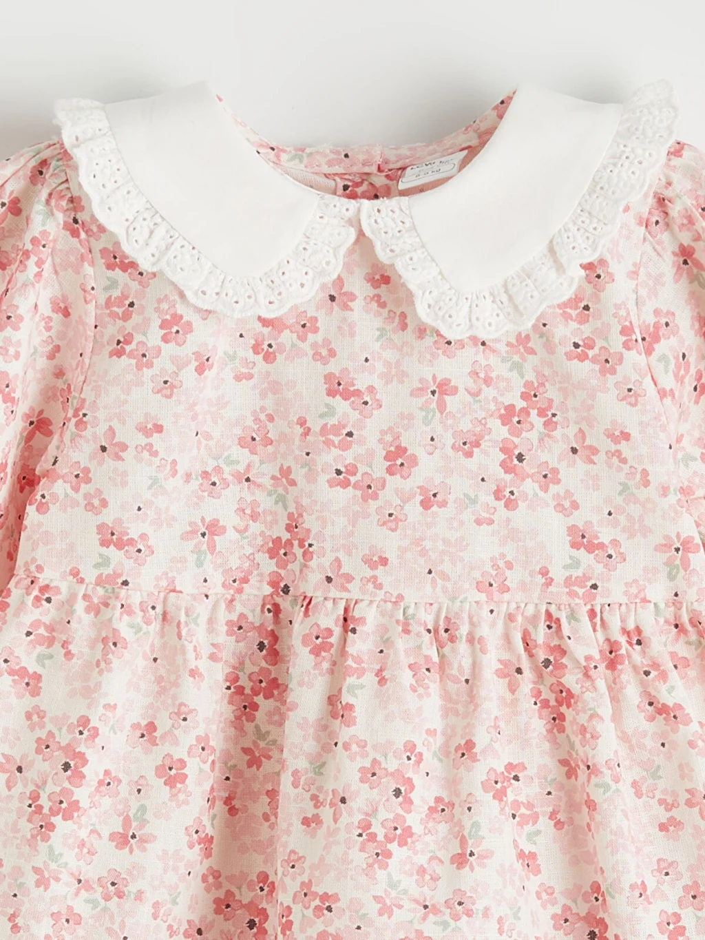 Çiçek desenli kız bebek elbise, %100 pamuk poplin kumaştan üretilmiştir. Bebe yakalı ve balon kolludur. Arkadan düğme kapamalıdır.