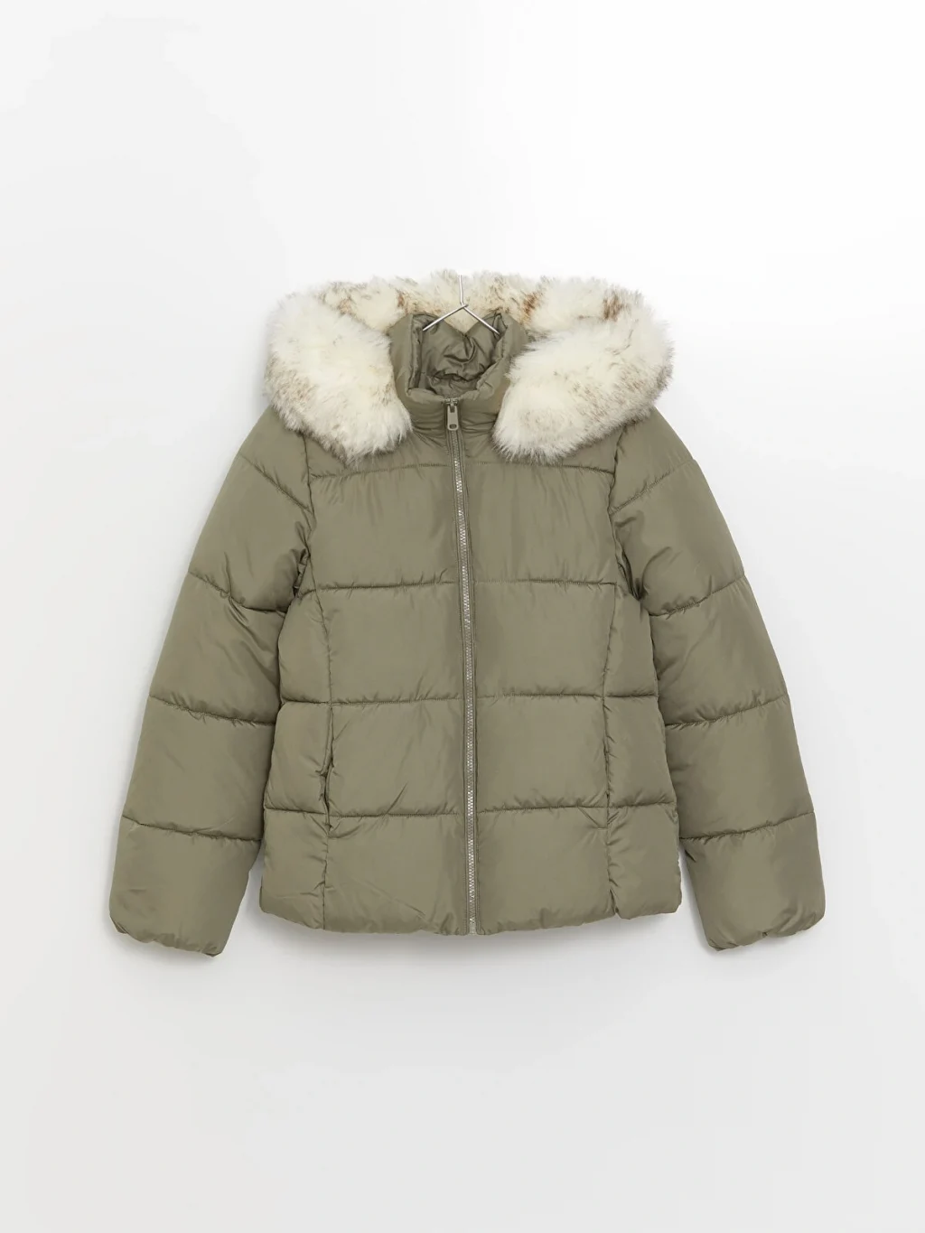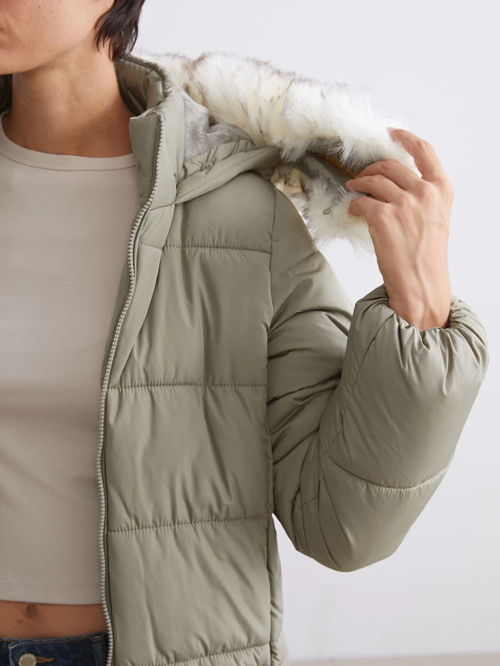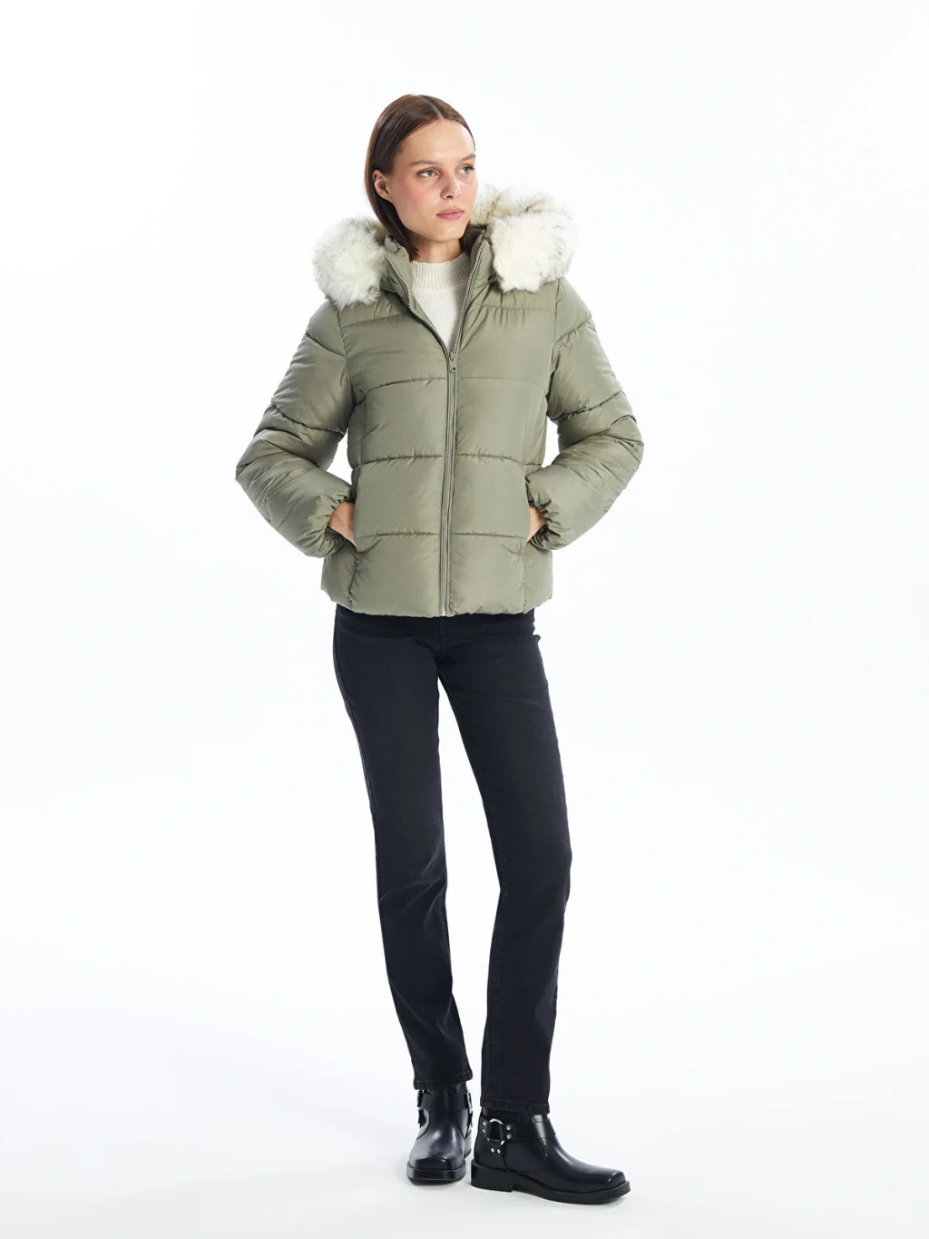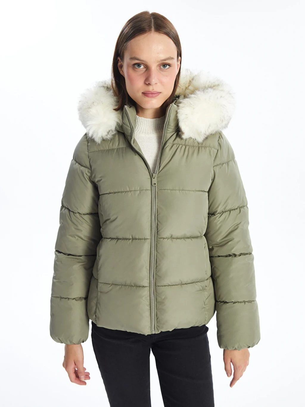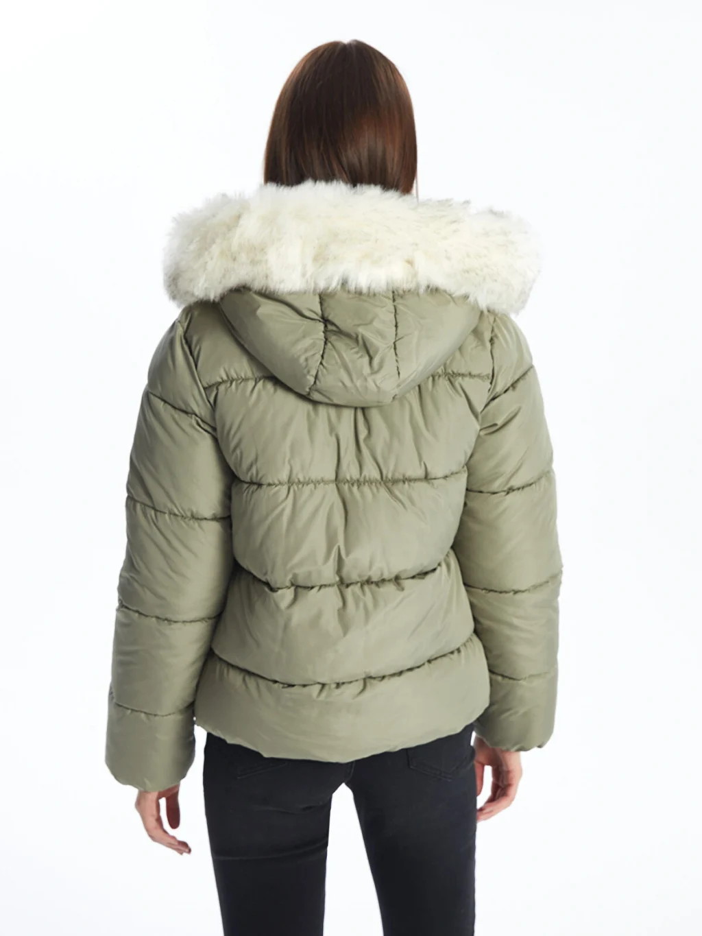 Suni kürklü sabit kapüşonlu kadın şişme mont, uzun kollu ve önden fermuar kapamalıdır. Yanlarda cepleri bulunur.