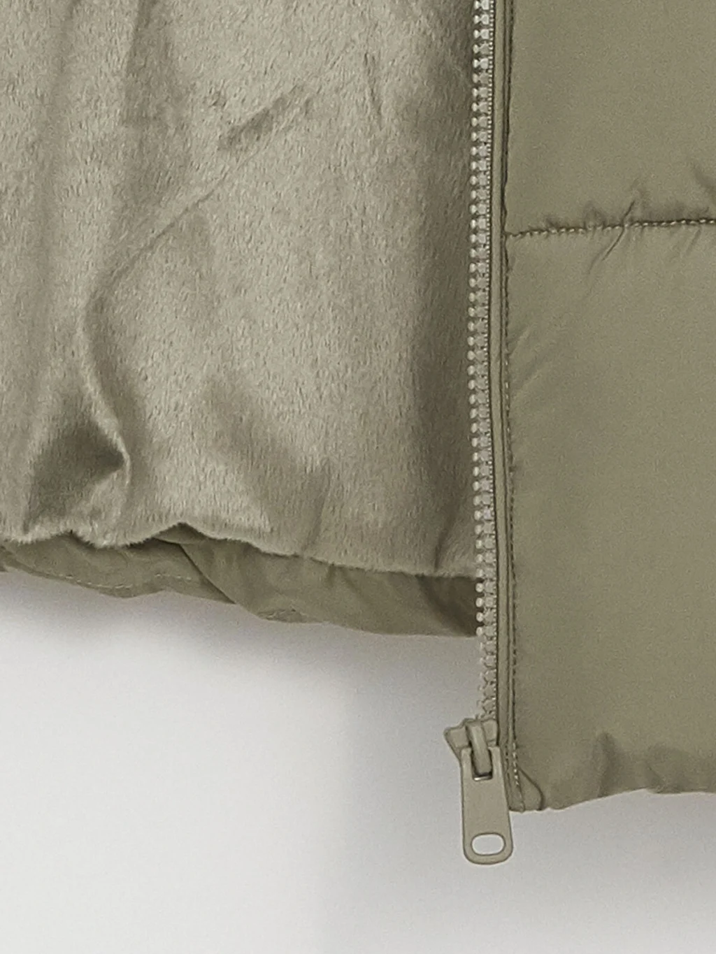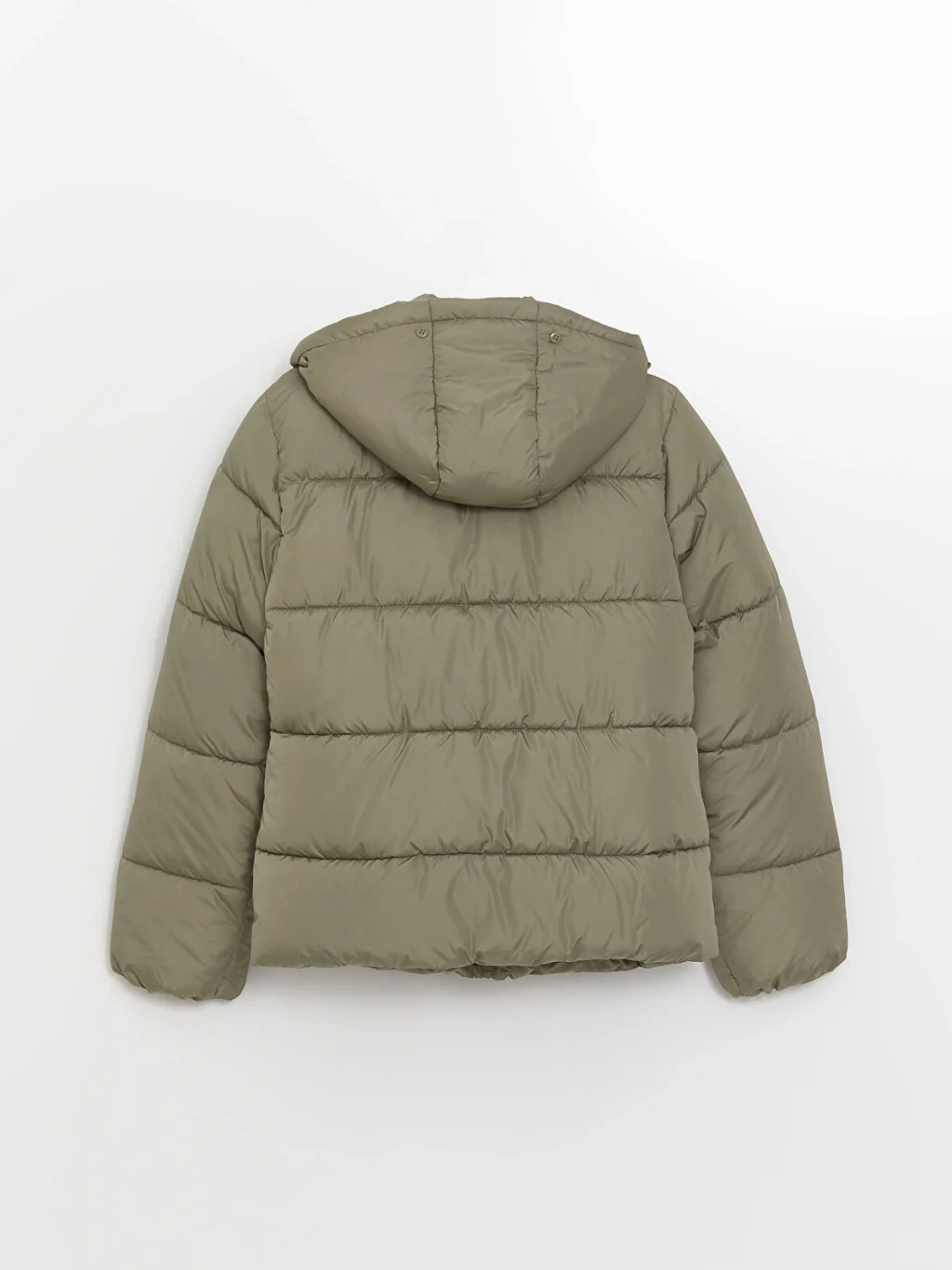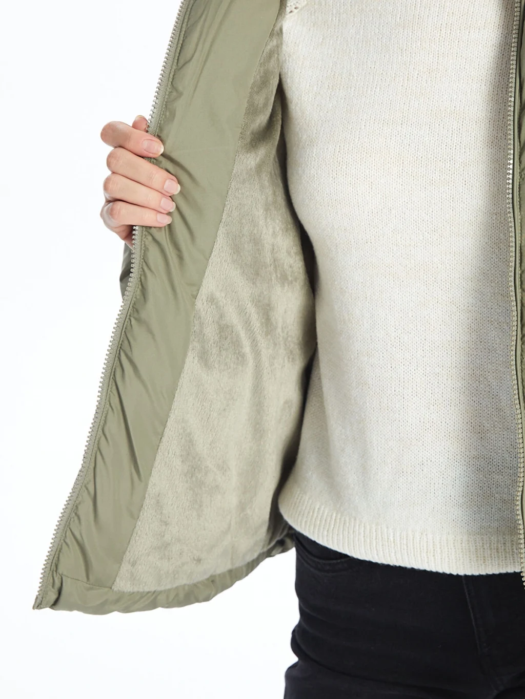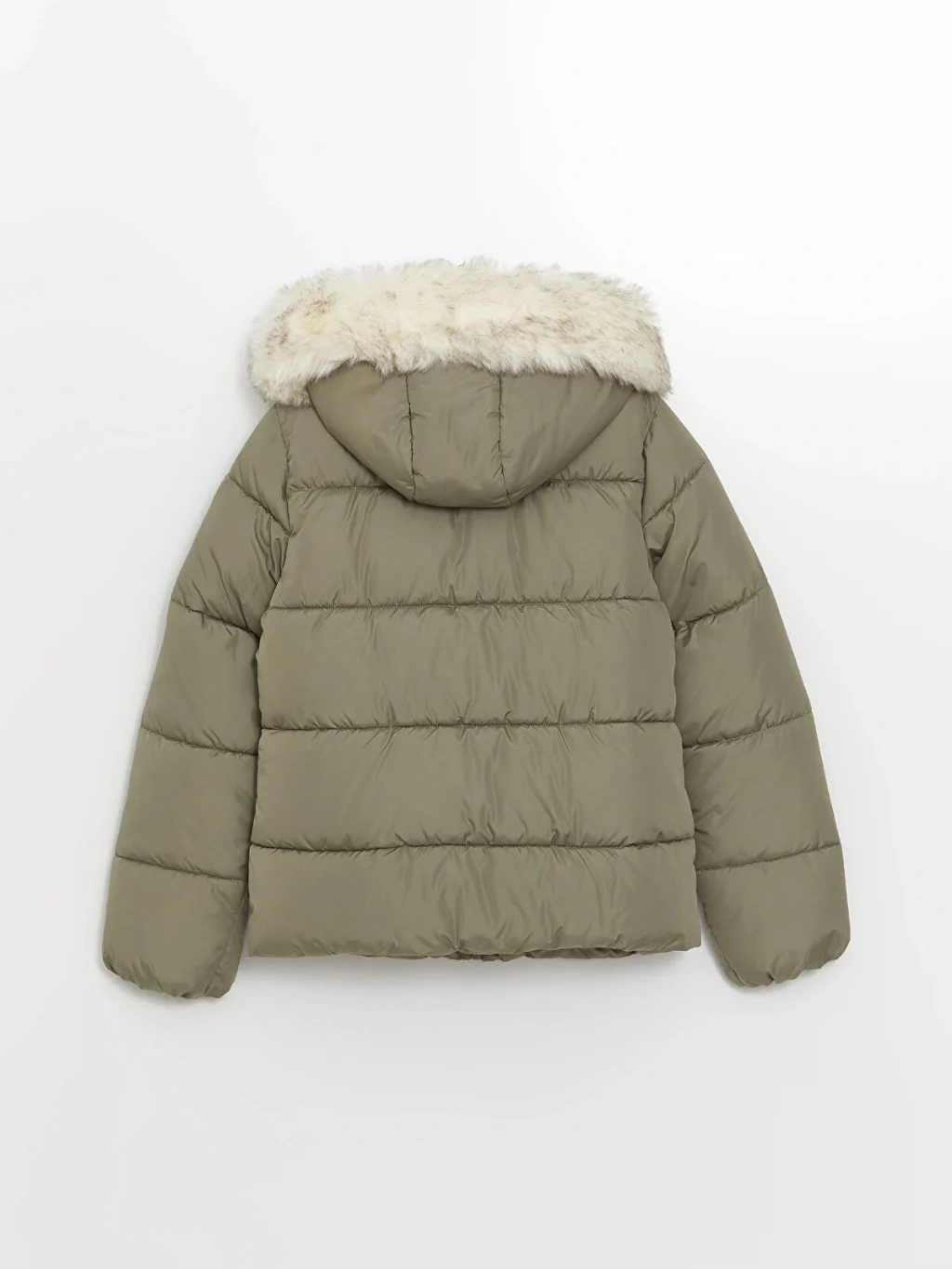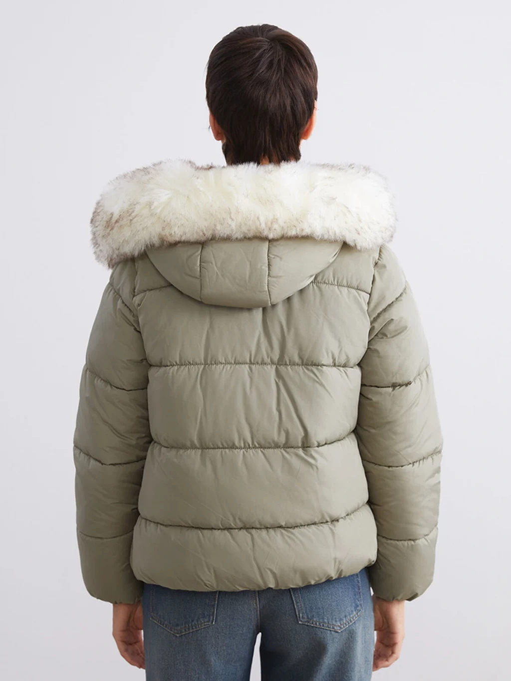 Suni kürklü sabit kapüşonlu kadın şişme mont, uzun kollu ve önden fermuar kapamalıdır. Yanlarda cepleri bulunur.