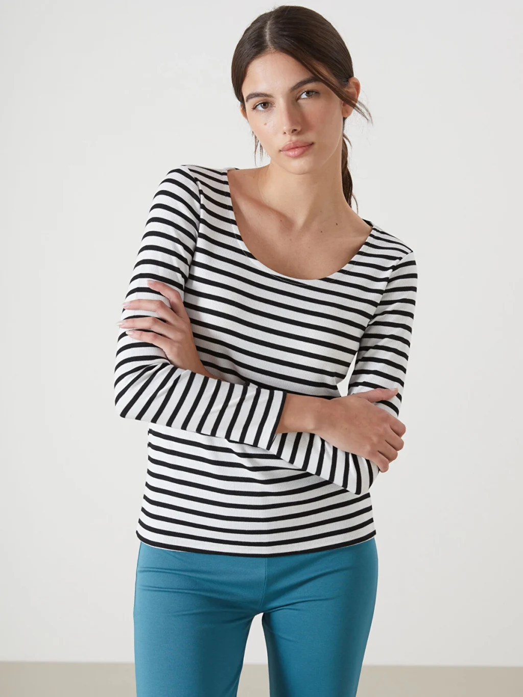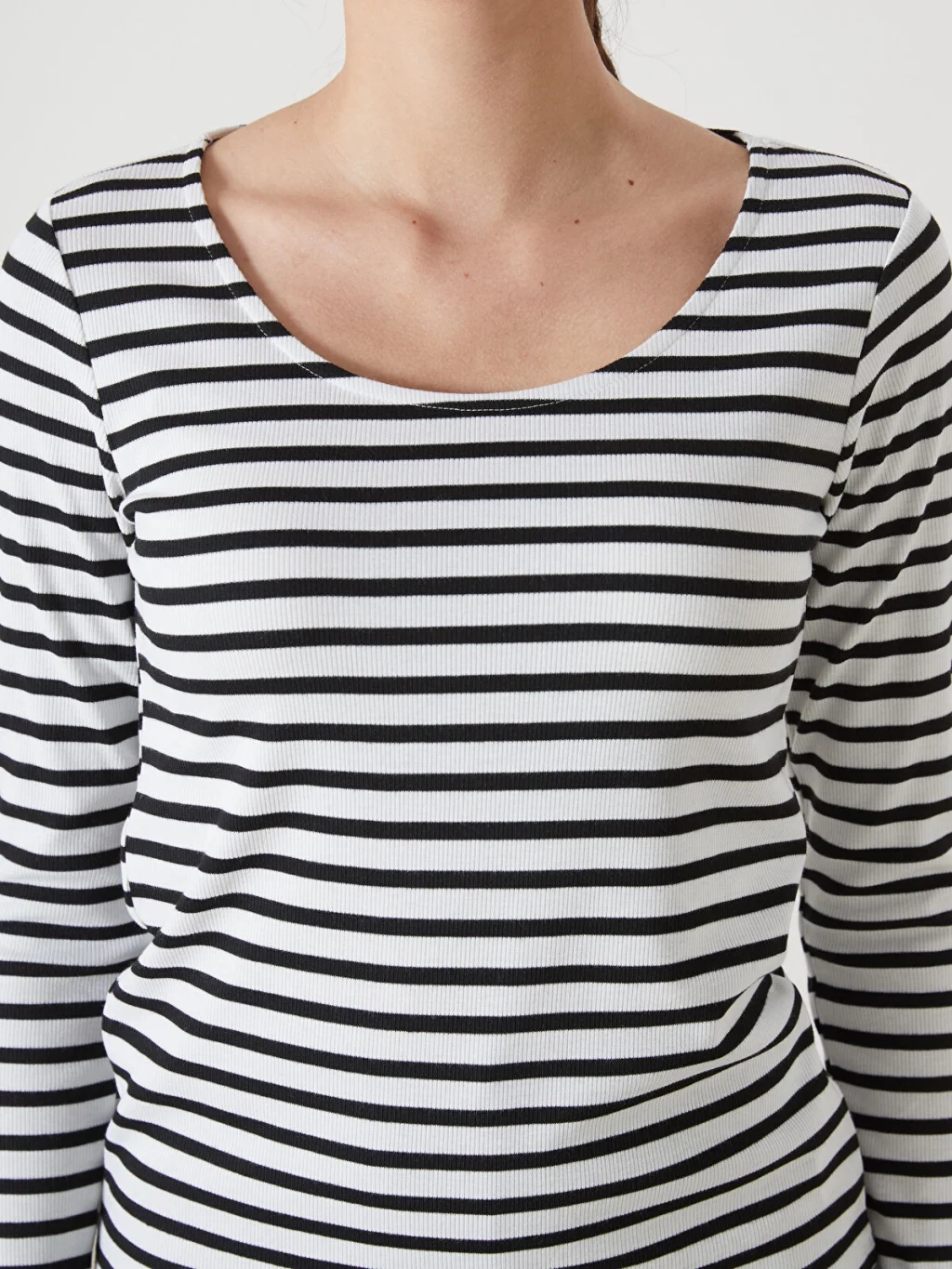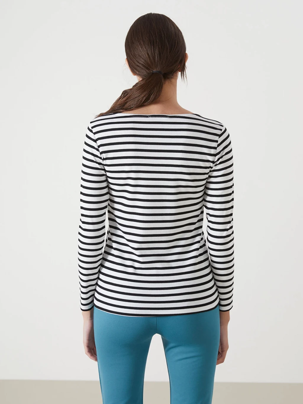 Geniş bisiklet yakalı ve uzun kollu kadın tişört, çizgili desene sahiptir. dar kalıplı ürün, kaşkorse kumaştan üretilmiştir.