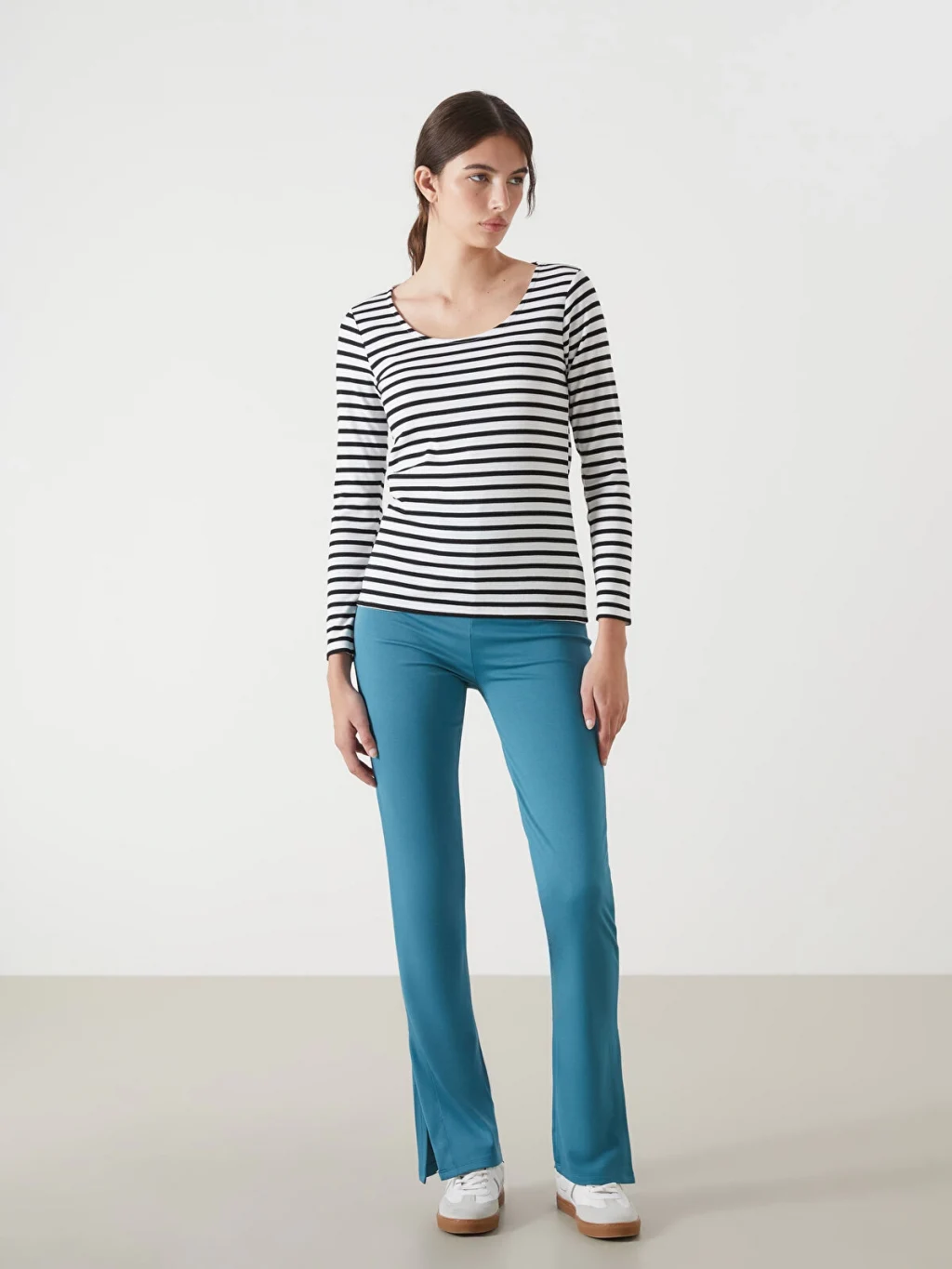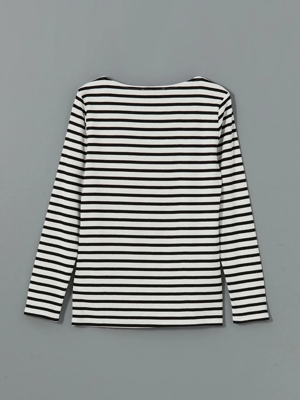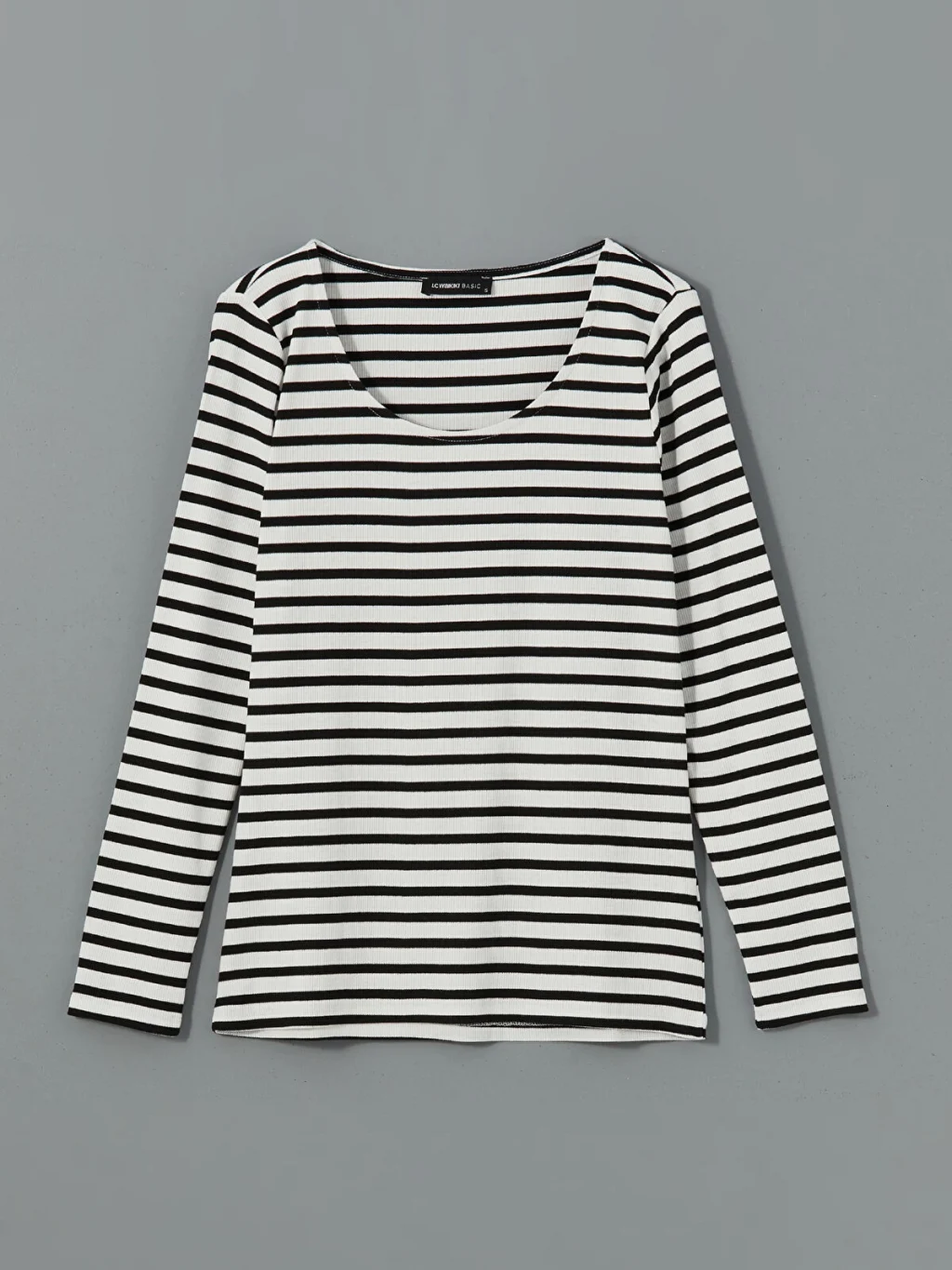 Geniş bisiklet yakalı ve uzun kollu kadın tişört, çizgili desene sahiptir. dar kalıplı ürün, kaşkorse kumaştan üretilmiştir.