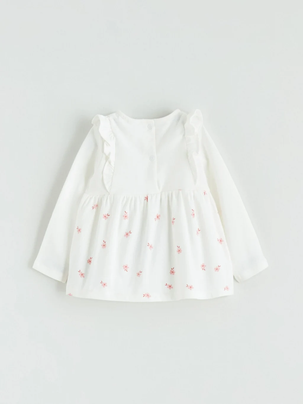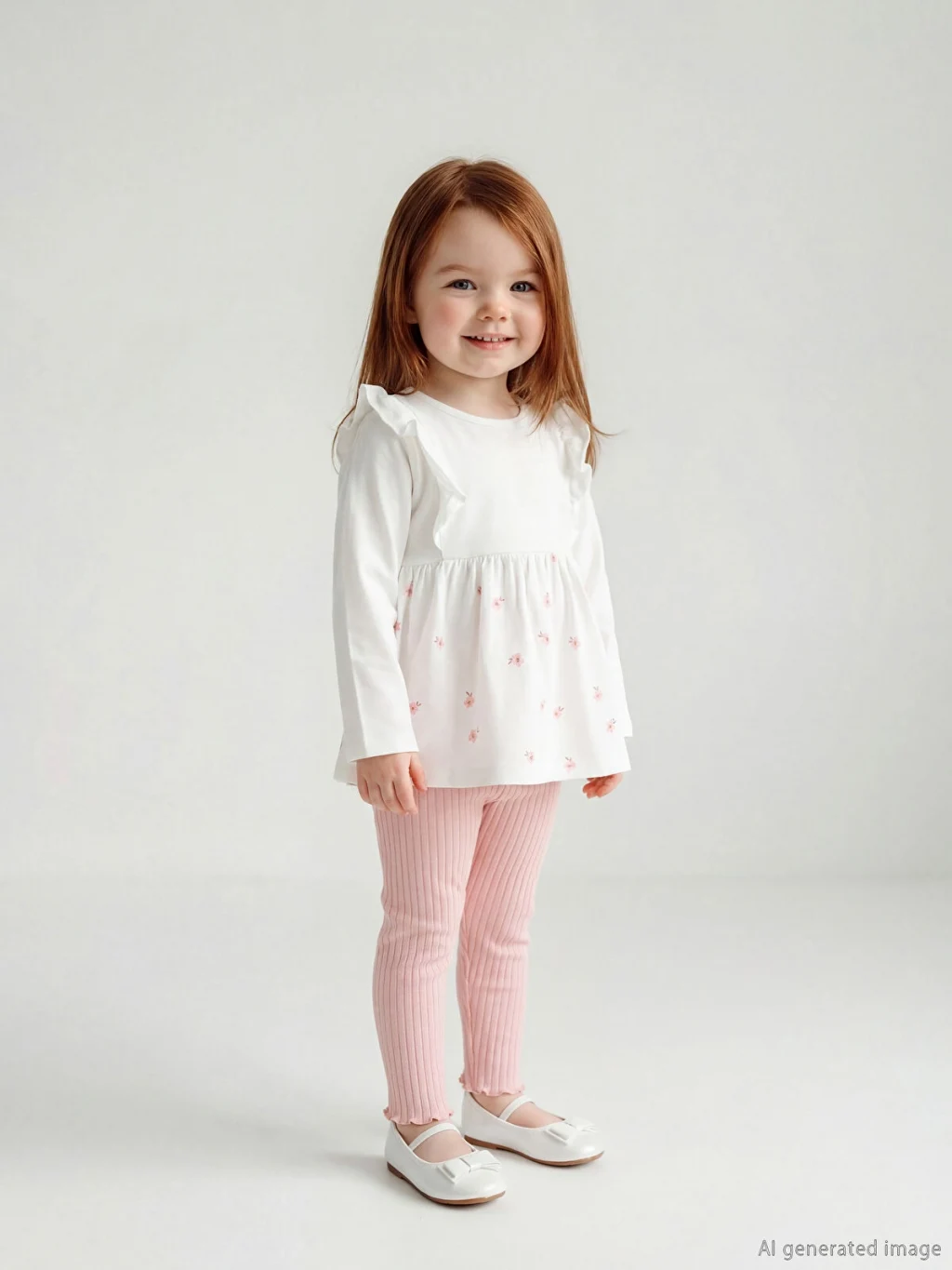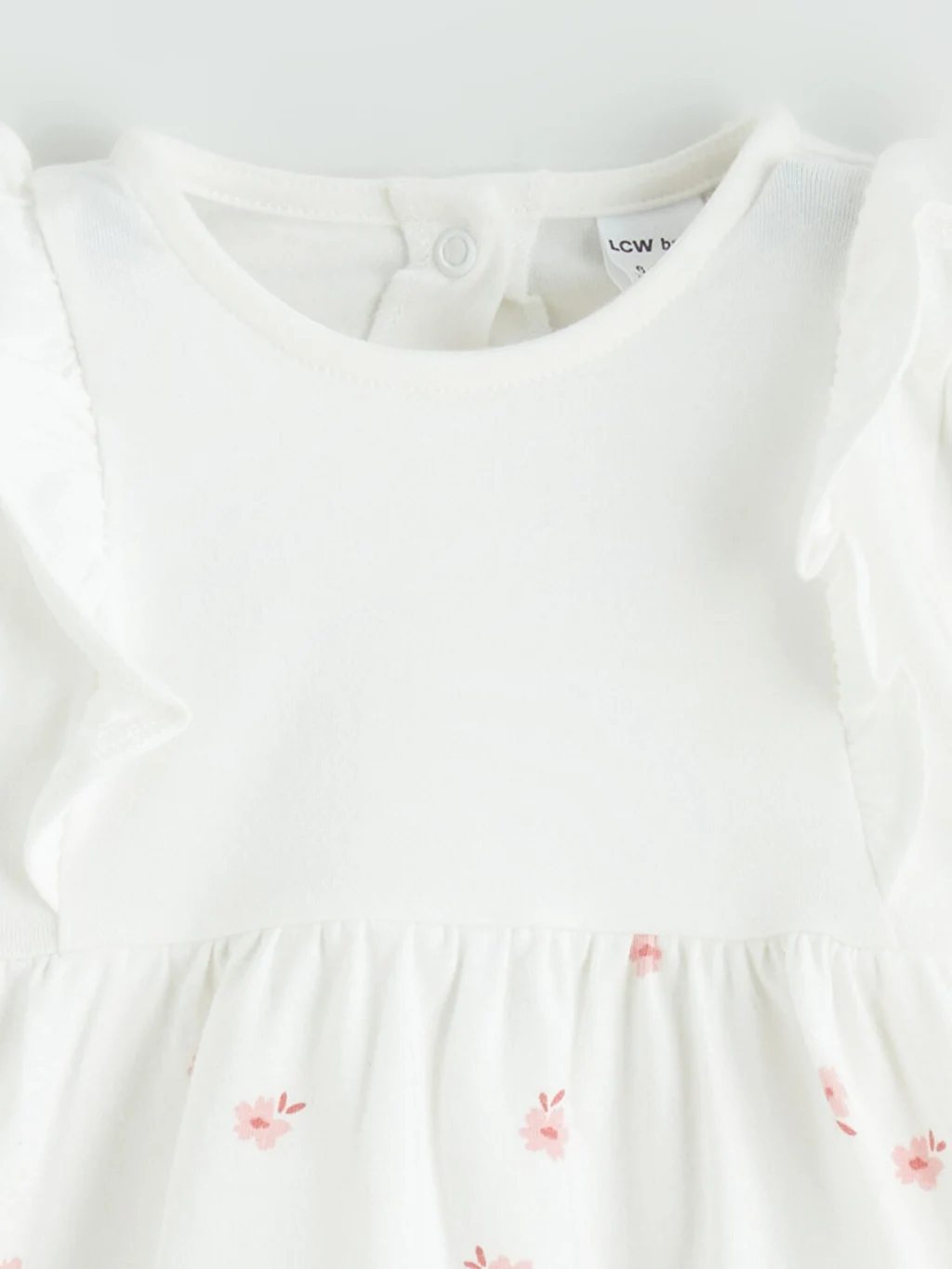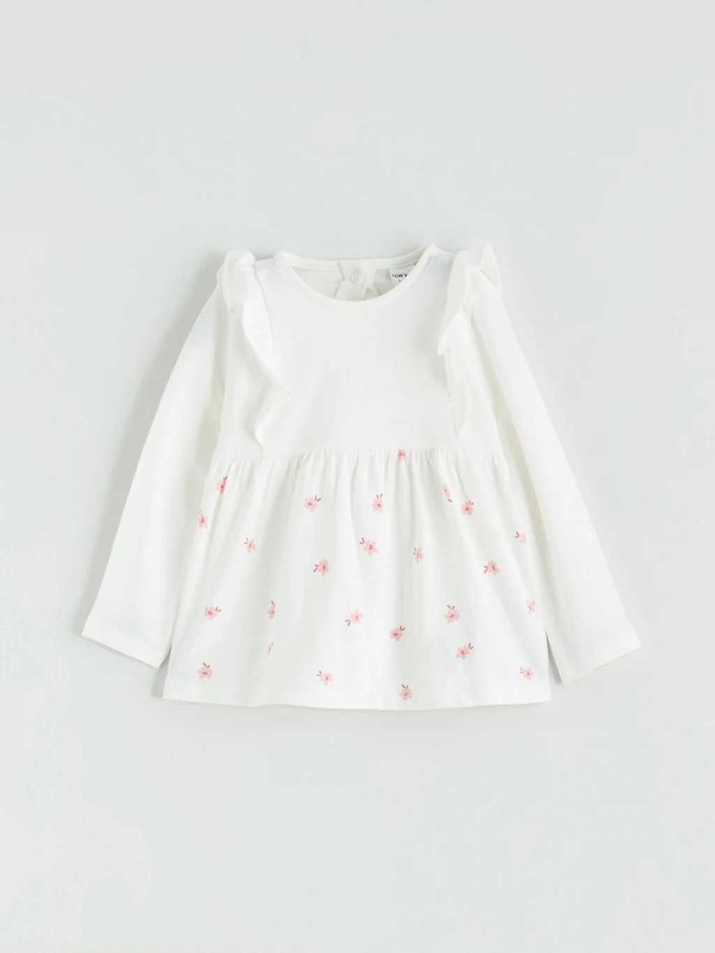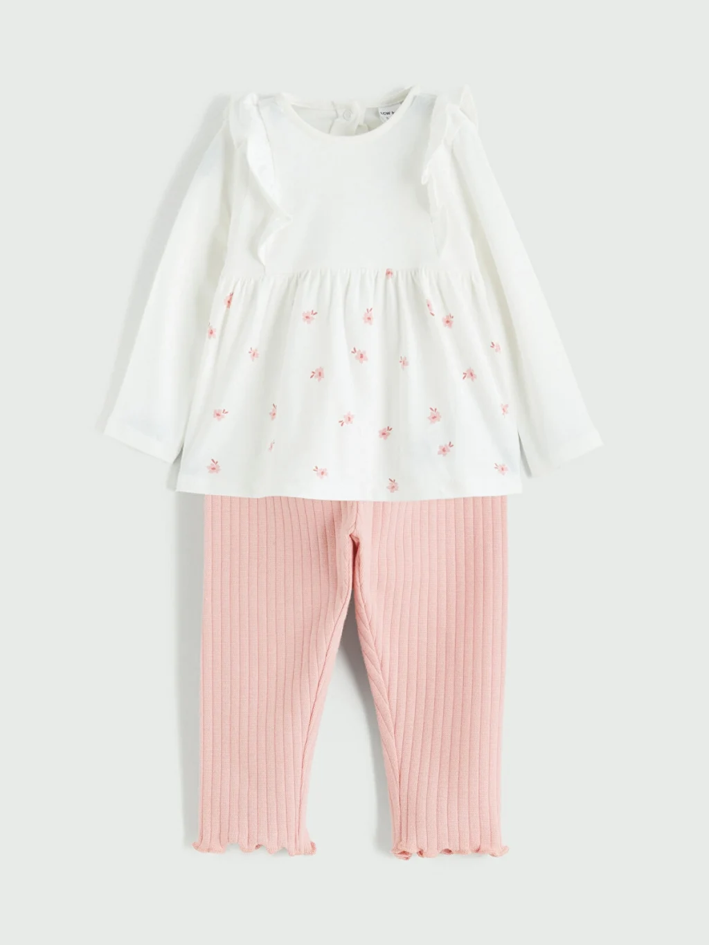 Yüksek pamuk içerikli penye kız bebek takım; bisiklet yaka, uzun kollu, omuzları fırfırlı, çiçek desenli üst ve paçaları fırfırlı fitilli tayttan oluşur.