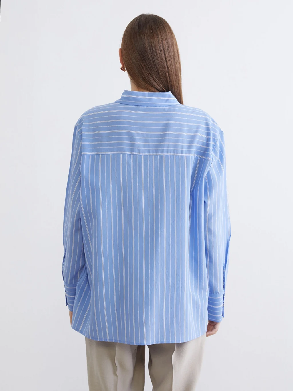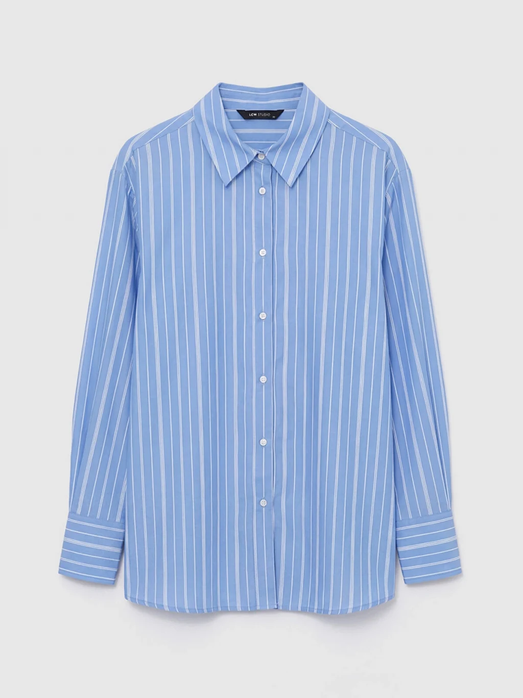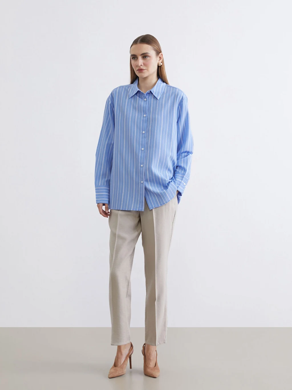 Çizgili desenli kadın gömlek, uzun kollu ve yakalıdır. Önden düğme ile kapanır ve manşetleri düğmelidir.