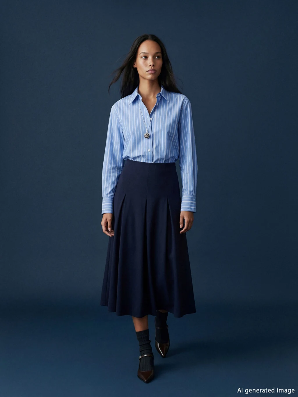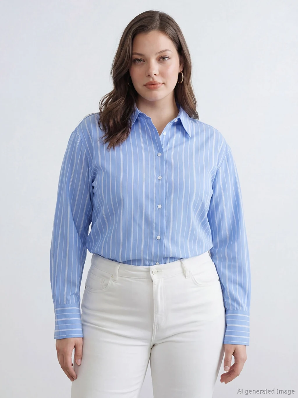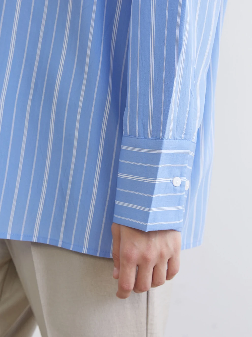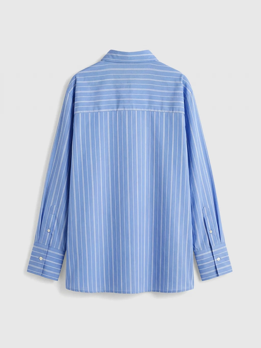 Çizgili desenli kadın gömlek, uzun kollu ve yakalıdır. Önden düğme ile kapanır ve manşetleri düğmelidir.