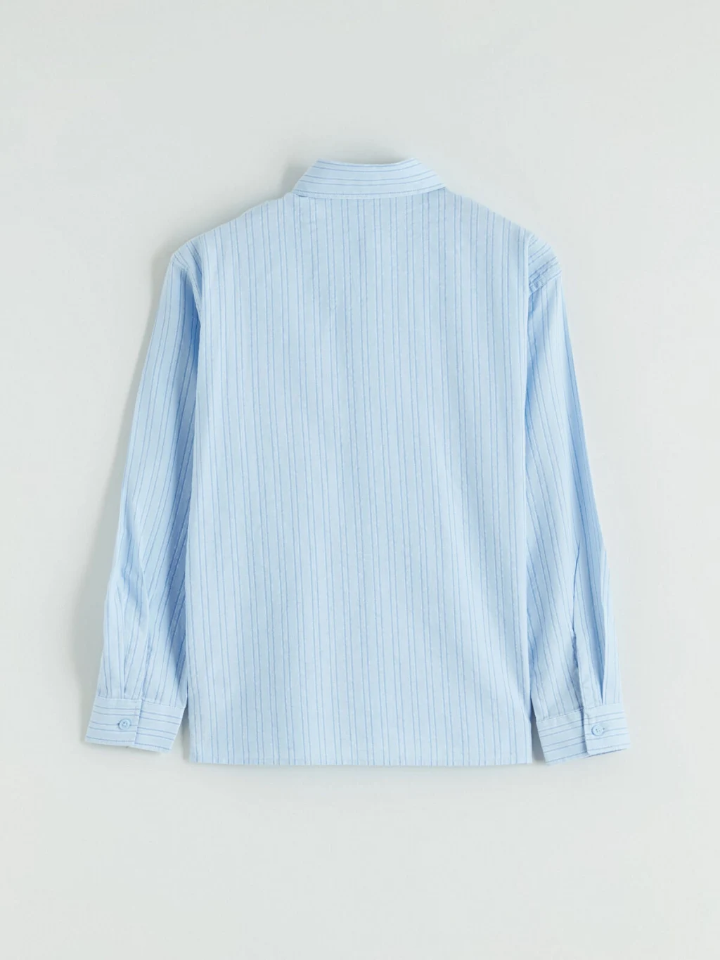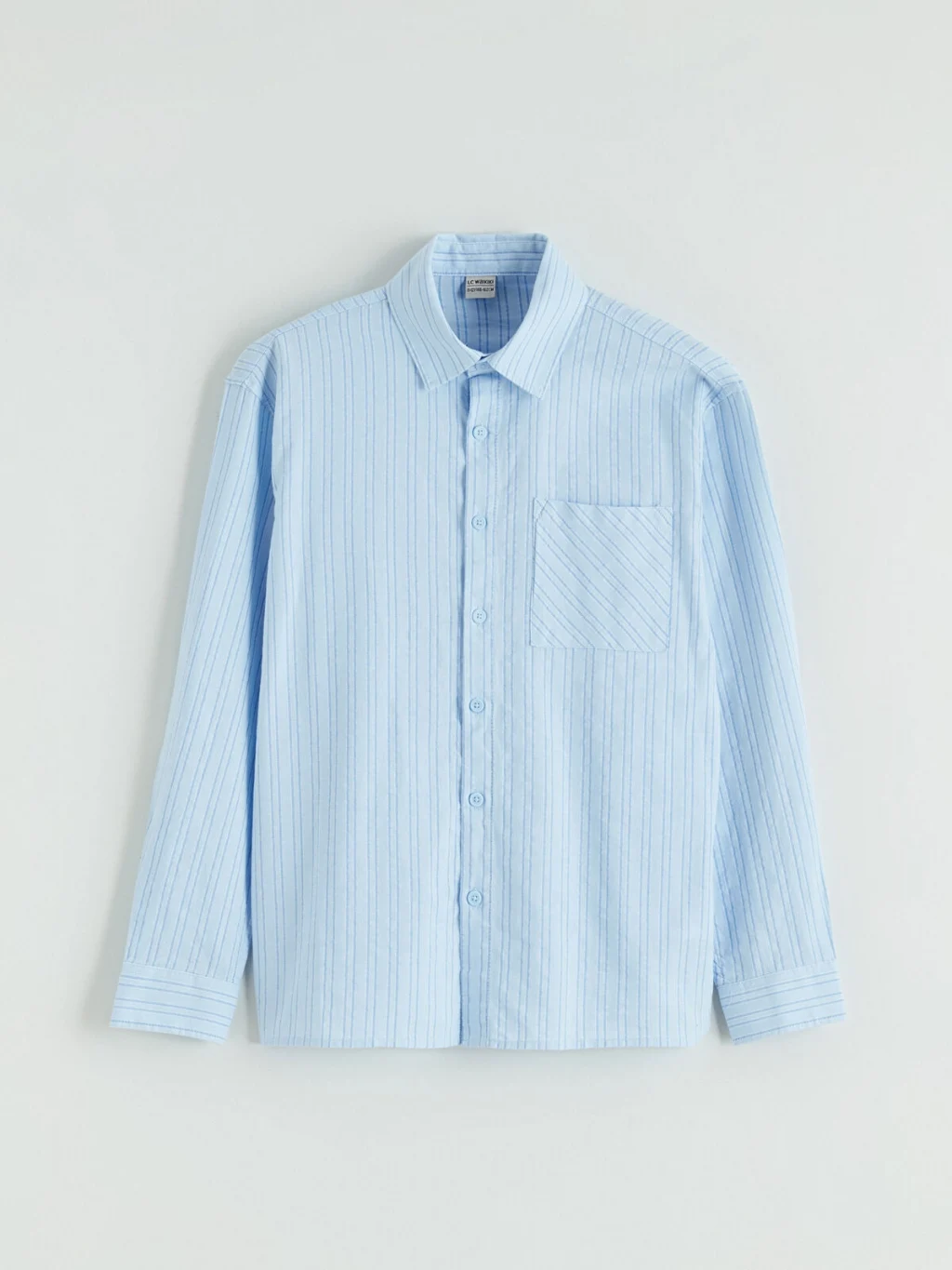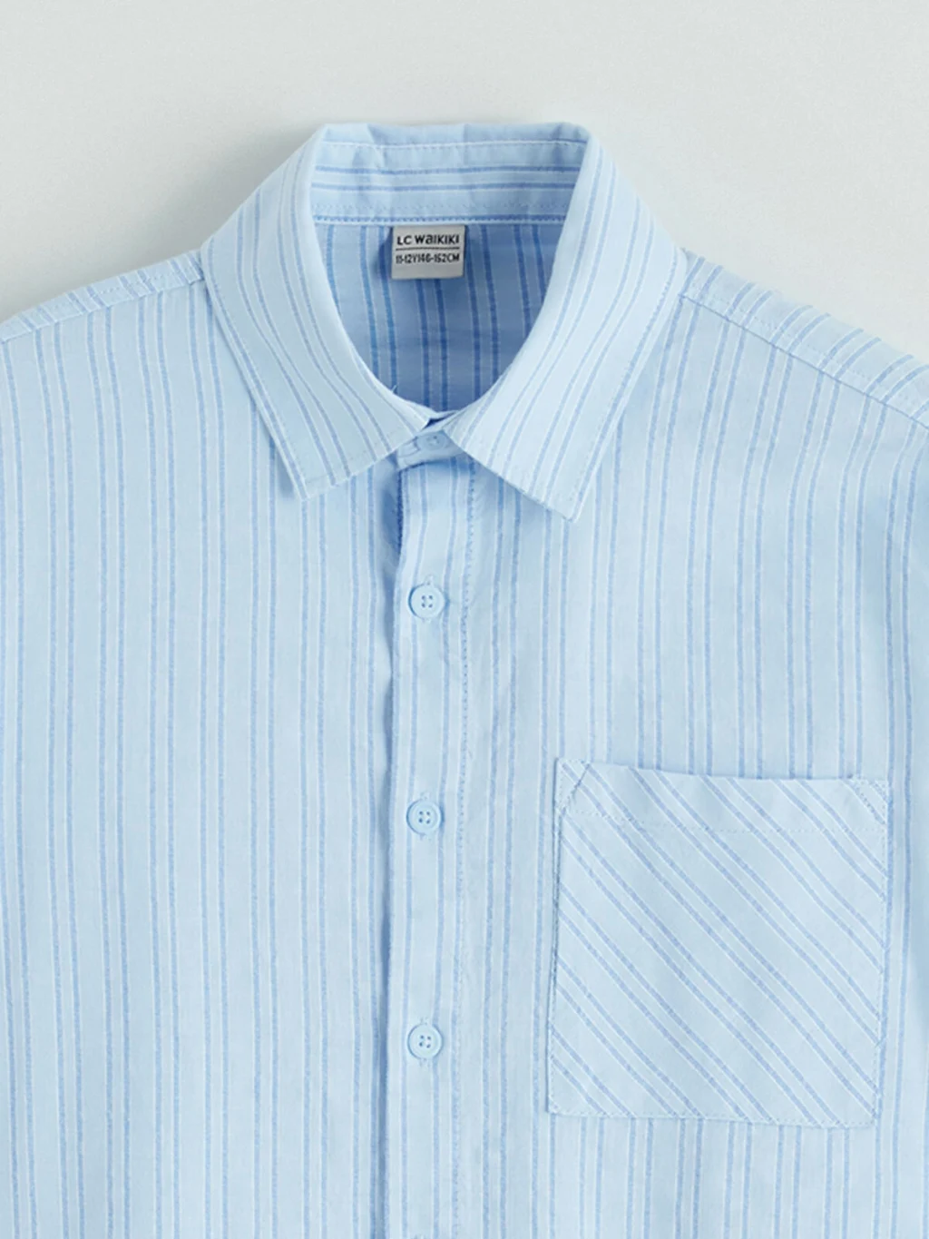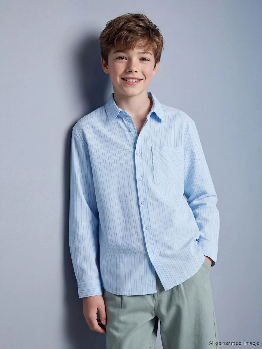 Erkek çocuk gömlek, %100 pamuklu keten görünümlü kumaştan üretilmiştir. Uzun kollu ve çizgili desene sahiptir. Göğüs ceplidir ve önden düğme kapamalıdır.