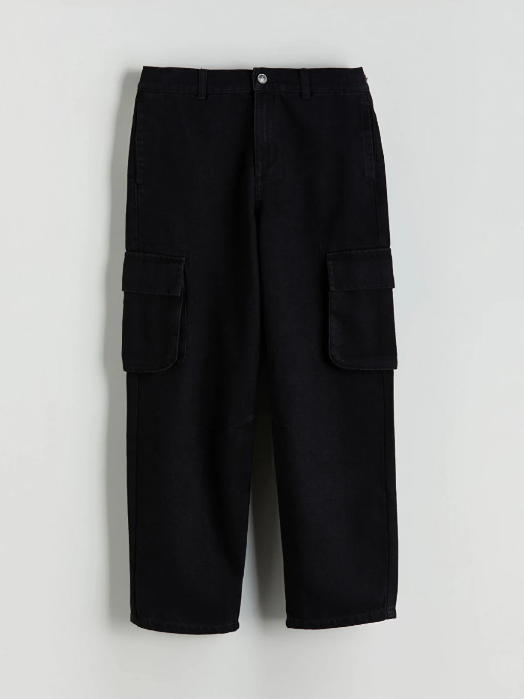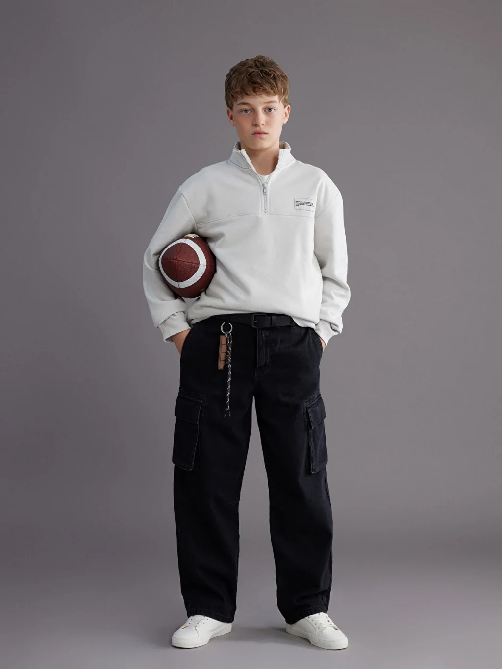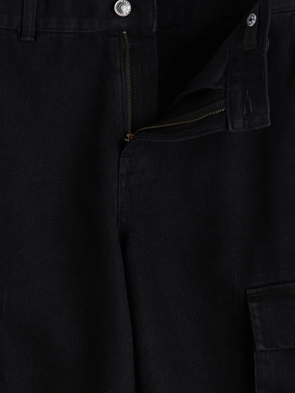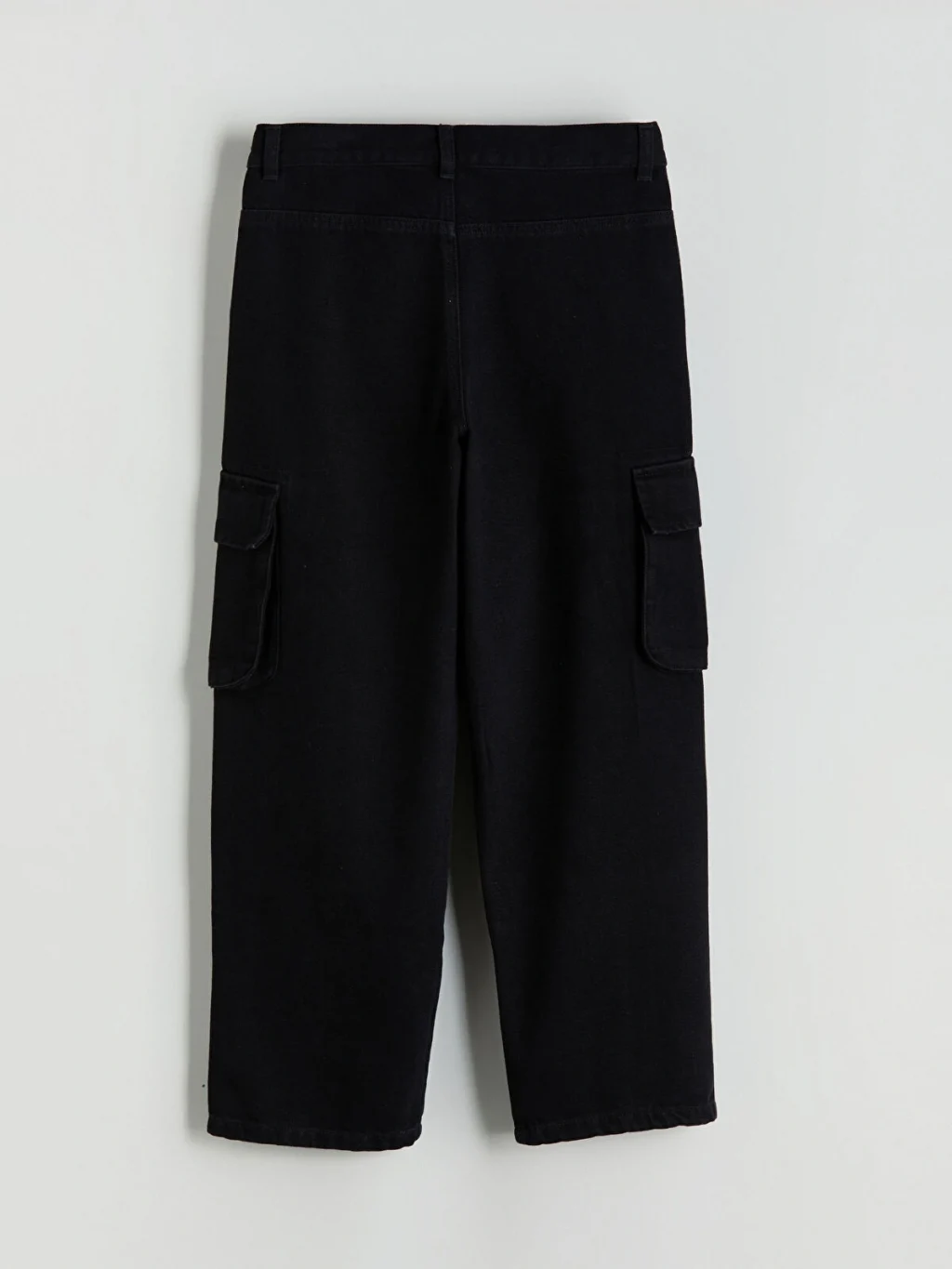 Loose fit jean pantolon, belden paçaya doğru bol inen kesime sahiptir. Kargo cepli ve beli içten ayarlanabilir lastiklidir.