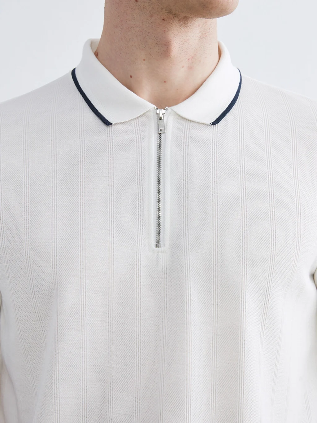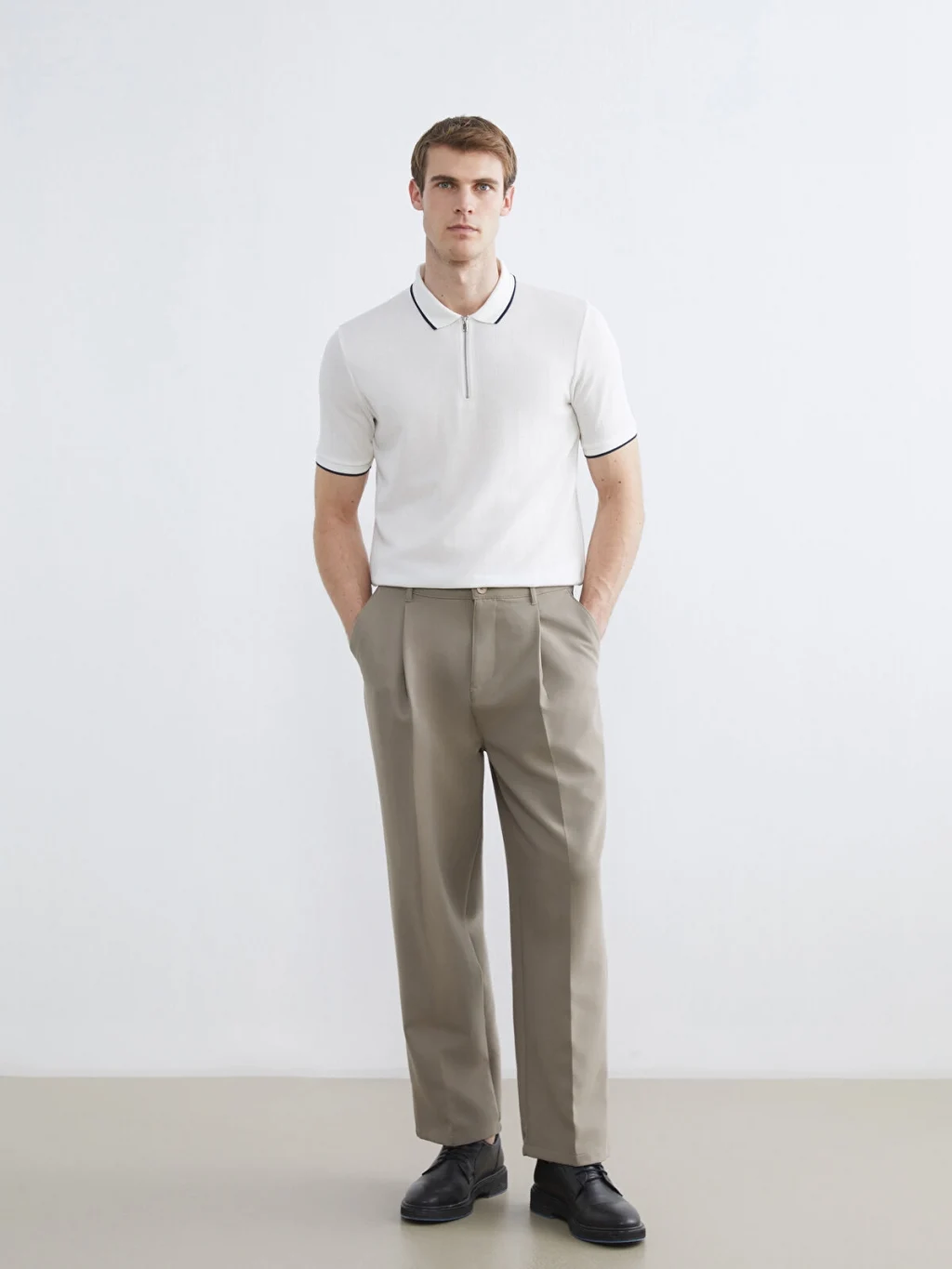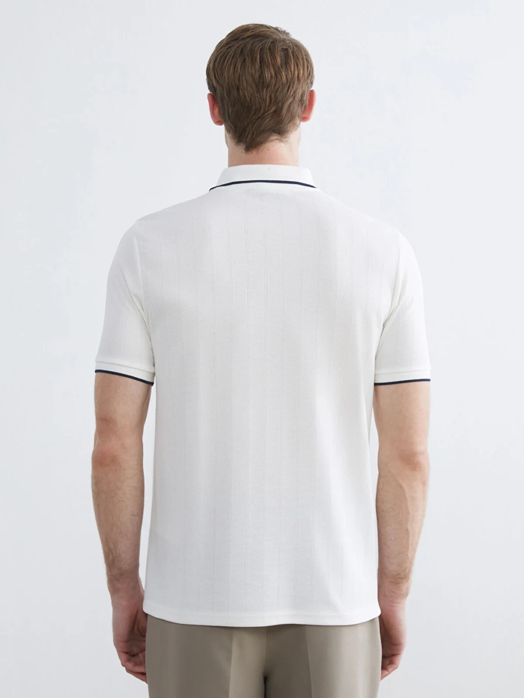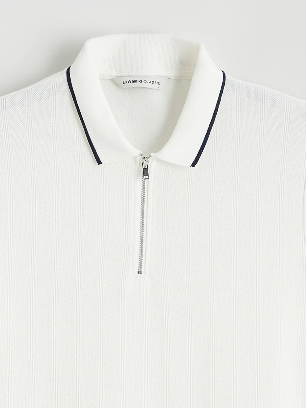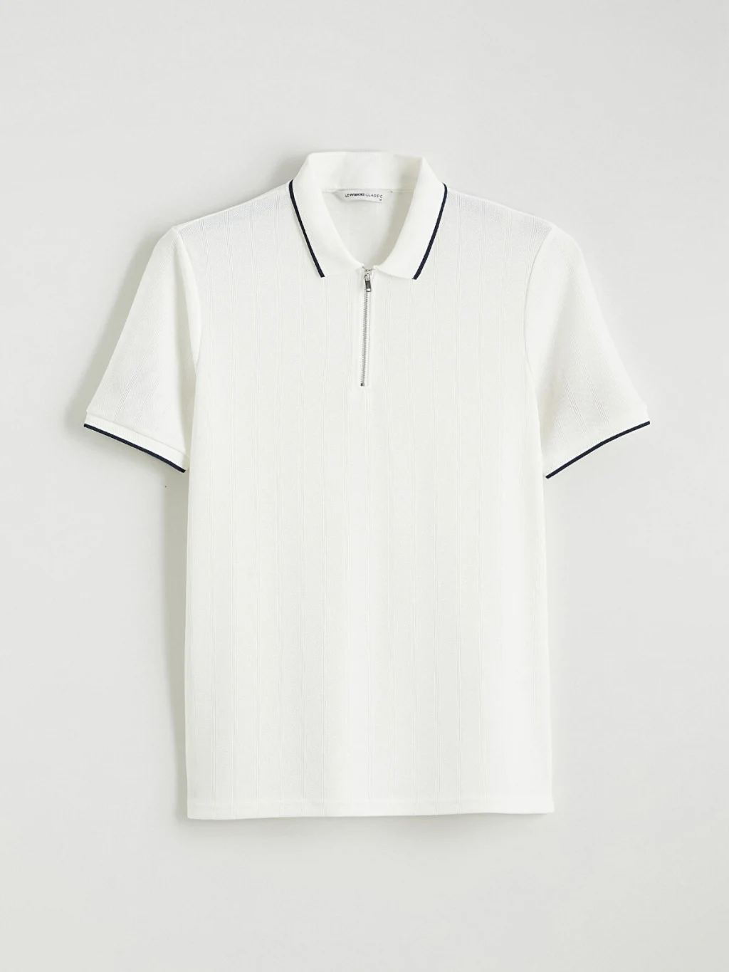 Kısa kollu ve polo yakalı erkek tişört, yakadan fermuar kapamalıdır. Yaka ve kol uçları biyeli tasarıma sahiptir.