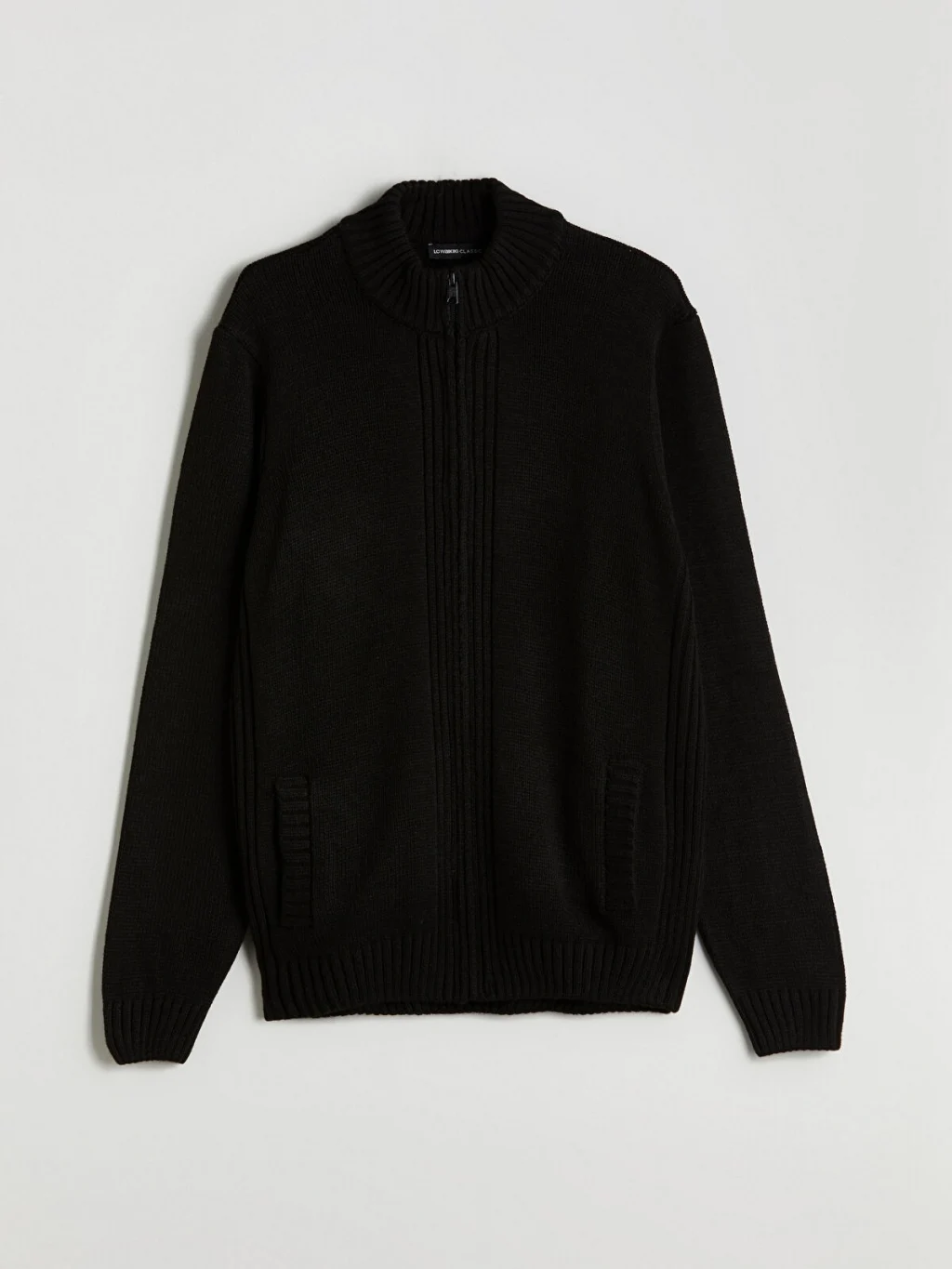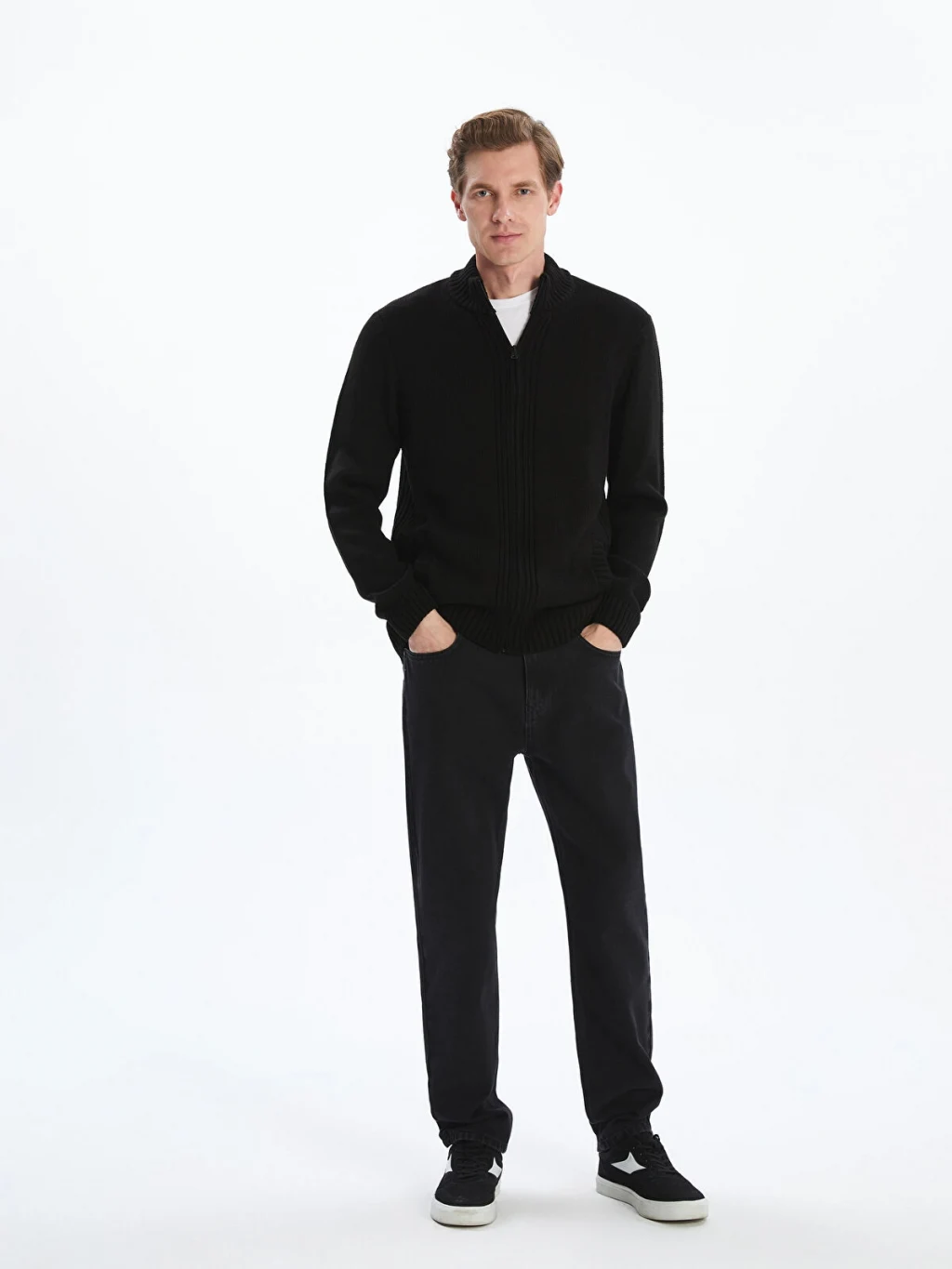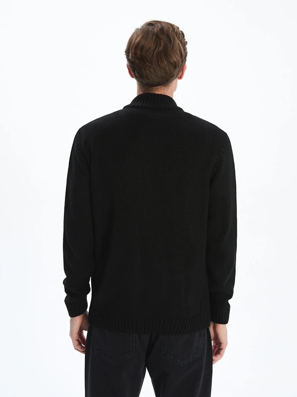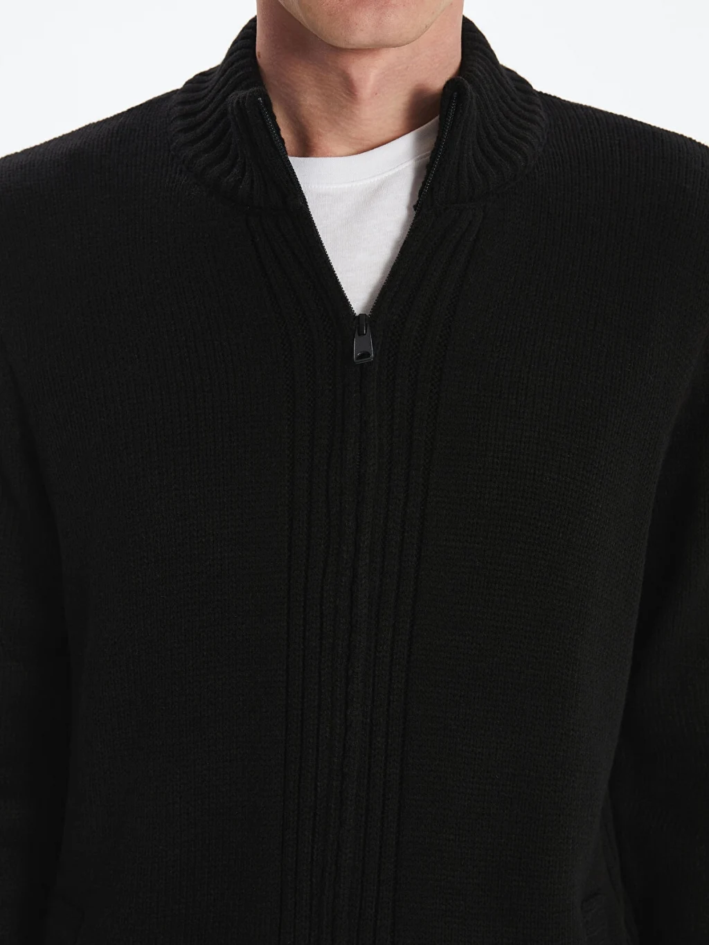 Standart kalıpta tasarlanan erkek triko hırka, fermuar kapamalı ve dik yaka detaylıdır.