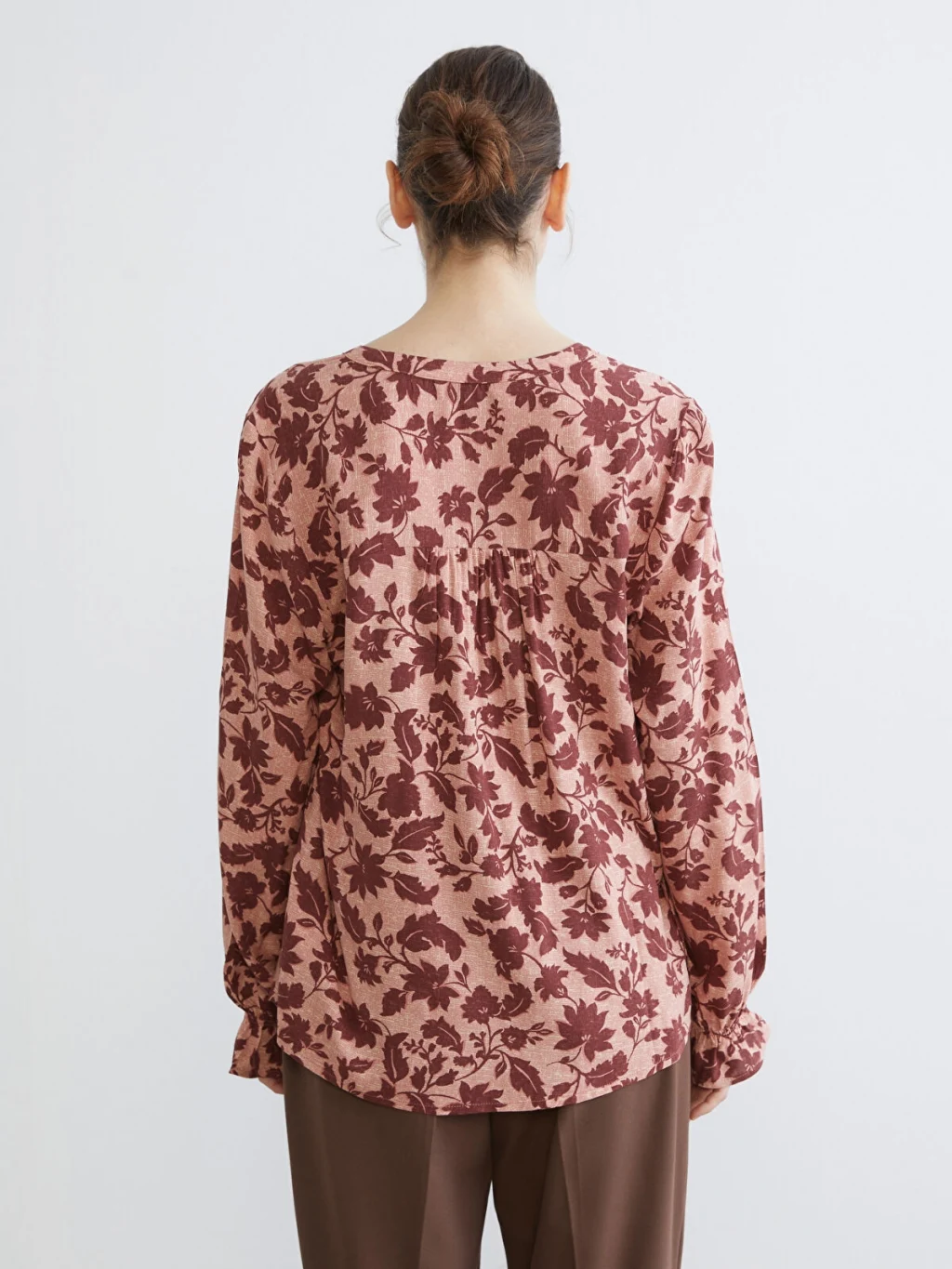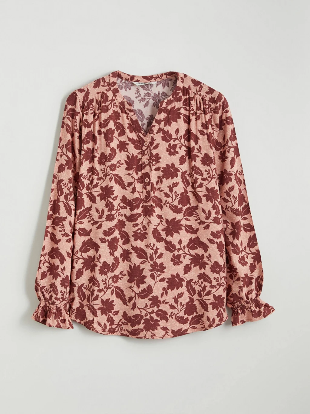 Çiçek desenli, kaçık yakalı ve yarım düğme patlı kadın bluz. Uzun kollu olup, manşetleri ve omuzları büzgülüdür.