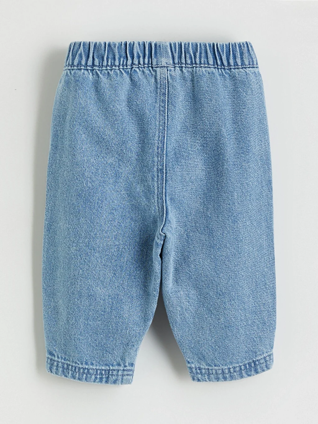Bisiklet yaka, uzun kollu, omuzdan çıtçıt kapamalı sweatshirt ve denim pantolondan oluşan erkek bebek takım, %100 pamuklu kumaştan üretilmiştir.