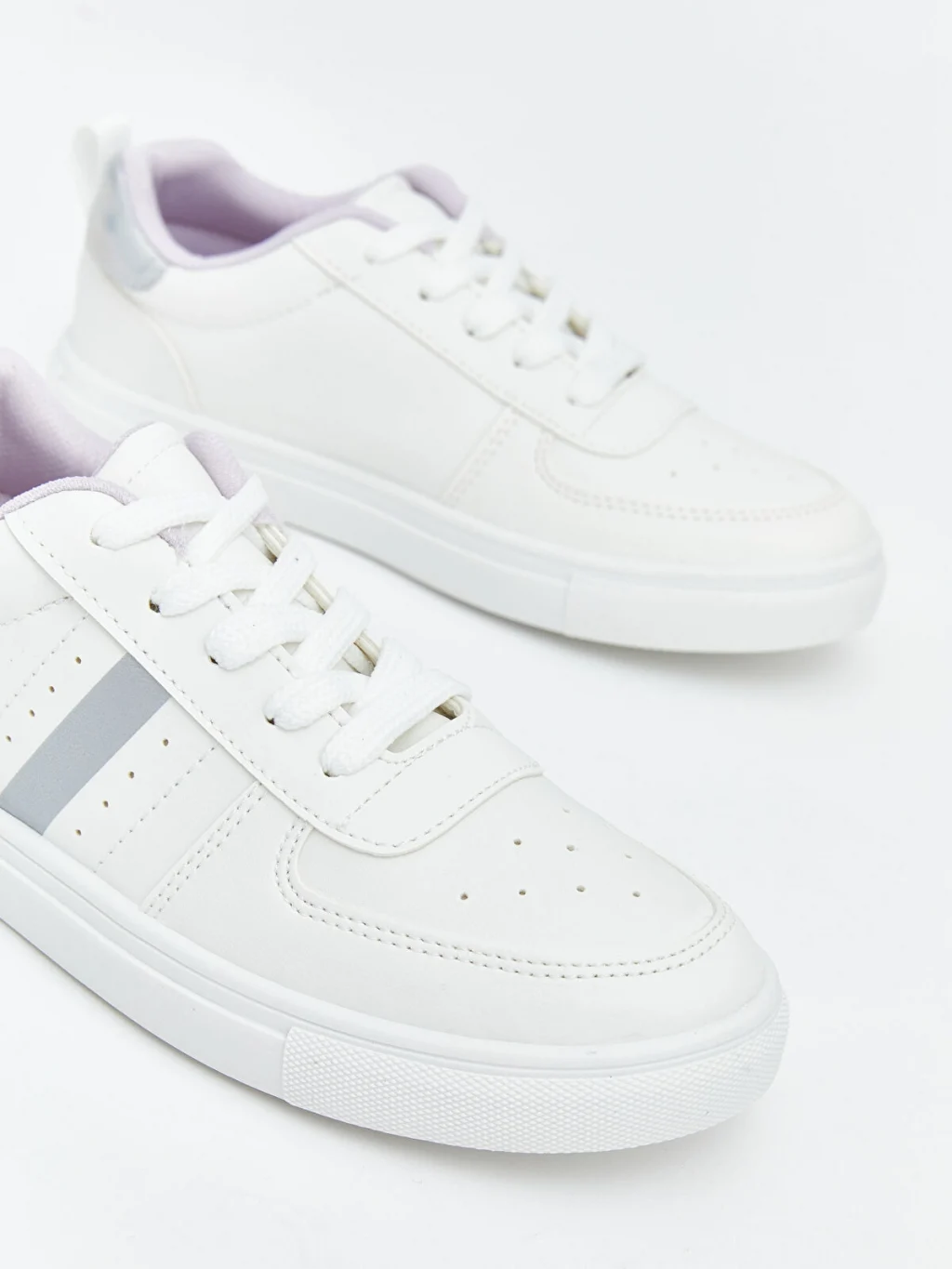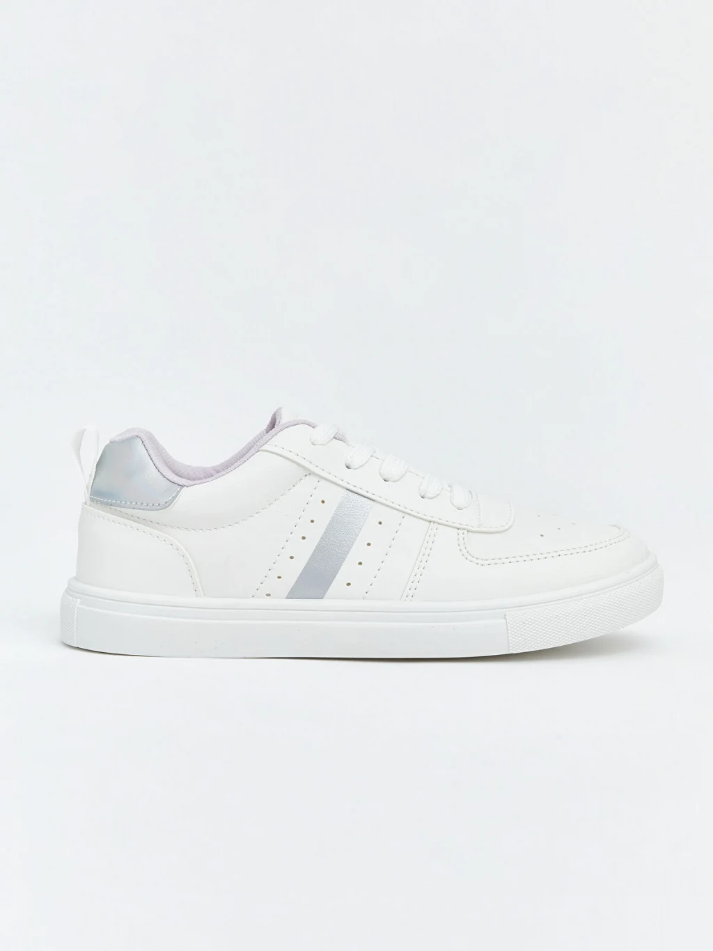Kız çocuk sneaker, bağcık kapamalıdır ve düz tabanlıdır. Burun kısmında delikli detayları ve yan tarafında şerit detayı bulunur.