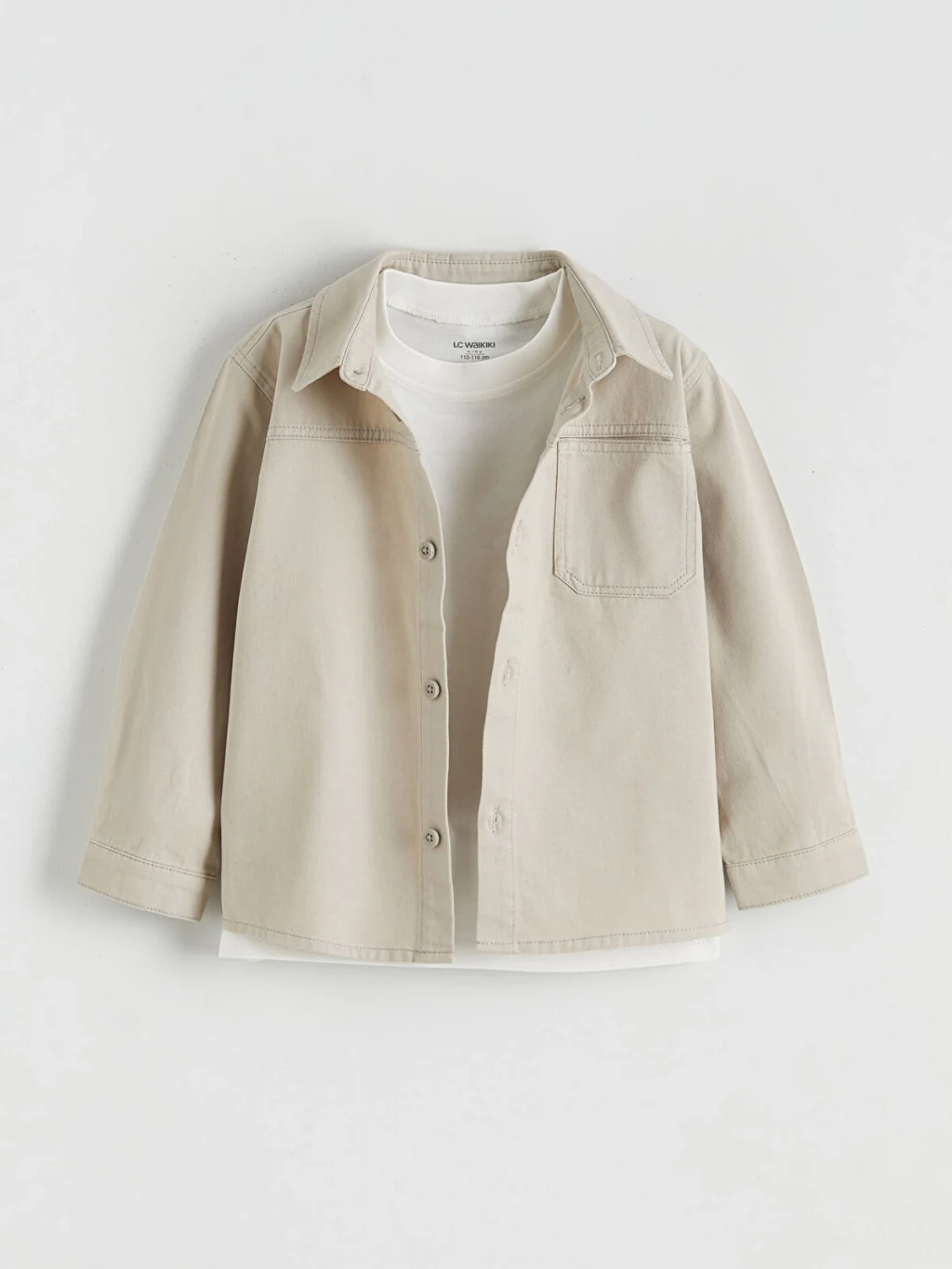 Erkek çocuk takım, bisiklet yaka tişört, uzun kollu gömlek ve pantolondan oluşur. %100 pamuklu gabardin kumaştan üretilmiştir.