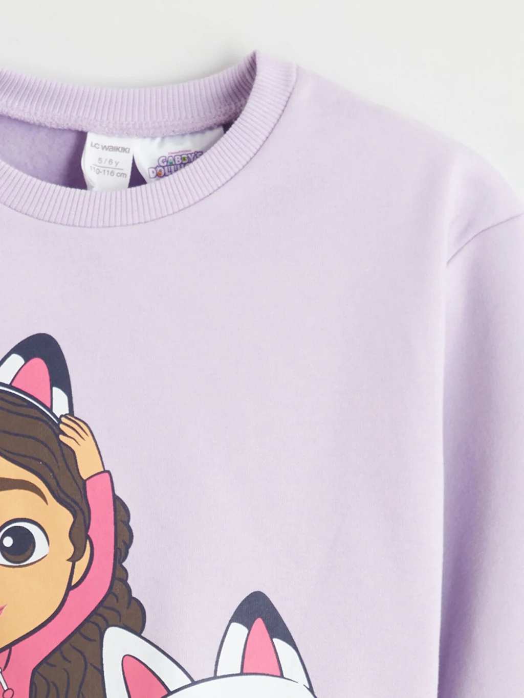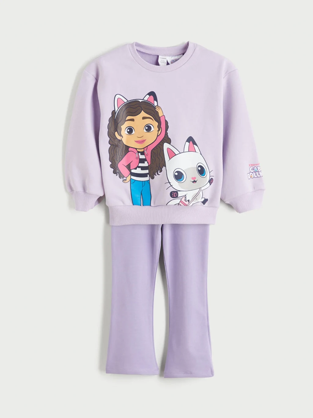Gabby's Dollhouse lisanslı kız çocuk takım; bisiklet yaka, baskılı sweatshirt ve İspanyol paça pantolondan oluşur. 3 iplik şardonlu kumaştır.
