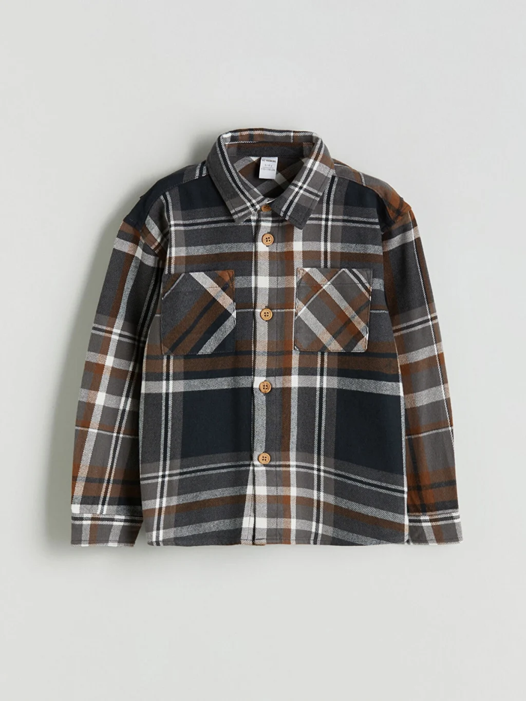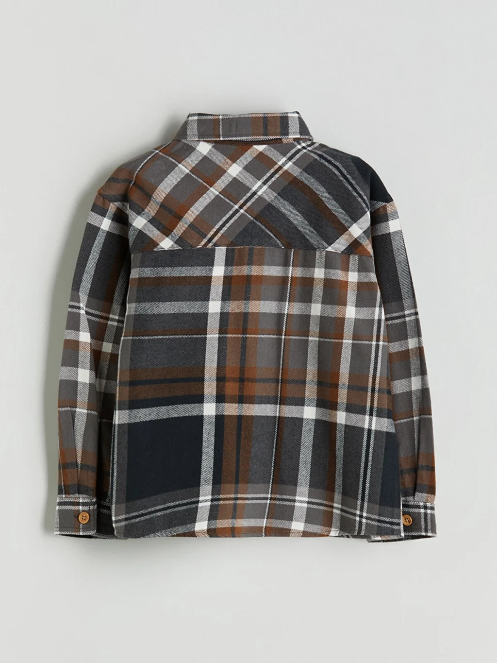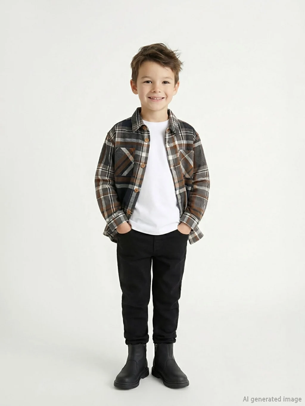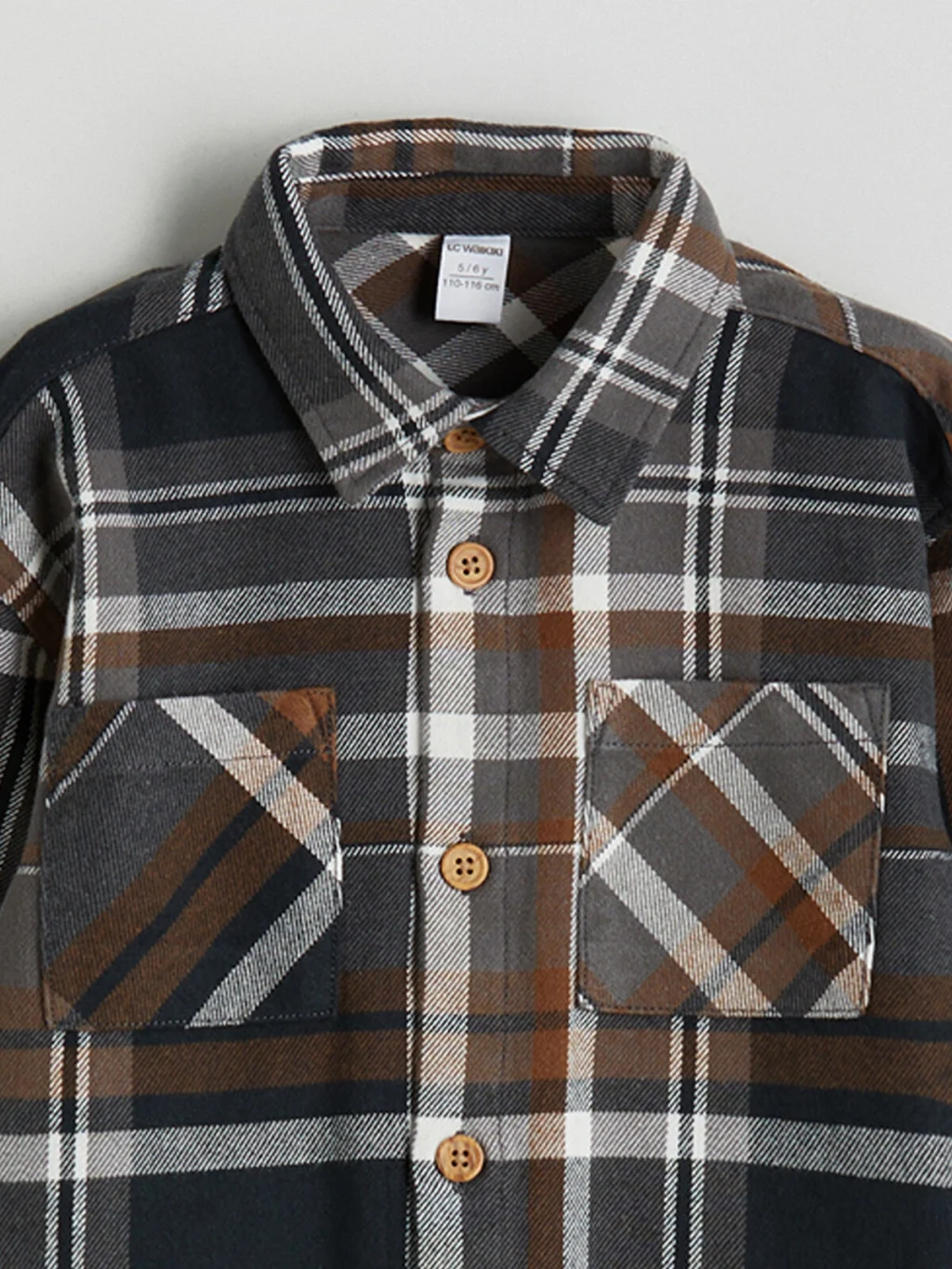 Ekose desenli erkek çocuk gömlek, flanel kumaştan üretilmiştir. Gömlek yakalı, uzun kollu ve önden düğme kapamalıdır. Göğsünde iki adet cebi bulunur.