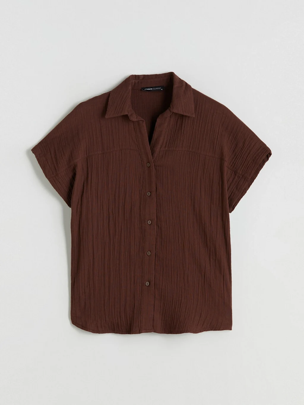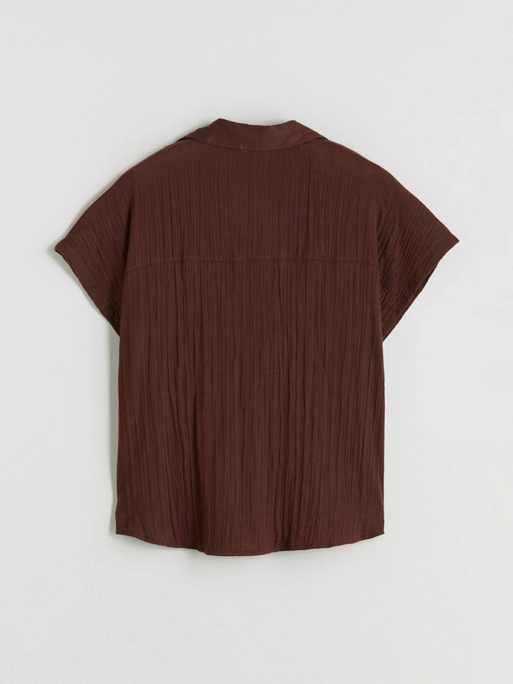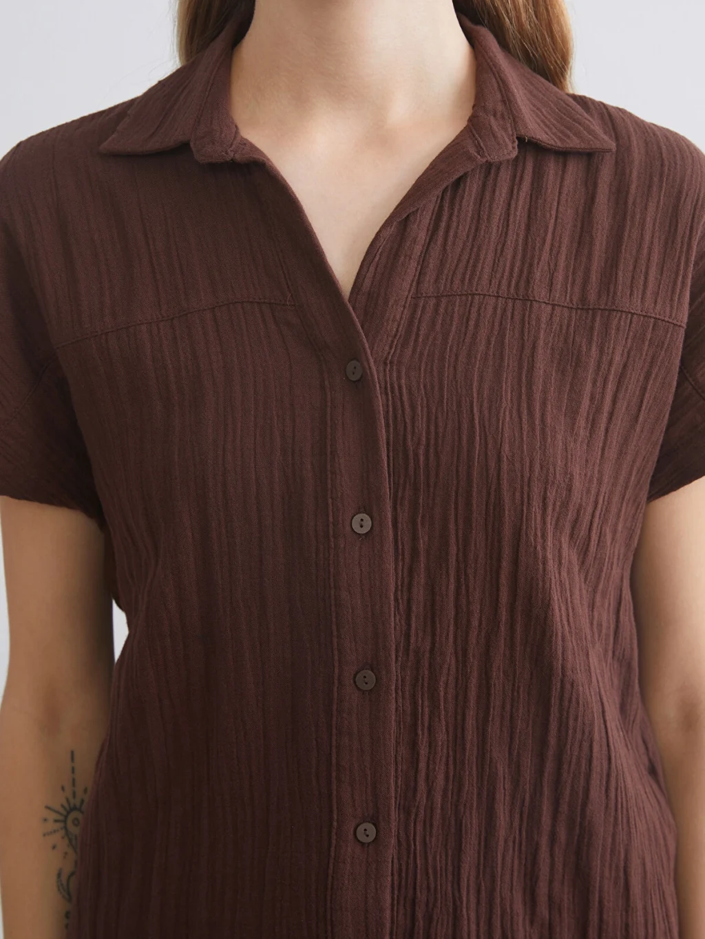 Gömlek yaka ve kısa kollu kadın gömlek, müslin kumaştan üretilmiştir. Önü düğme kapamalıdır.