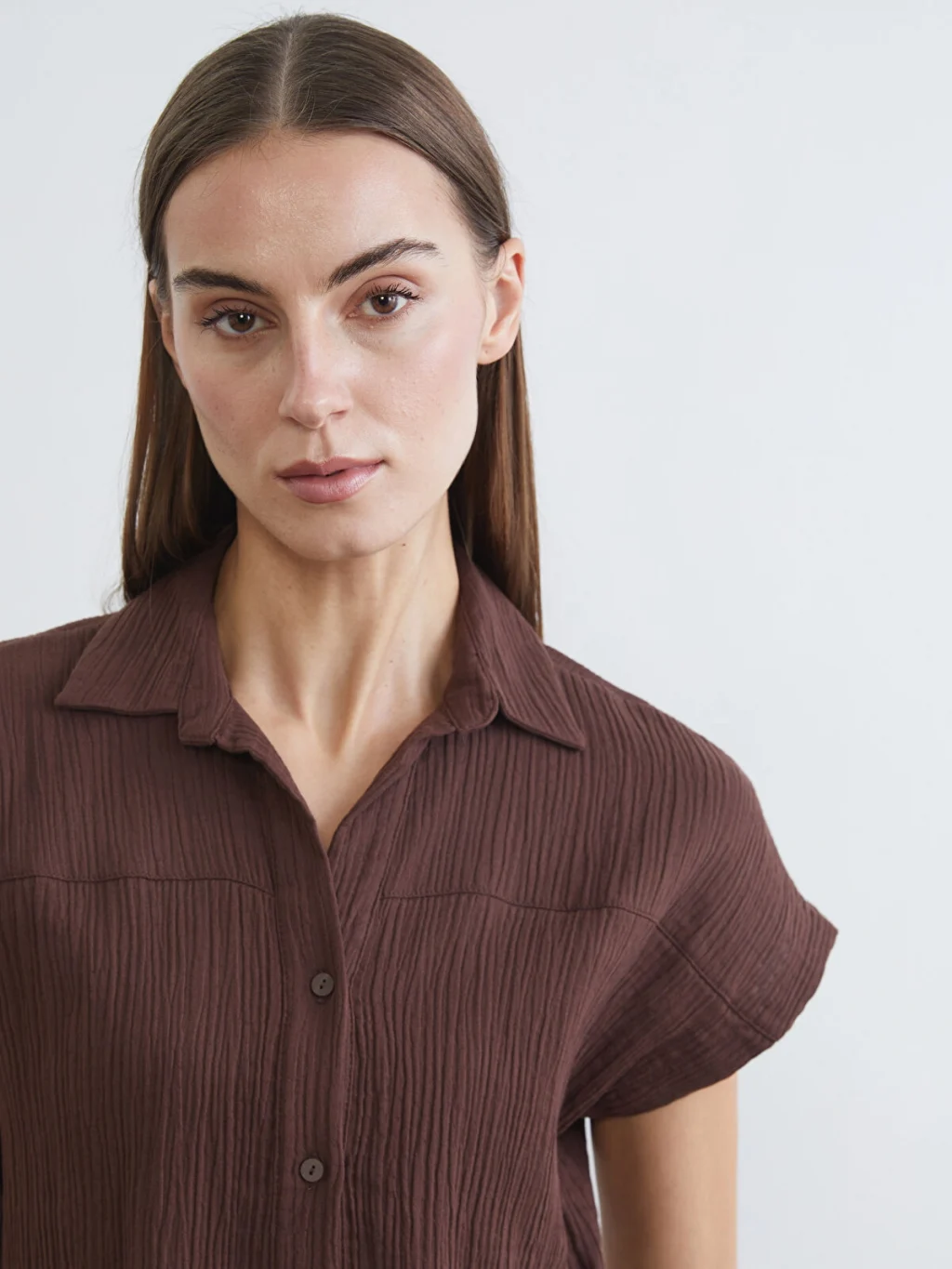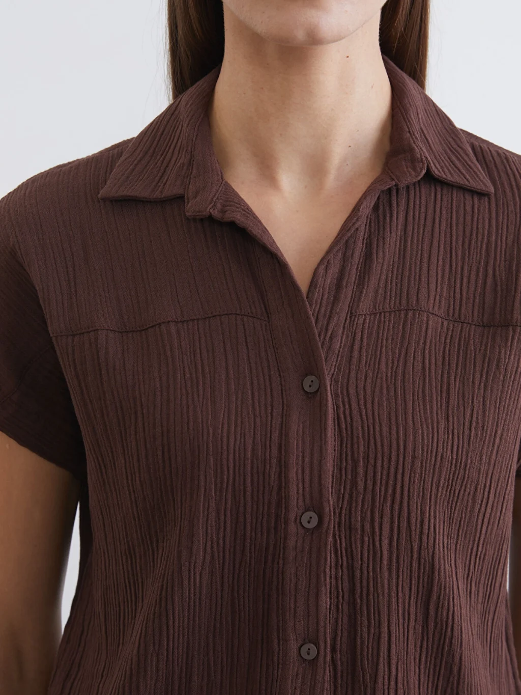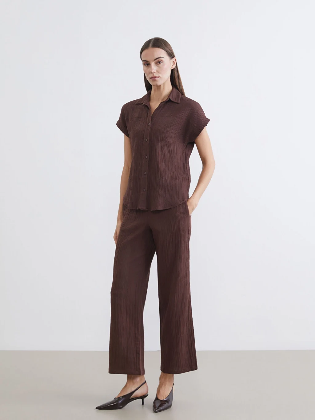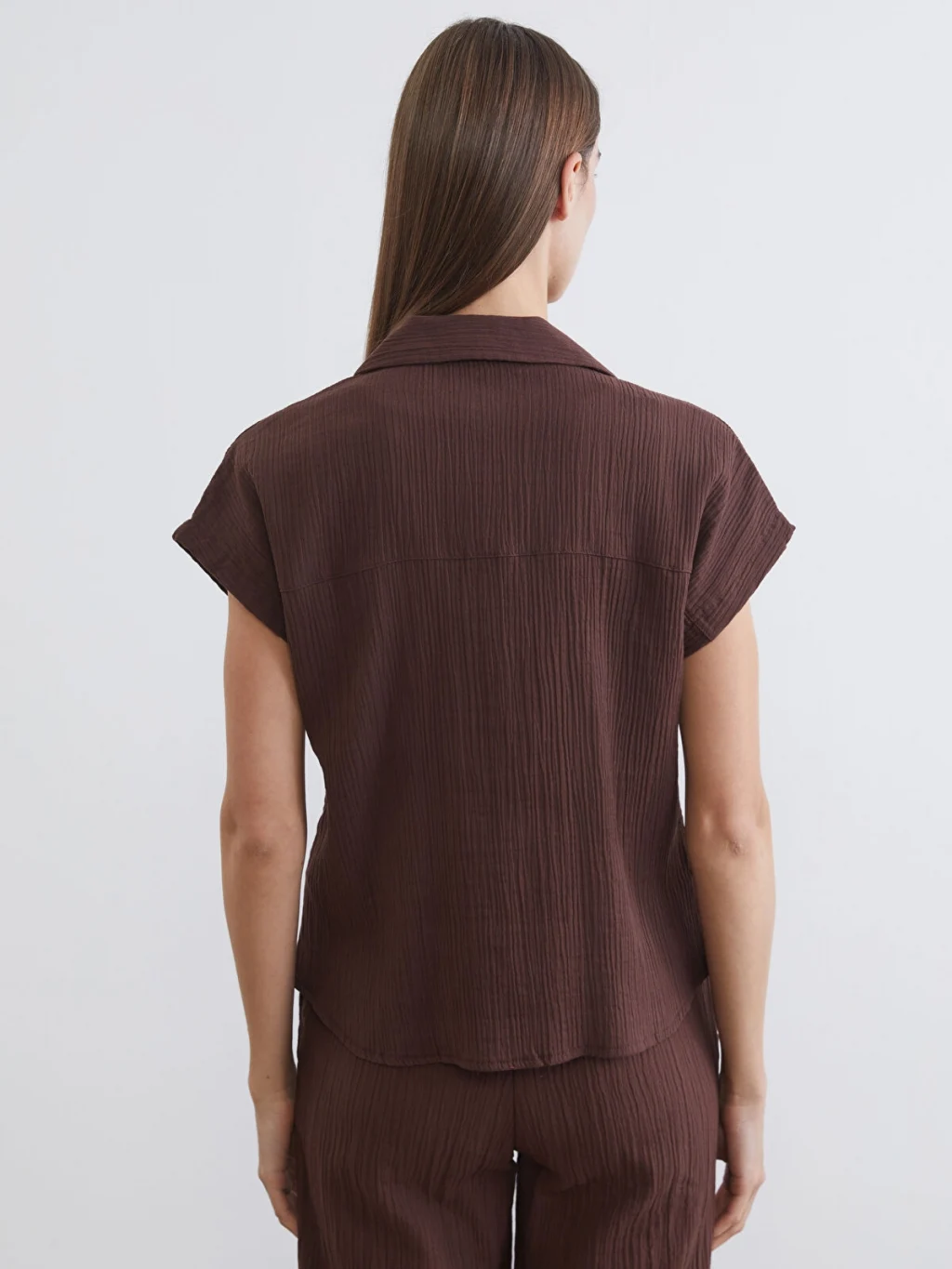 Gömlek yaka ve kısa kollu kadın gömlek, müslin kumaştan üretilmiştir. Önü düğme kapamalıdır.