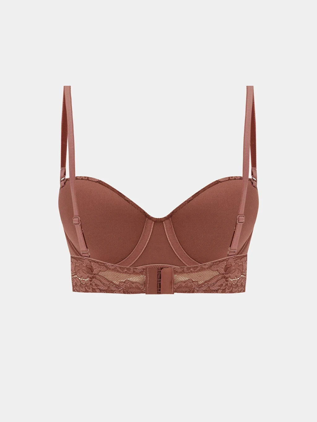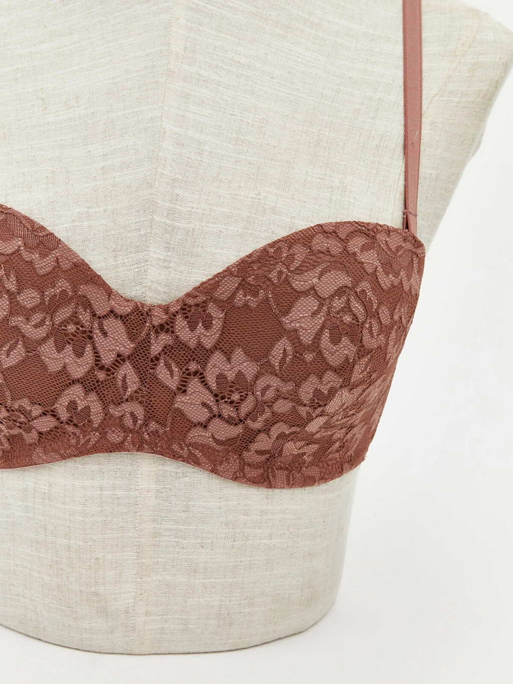 Çiçek desenli dantel kumaştan üretilen kadın straplez sütyen, ayarlanabilir ve çıkarılabilir askılıdır.