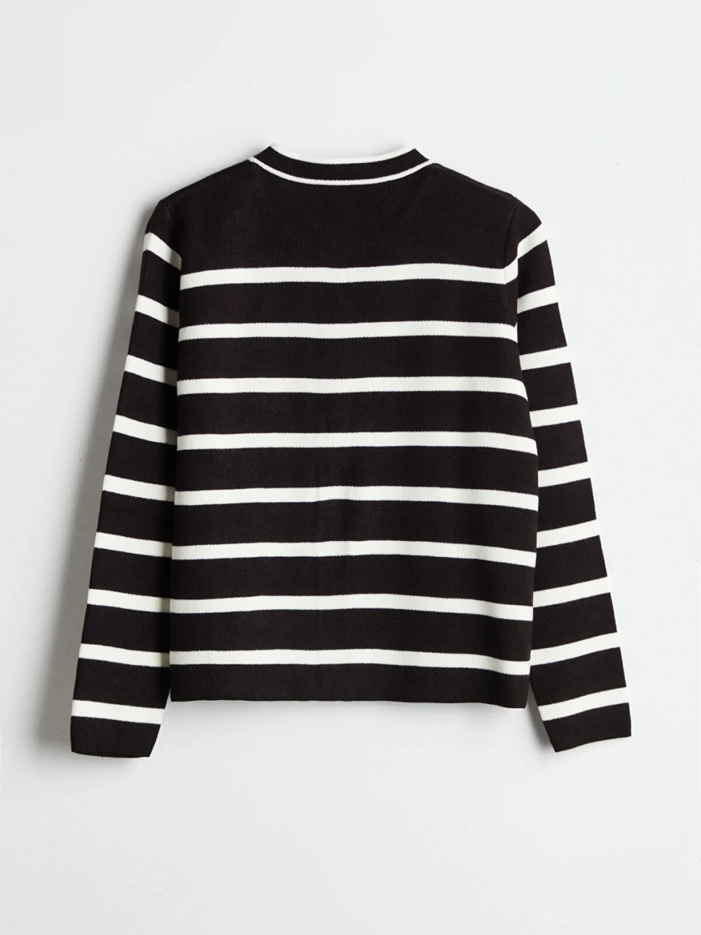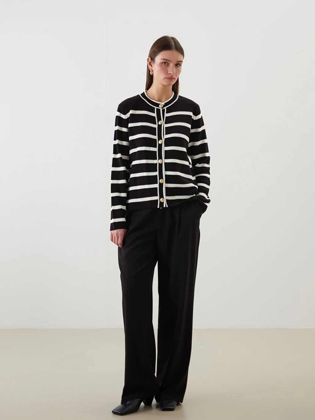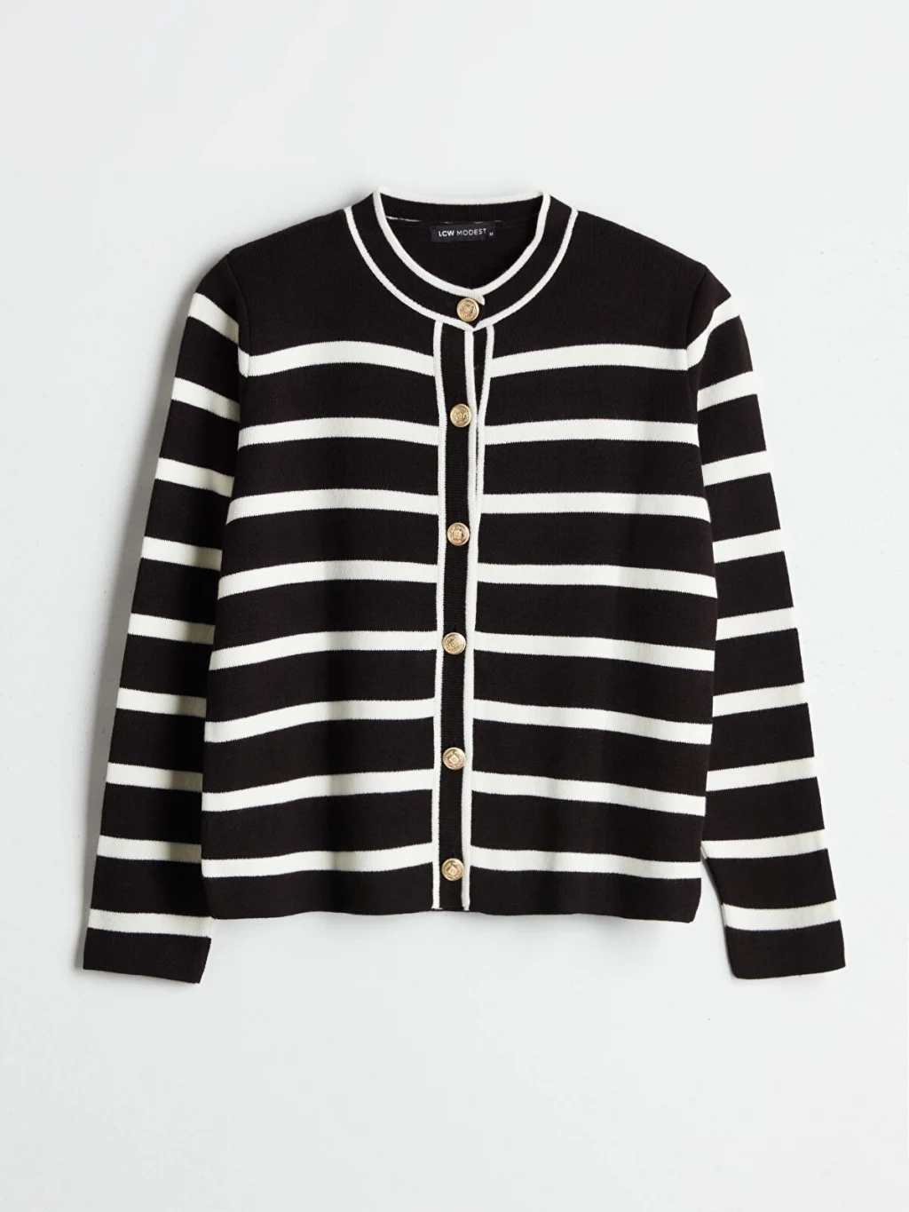 Bisiklet yaka uzun kollu kadın hırka, triko kumaştan üretilmiştir. Parlak düğme kapamalı tasarıma sahiptir.