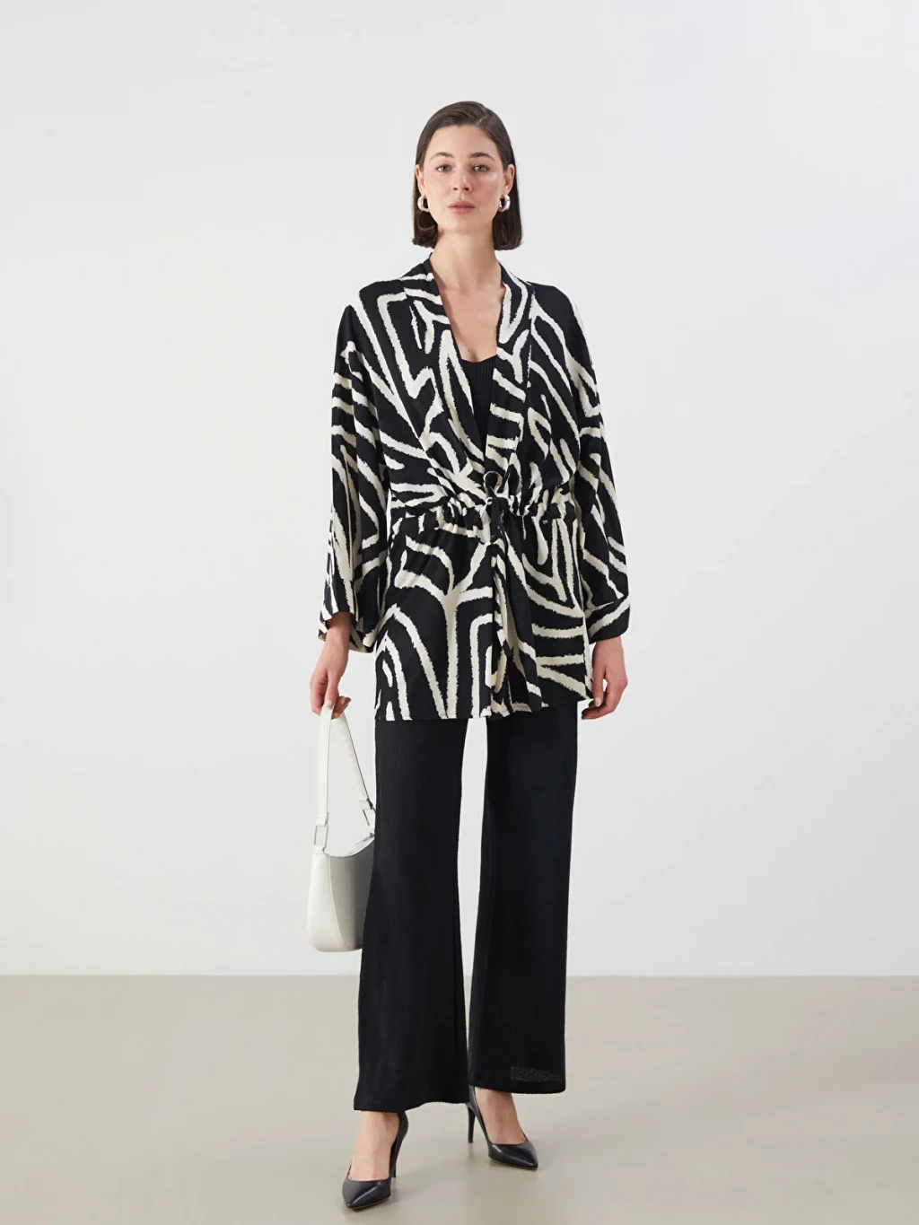 Şal yaka desenli kadın kimono, viskon kumaştan üretilmiştir. Beli kuşaklı tasarıma sahiptir.