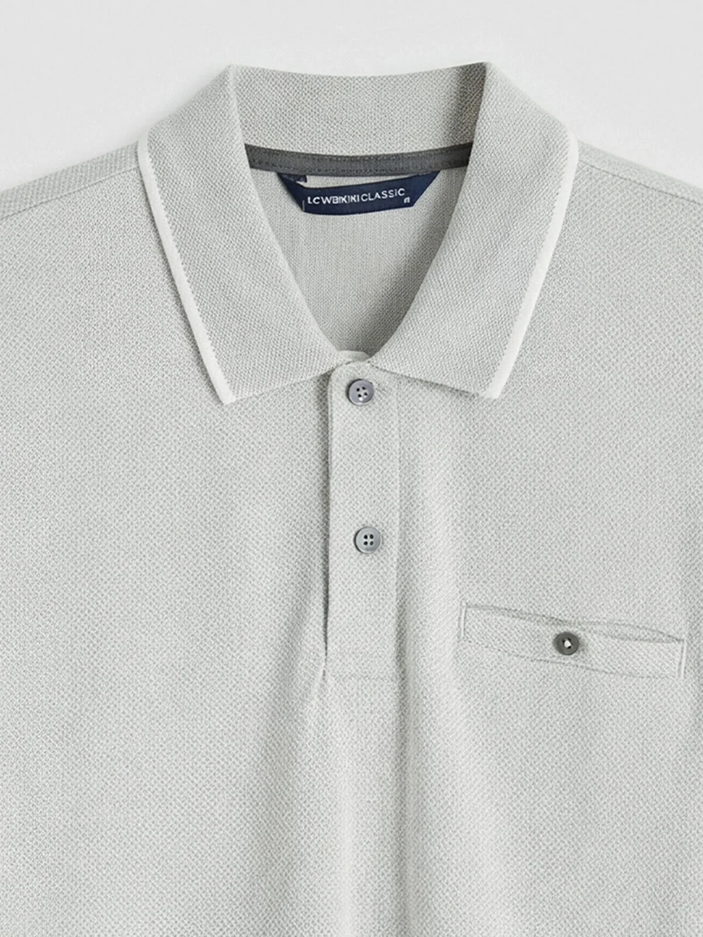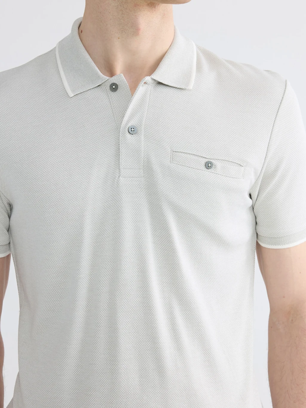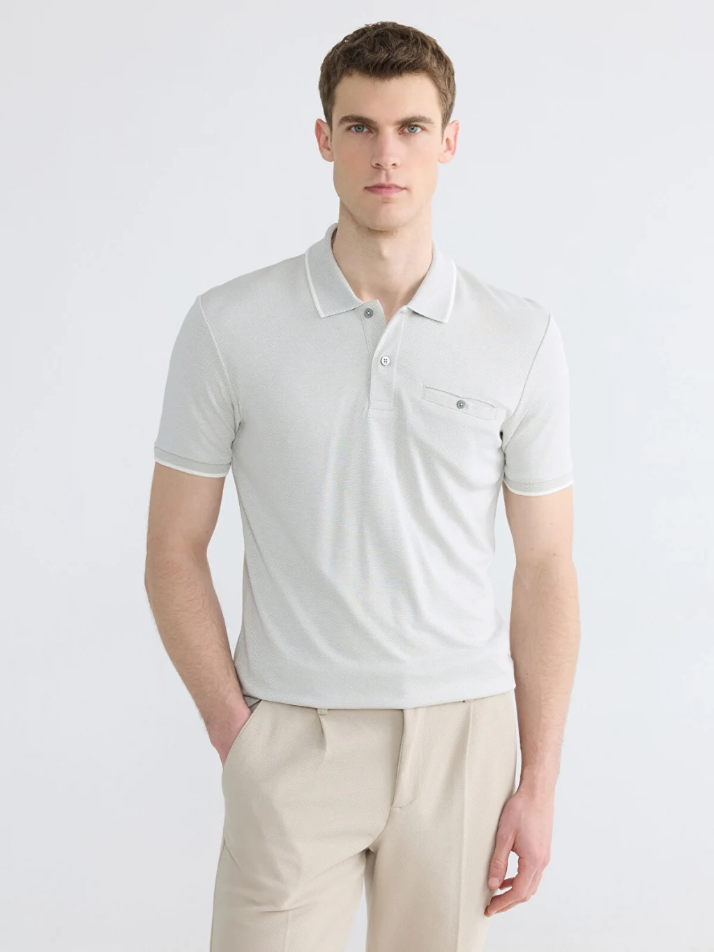 Polo yakalı ve kısa kollu erkek tişört, jakar kumaştan üretilmiştir. Düğme kapamalıdır ve tek cepli tasarıma sahiptir.