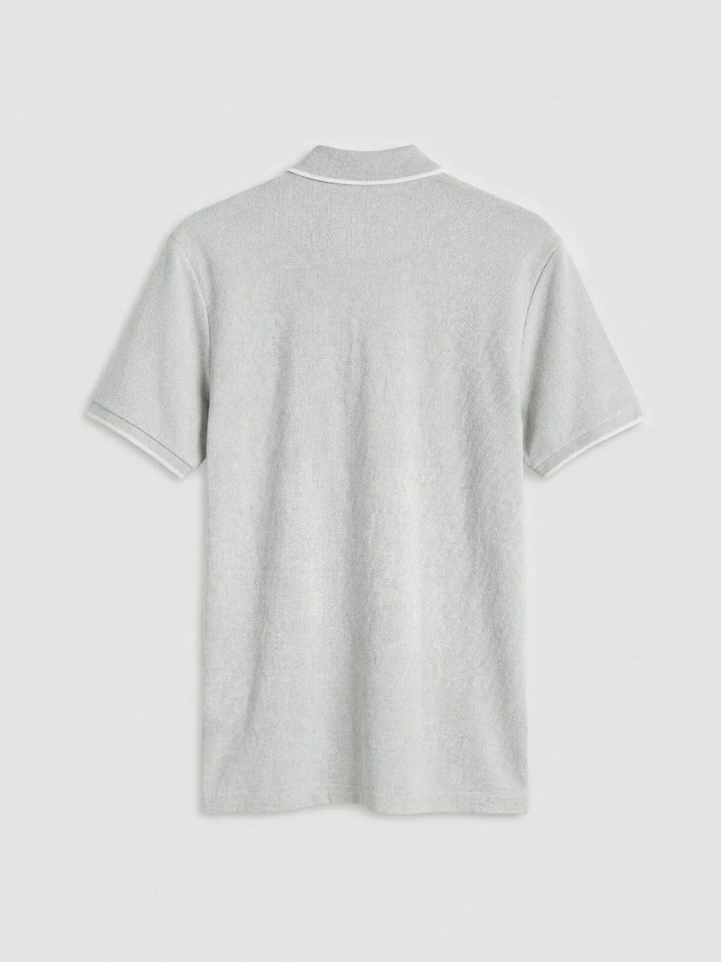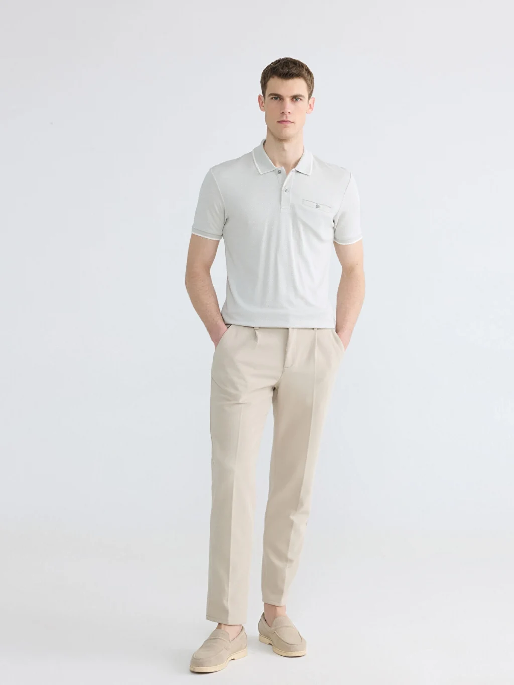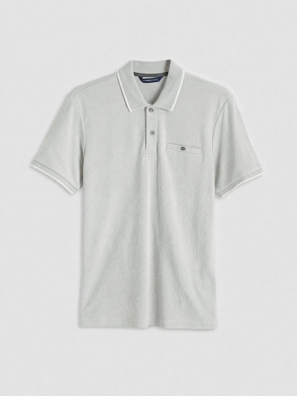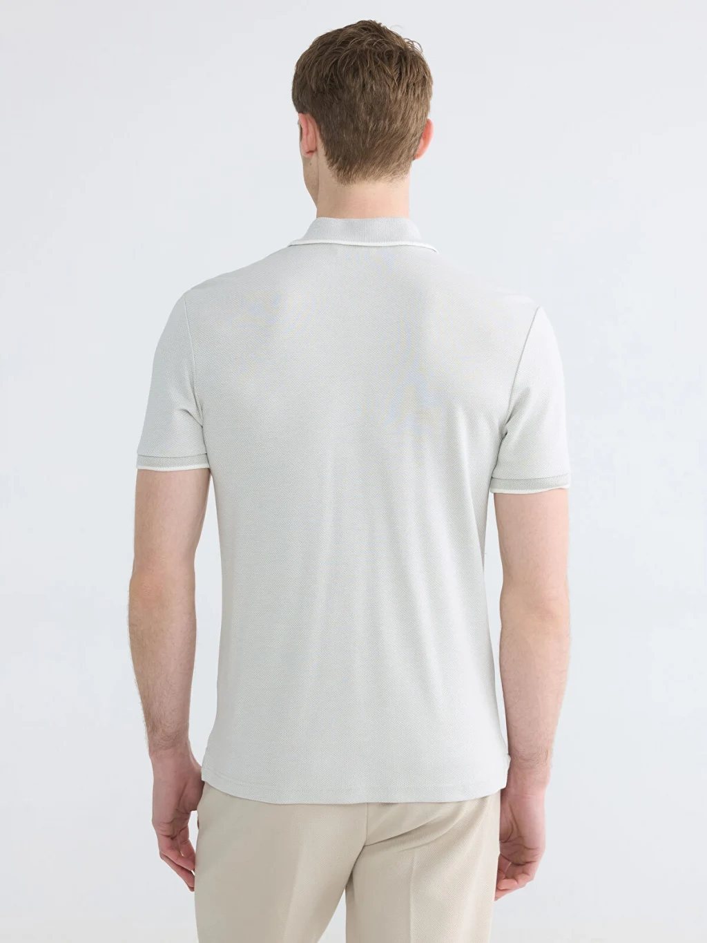 Polo yakalı ve kısa kollu erkek tişört, jakar kumaştan üretilmiştir. Düğme kapamalıdır ve tek cepli tasarıma sahiptir.