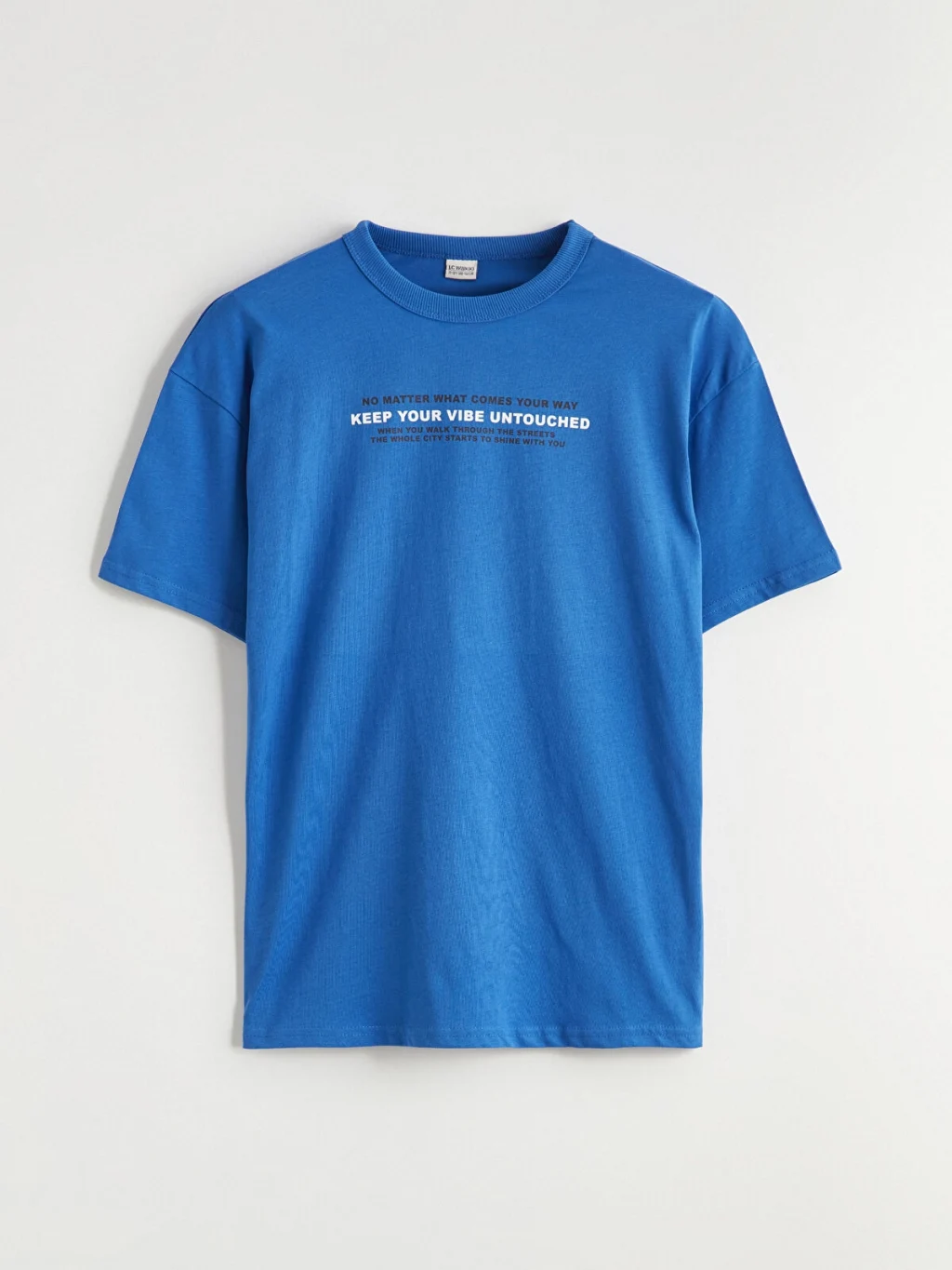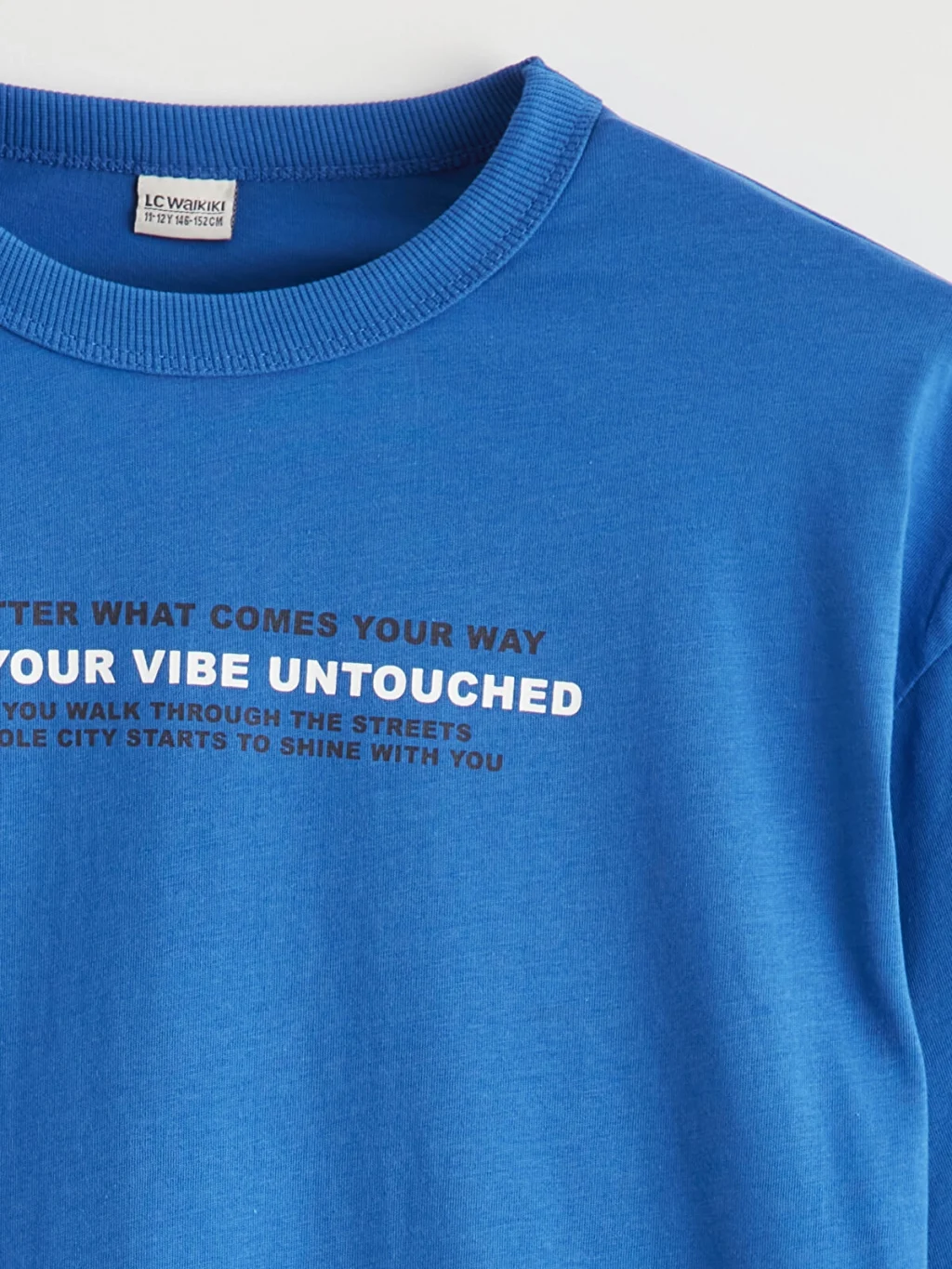 Bisiklet yaka ve kısa kollu erkek çocuk tişört, %100 Pamuk penye kumaştan üretilmiştir ve önü slogan baskılıdır.