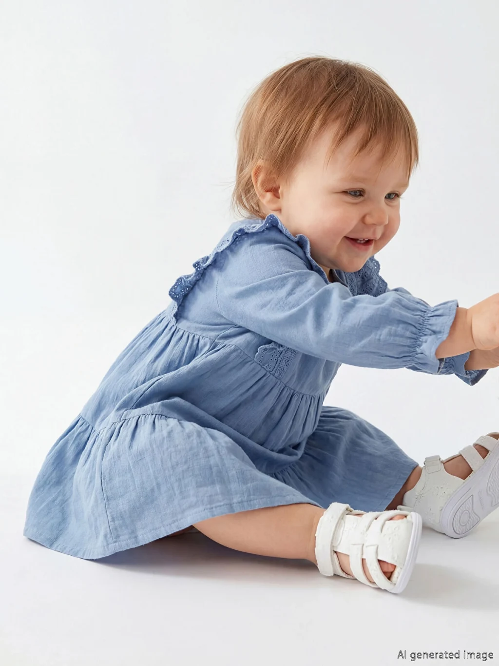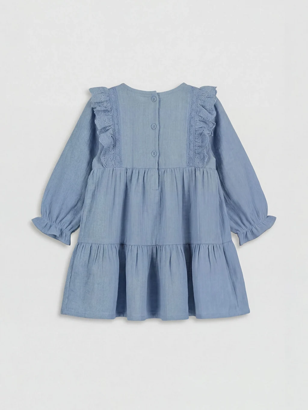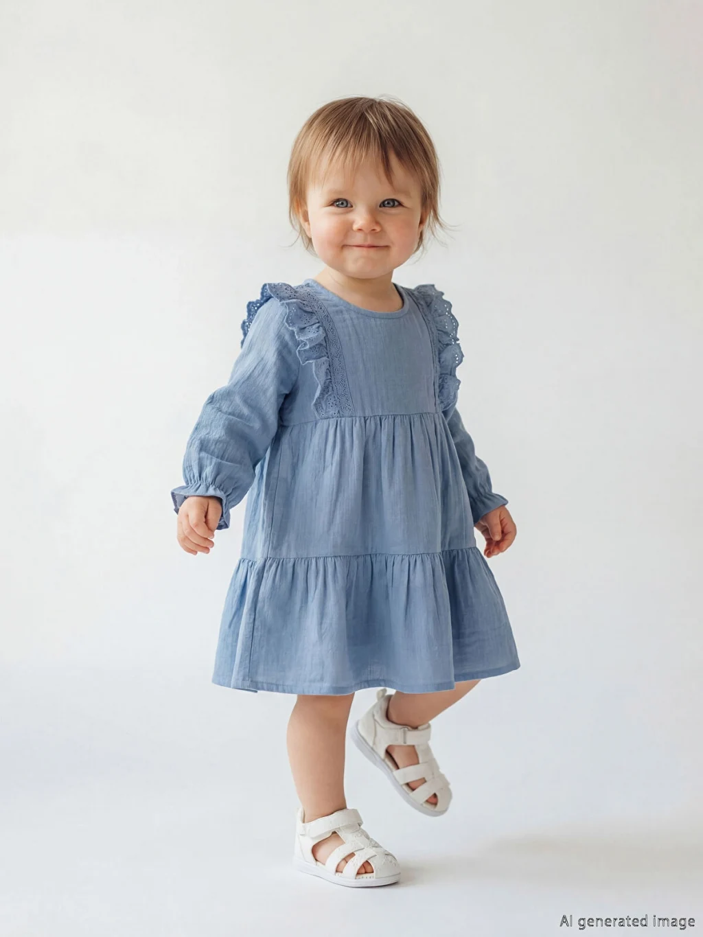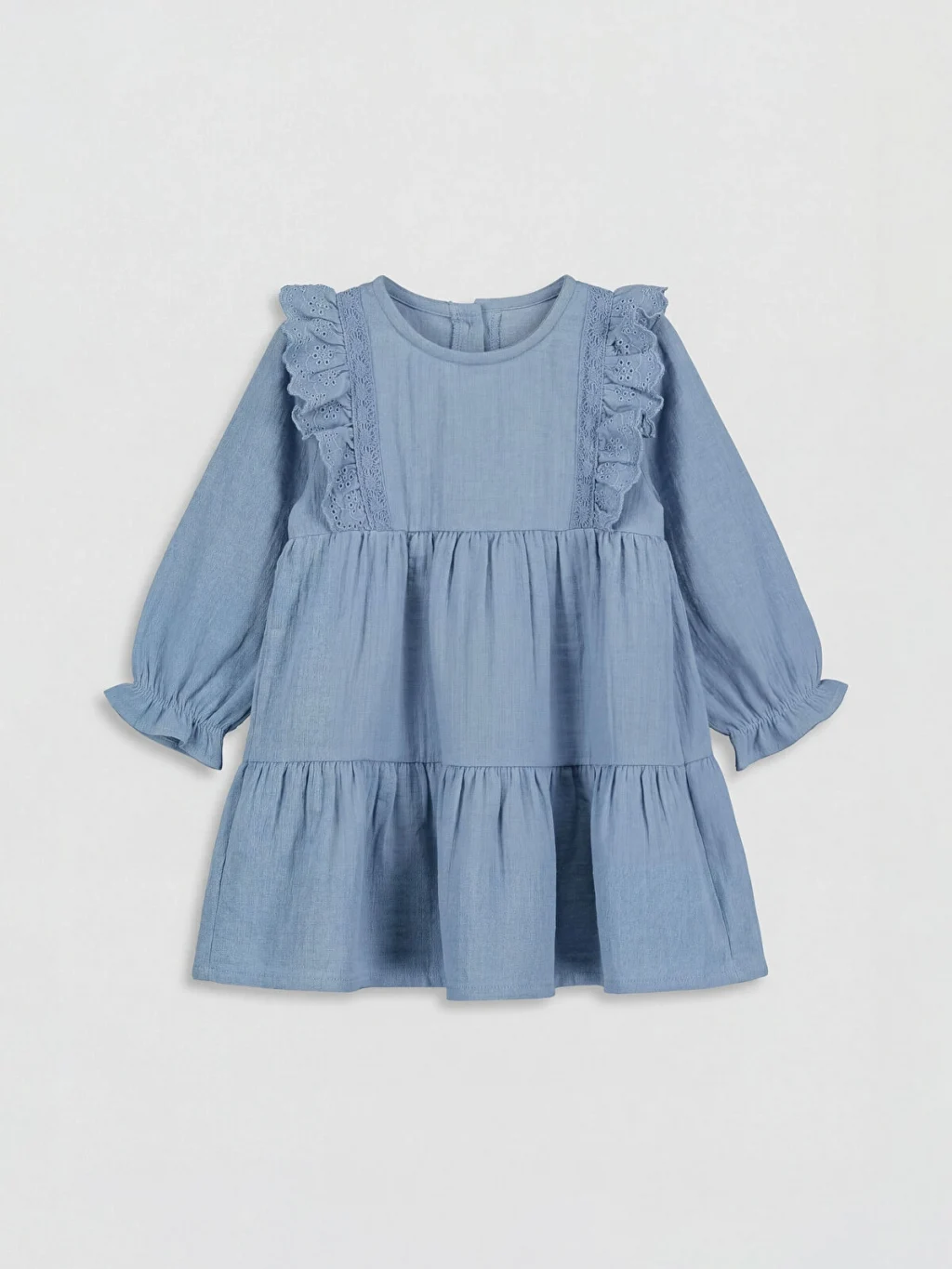 Kız bebek elbise, %100 pamuk müslin kumaştan üretilmiştir. Bisiklet yakalı, uzun kollu, omuzları fırfır detaylı ve arkadan düğme kapamalıdır.