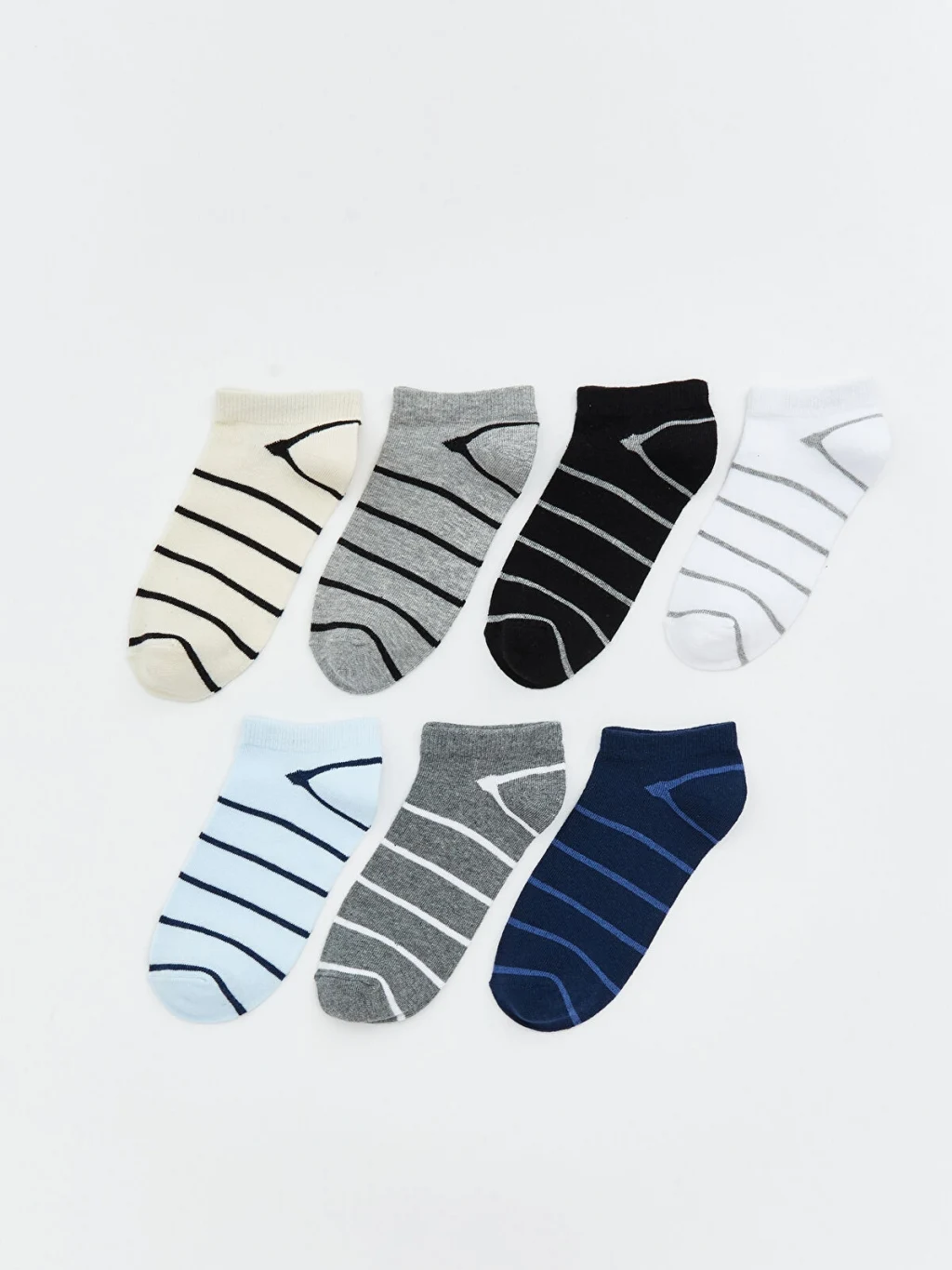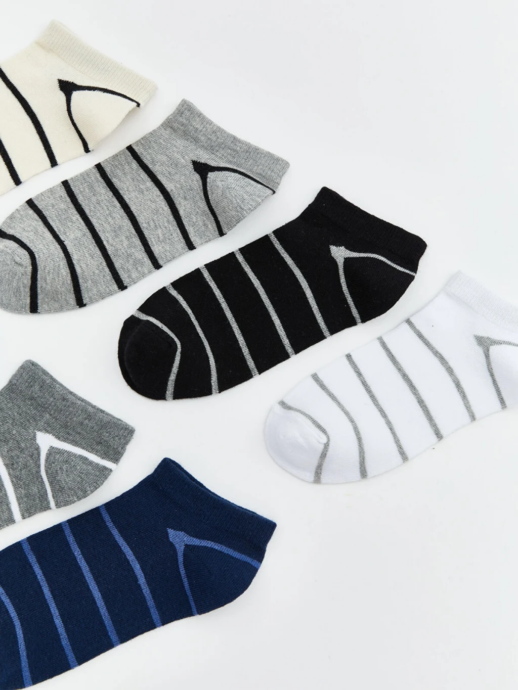 Çizgili desenli erkek çocuk patik çorap, kısa konçlu yapısı ile bilek hizasında bir bitişe sahiptir.