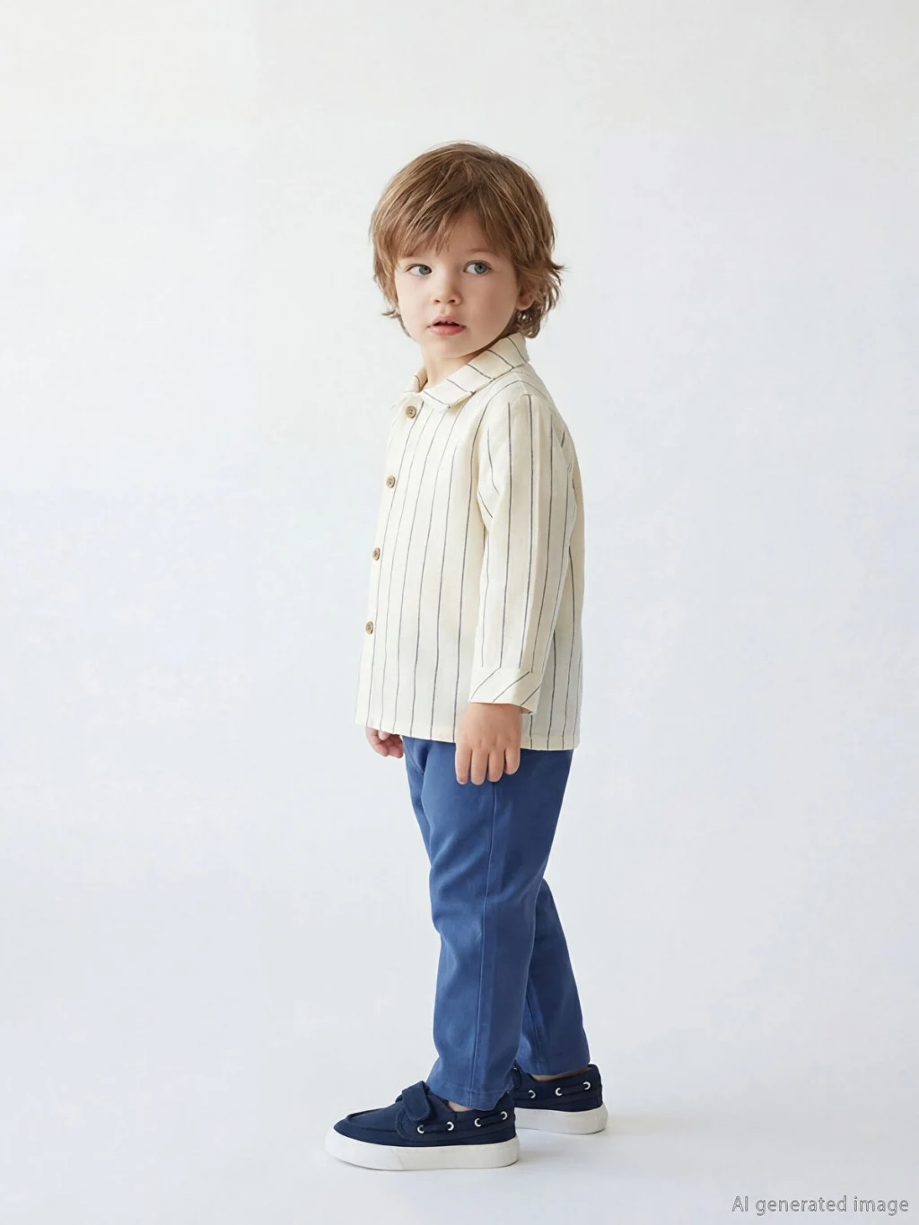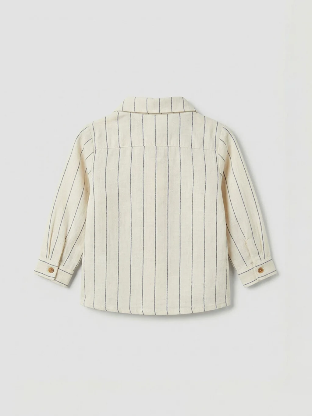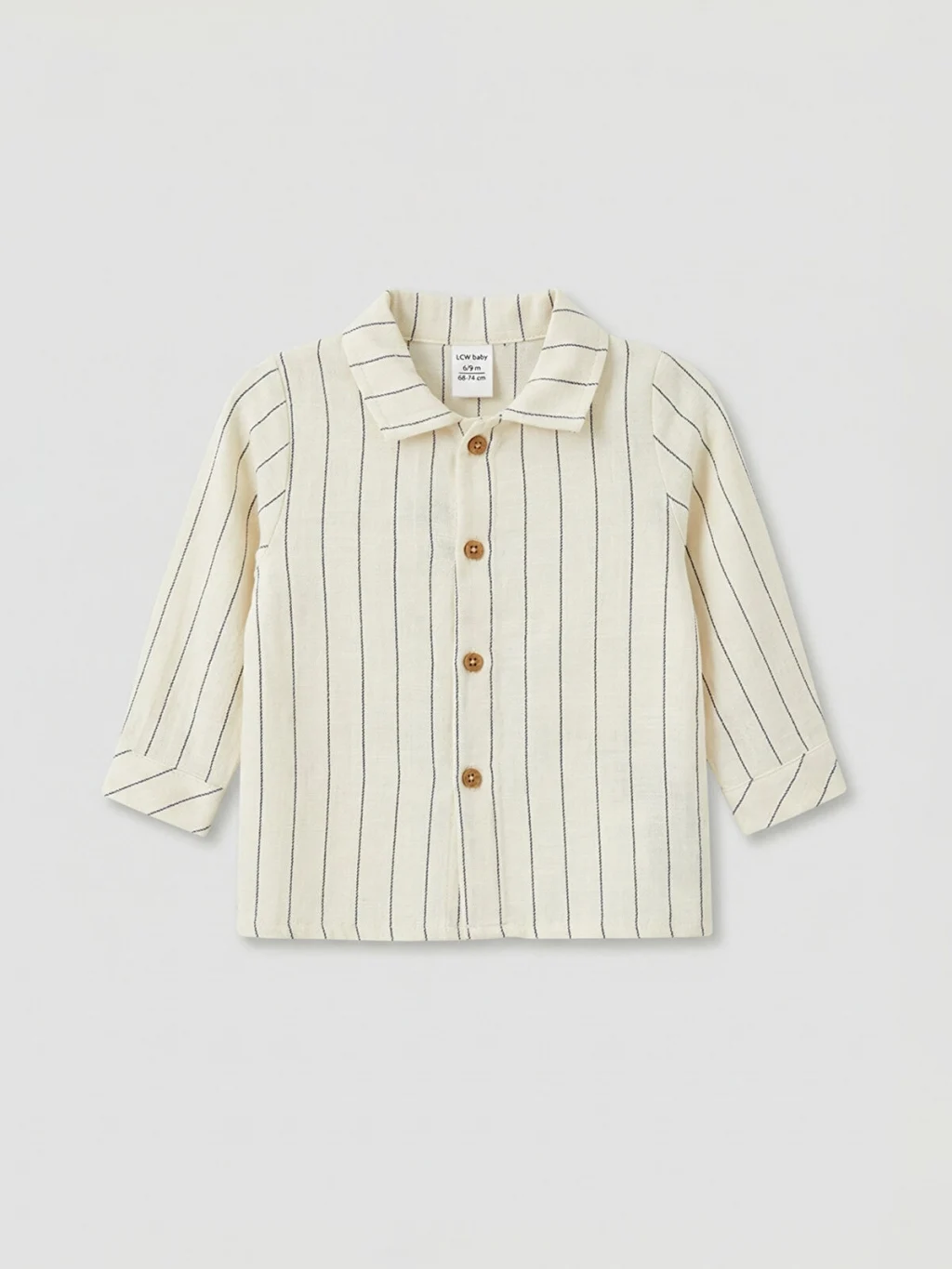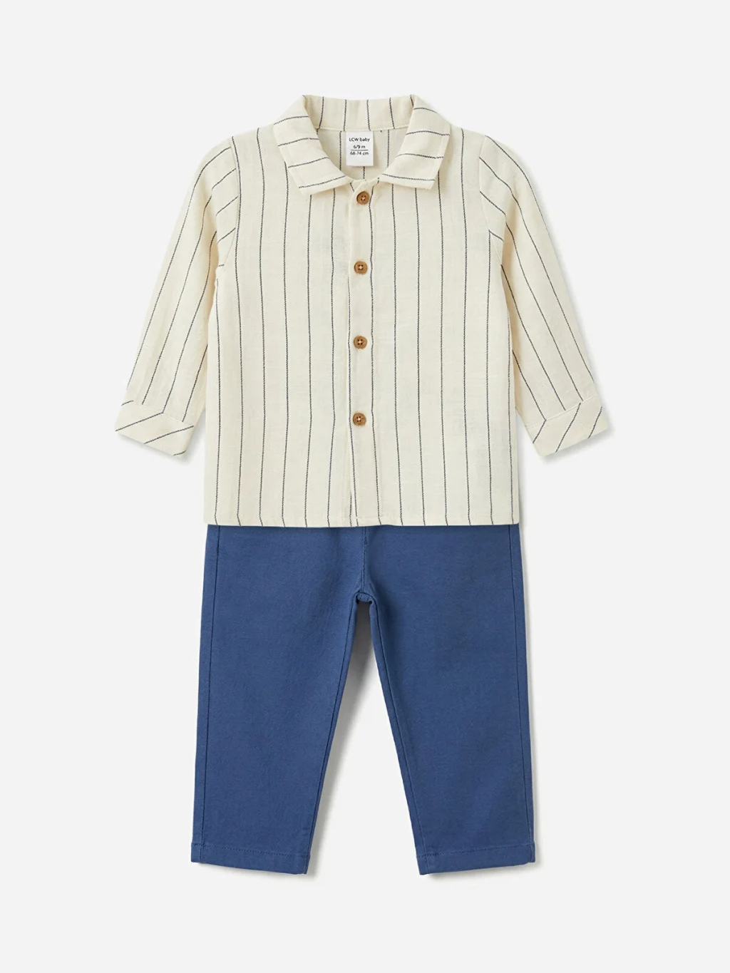 Erkek bebek takım, çizgili, uzun kollu, yakalı ve düğme kapamalı gömlek ile desensiz pantolondan oluşur.