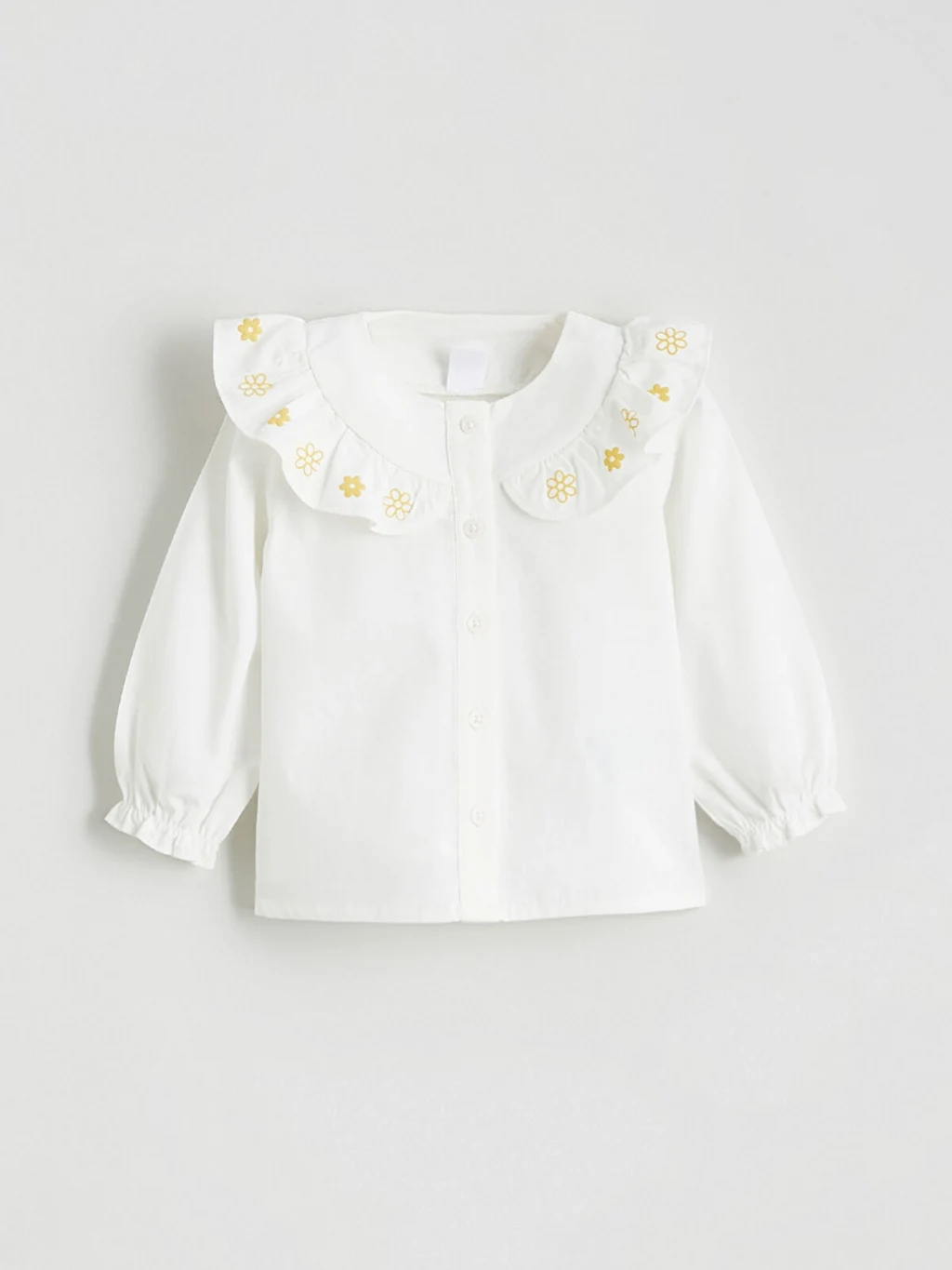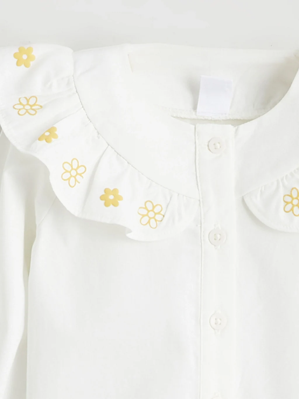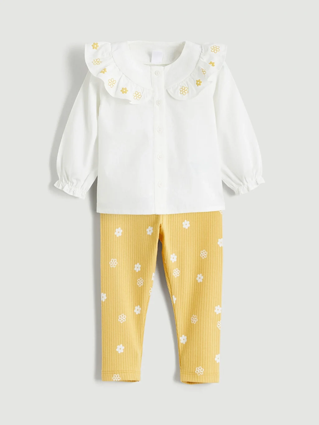 Kız bebek takım, fırfırlı ve nakış işlemeli bebe yakalı, uzun kollu, düğme kapamalı poplin gömlek ve desenli tayttan oluşur. %100 pamuktur.