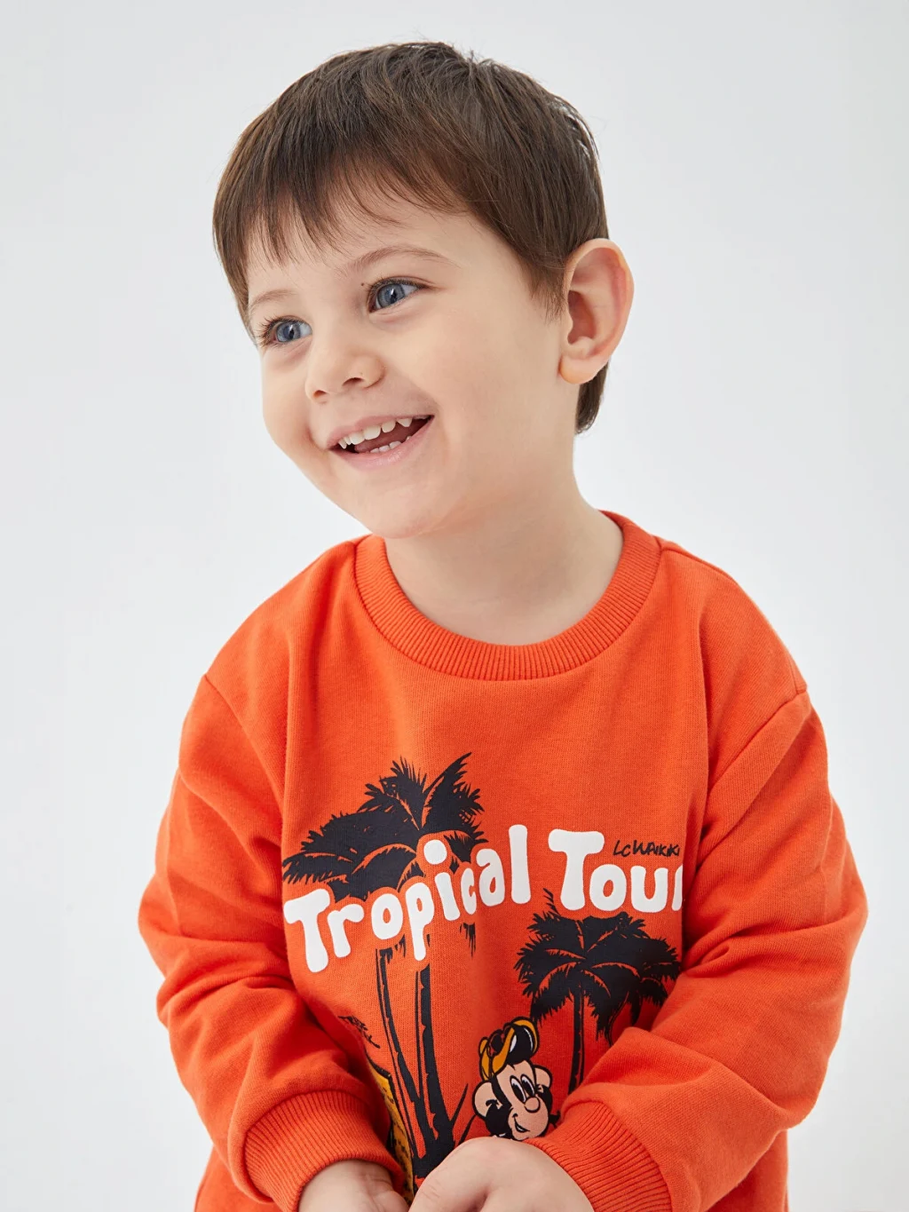 Bisiklet yaka sweatshirt, nostaljik maymun baskılı tasarımıyla bebeklerin kombinlerine hem rahat, hem de stil sahibi bir seçenek sunar.