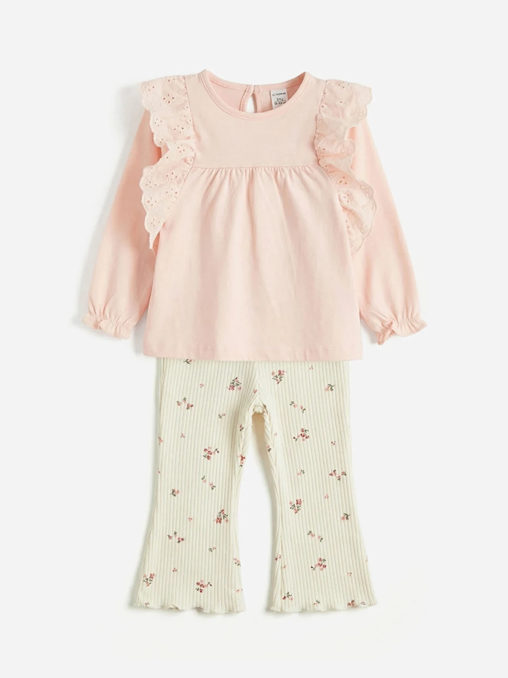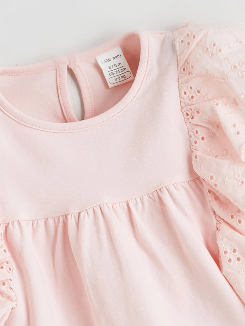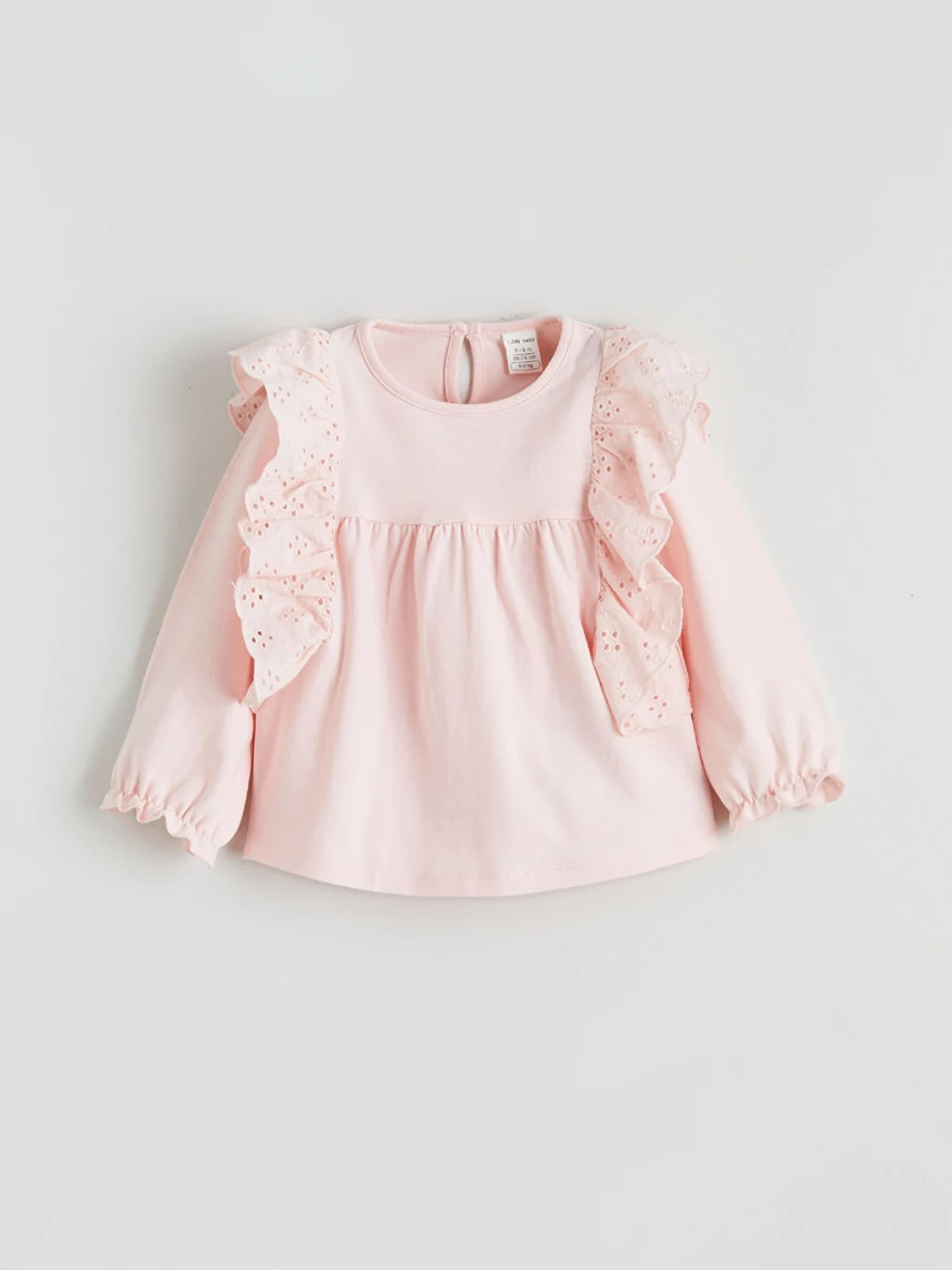 Kız bebek için bisiklet yaka, uzun kollu bluz. Omuzları brode detaylı fırfırlı, beli büzgülü ve sırtı düğme kapamalıdır.