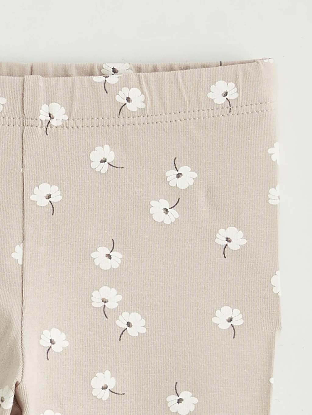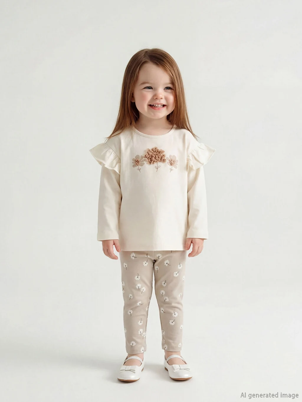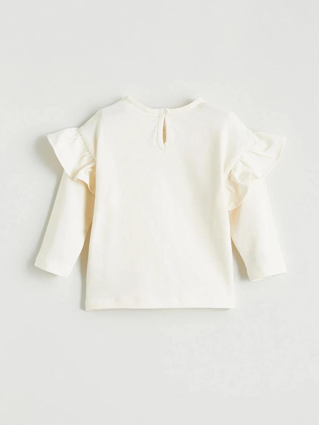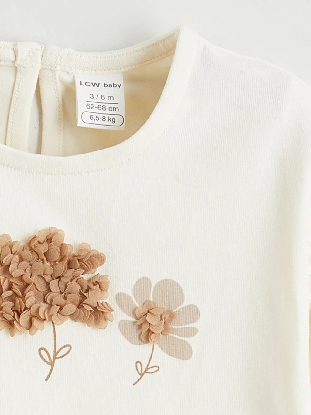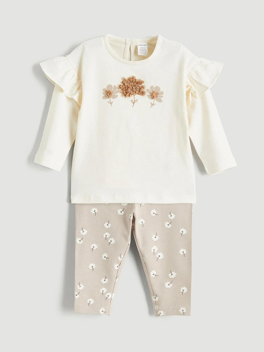 Kız bebek takım; bisiklet yaka, uzun kollu, omuzları volanlı, enseden düğme kapamalı üst ve çiçek desenli tayttan oluşur. Yüksek pamuk içerir.