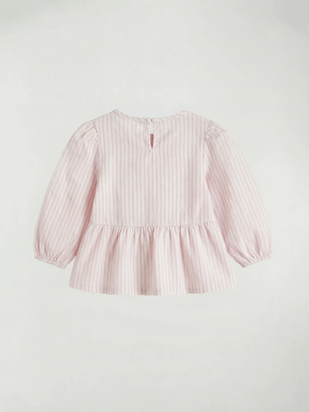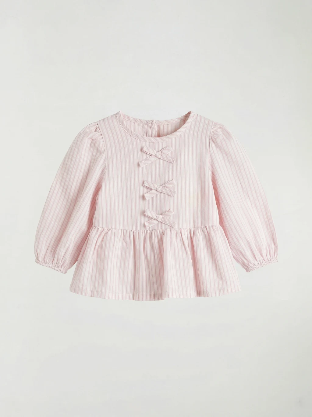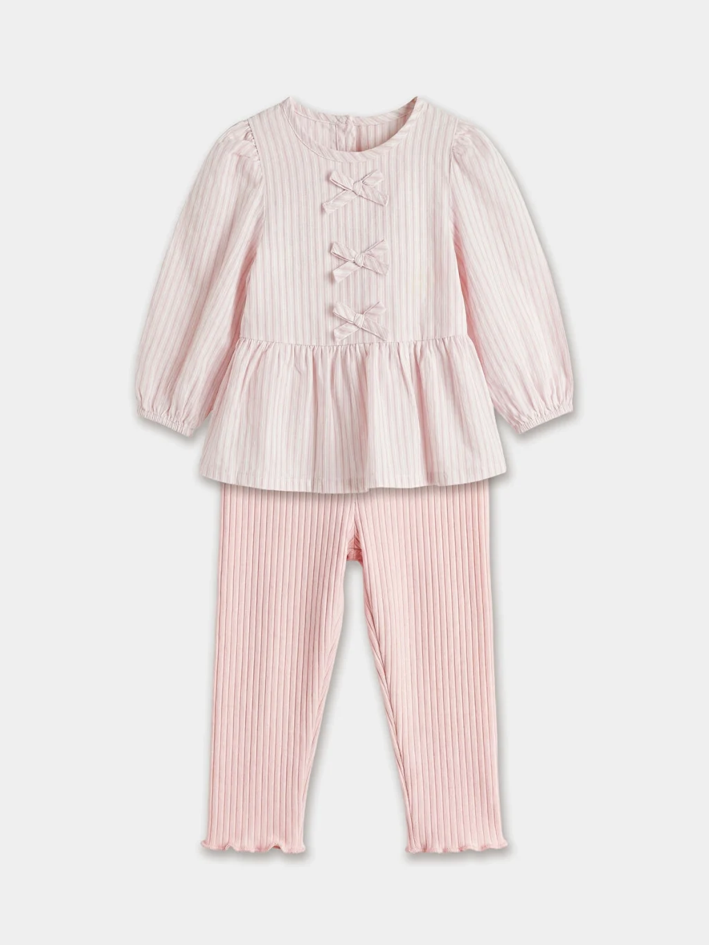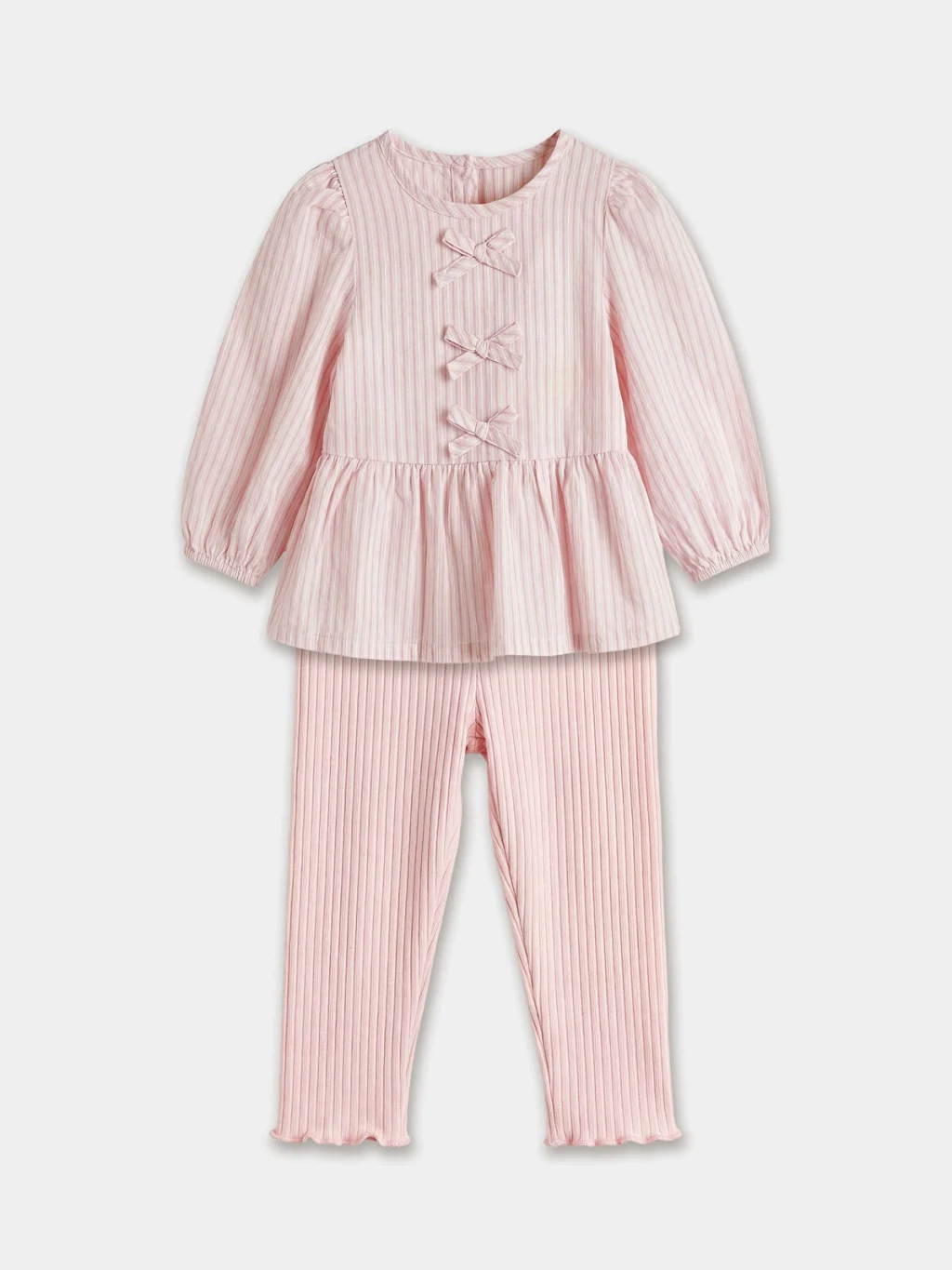 Kız bebek takım, çizgili desenli, bisiklet yaka, uzun kollu ve fiyonk detaylı poplin üst ile fitilli tayttan oluşur.